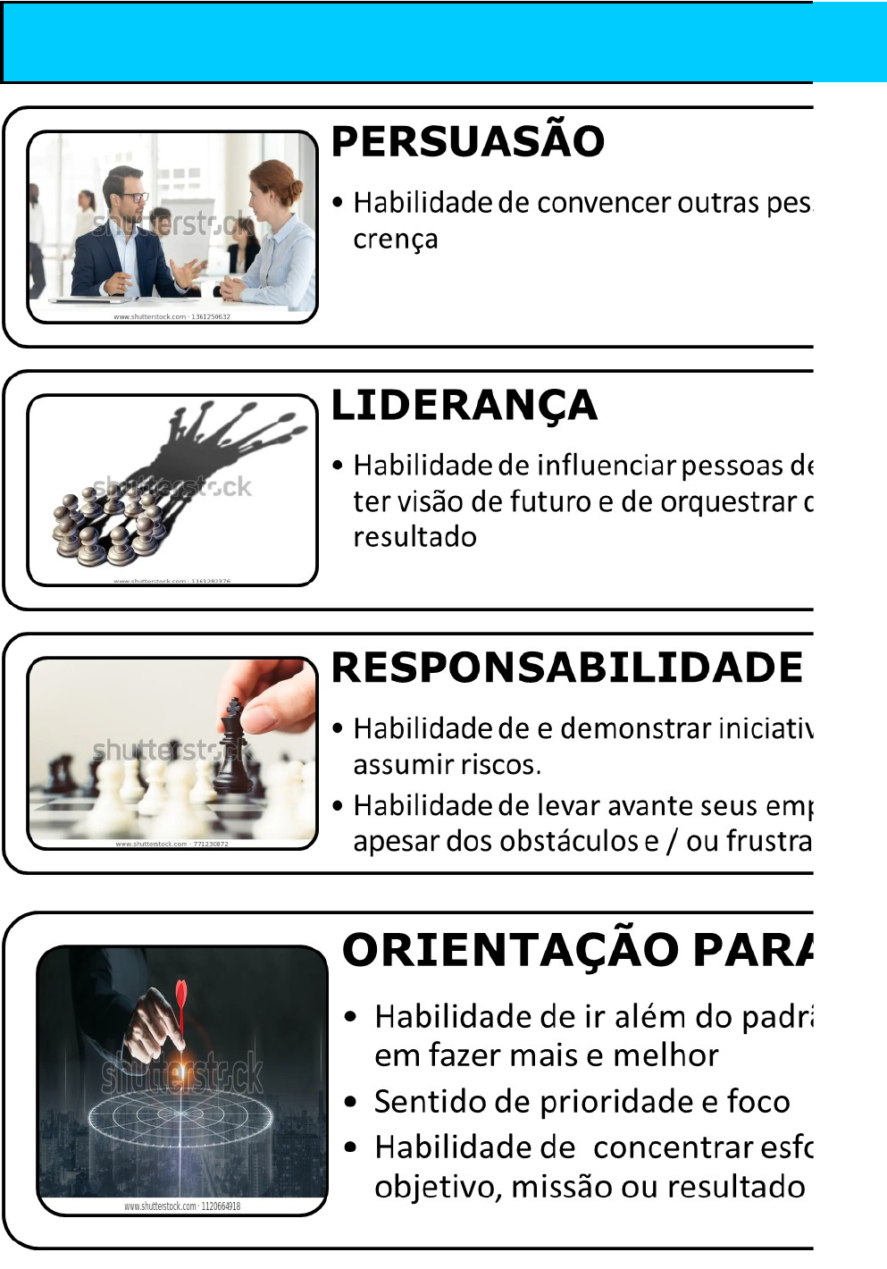 COMPETÊNCIAS DO EMPREENDEDOR AS 5 HABILIDADES DO EMPREENDEDOR - TARGET TRAINING INTERNATIONAL TTI MAPA PESSOAL DISC INTENSIDADE DE CADA PERFIL PRINCIPAIS COMPETÊNCIAS DE CADA PERFIL NECESSIDADES FATORES DE AFASTAMENTO DOMINANCIA D Auto confiante Competição / Vencer Morosidade EB MB B A MA EA Energético e dominante Resolver problemas do seu jeito Ineficiência Medroso Acomodado Harmonioso Aprecia desafios Audacioso Arrogante Aceita e aprecia desafios Liberdade para agir individualmente Frustrado Submisso Avesso a riscos Autoconfiante Realizado Opressor Competitivo e audacioso Reconhecimento por suas ideias Acomodado Tímido Cooperador Empreendedor Generalista Independente Destemido e corajoso Controle das próprias atividades Baixa autoconfiança Omite opinião Agradável Individualista Agressivo Tirano I Comunicativo Reconhecimento social Intolerância Persuasivo Símbolos de status e prestigio Desarmonia INFLUÊNCIA Entusiasmado Aceitação social Desprestígio EB MB B A MA EA Otimista Fazer parte da equipe Confrontos Retraído Imaginativo Analítico Persuasivo Muito extrovertido Superficial Se relaciona com facilidade Oportunidade para "vender" a si mesmo Conflitos Fechado Sensível Pensativo Empolgado Idealista Impaciente com o que não gosta S Estável Ambiente de trabalho estável Impaciência Distante Ofende-se facilmente Reservado Otimista Flexível Inconveniente Paciente Segurança e reconhecimento por tempo de casa Intolerância Antissocial Cuidadoso Comunicativo Calmo Não sofrer pressão Insegurança Ritmo constante Apoio ao trabalhar em equipe Falta de reconhecimento ESTABILIDADE Conservador Não ter que mudar prioridades EB MB B A MA EA C Preciso Conhecimento específico do trabalho Indisciplina Agressivo Nervoso Impaciente Resolvido Devagar Ritmo Muito lento Atento a detalhes Compreensão exata das regras Falta de comprometimento Arrogante Ritmo rápido Incansável Paciente Tranquilo Indiferente Organizado Tempo para estudar e treinar Desorganização Explosivo Impaciente Intenso Calmo Estável Passivo Diligente Ver o produto acabado Pressão Pouca paciência Tenso Senso de urgência Não aprecia mudanças Rotineiro Sarcástico Conservador Reconhecimento por um trabalho sem erros CONFORMIDADE EB MB B A MA EA Indisciplinado Teimoso Flexível Preciso Detalhista Pessimista Desorganizado Informal Informal Atento a detalhes Resistente Evasivo Desrespeitoso Assume riscos Casual Autodisciplinado Segue as regras Legalista PERFIL COMPORTAMENTAL Não gosta de regras Tolerante a riscos Precisa de reforço positivo Depressivo PERFIL COMPETÊNCIAS INTENSIDADE CARACTERÍSTICAS NECESSIDADES FATORES DEAFASTAMENTO LEVANTAMENTO DE VALORES No quadro a seguir escreva os seus valores, tudo aquilo que é importante para você no trabalho, nos relacionamentos entre outros 1. 2. 3. 4. 5. 6. 7. 8. 9. 10. HIERARQUIA DE VALORES Transcreva os cinco valores mais fortes 1. 2. 3. 4. 5. VALORES INEGOCIÁVEIS Escolha três valores 1. 2. 3. SABOTADORES Para identificar os sabotadores ( competências superdesenvolvidas ou muito pouco desenvolvidas ) acesse o site https://www.companhiadasletras.com.br/testeinteligenciapositiva/ e realize o seu teste REGISTRE O MAIS ALTO REGISTRE O MAIS BAIXO VALORES Aceitação Desenvoltura Inteligência Prudência Adaptabilidade Destreza Introversão Racionalidade Agilidade Determinação Intuição Realização Alegria Disciplina Inventividade Receptividade Ambição Disponibilidade Lealdade Reflexão Apoio Diversidade Liderança Regularidade Apreciação Elegância Liberdade Resiliência Aprendizagem Empatia Limpeza Respeito Assertividade Encorajamento Maturidade Responsabilidade Autocontrole Entusiasmo Mente aberta Rigor Autoestima Equilíbrio Meticulosidade Sabedoria Autonomia Espontaneidade Modéstia Sacrifício Aventura Estabilidade Motivação Segurança Bondade Experiência Obstinação Sensibilidade Bravura Extroversão Organização Serenidade Calma Exuberância Originalidade Simpatia Clareza Ferocidade Otimismo Simplicidade Colaboração Fidelidade Ousadia Sinceridade Compaixão Flexibilidade Paciência Solidariedade Competência Foco Paixão Tolerância Compreensão Força Perfeição Tranquilidade Compromisso Franqueza Perícia Transparência Concentração Gentileza Perseverança Valentia Confiança Gratidão Persistência Vigor Conformidade Harmonia Perspicácia Vitalidade Consciência Hospitalidade Persuasão Zelo Consistência Humildade Pontualidade Cooperação Humor Pragmatismo Coragem Imaginação Prazer Cortesia Imparcialidade Precisão Credibilidade Independência Privacidade Crescimento Ingenuidade Pro atividade Criatividade Iniciativa Profissionalismo Curiosidade Inspiração Prontidão Dedicação Integridade Propósito RESUMO DOS SABOTADORES INSISTENTE Descrição: Perfeccionismo e necessidade de ordem e organização levadas longe demais. Características: Pontual, metódico, perfeccionista. Pode ser irritável, tenso, teimoso, sarcástico. Altamente crítico de si mesmo e dos outros. Forte necessidade de autocontrole e autocontenção. Trabalha além do necessário para compensar a negligência e a preguiça dos outros. É altamente sensível a críticas. PRESTATIVO Descrição: Tentativa indireta de conseguir aceitação e afeição por meio de ajuda, agrado, resgate ou elogio a outros. Perde as próprias necessidades de vista e se torna ressentido como resultado. Características: Tem uma forte necessidade de ser amado e tenta conseguir isso ajudando, agradando, resgatando ou elogiando outras pessoas. Precisa se certificar com frequência da aceitação e afeição dos outros. Não consegue expressar as próprias necessidades aberta e diretamente. Faz isso de maneira indireta, deixando as pessoas se sentirem obrigadas a retribuir. HIPER-REALIZADOR Descrição: Dependente de desempenho e realizações constantes para respeito próprio e auto validação. Altamente concentrado em sucesso externo, o que leva a tendências workaholic insustent
