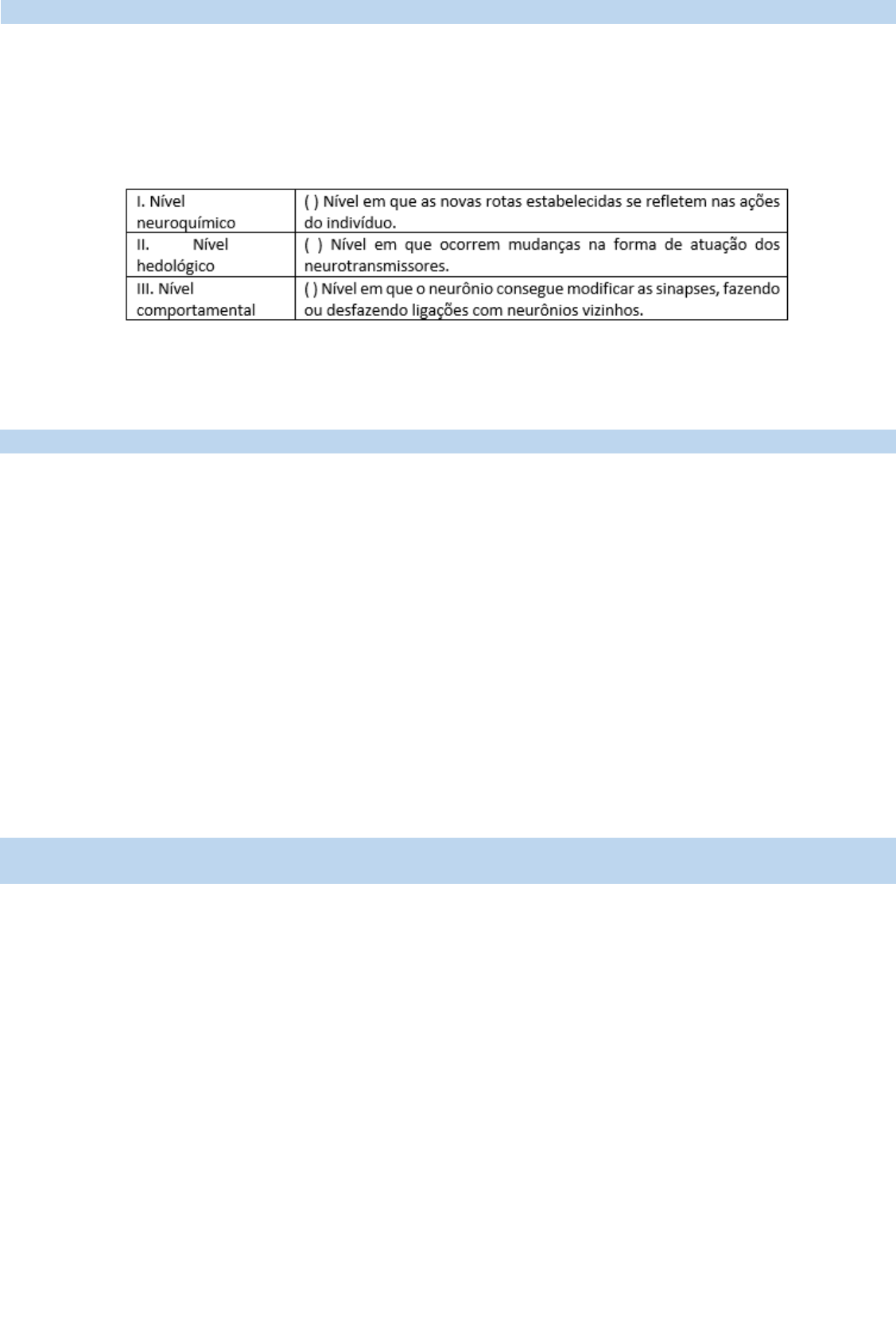 Psicologia do desenvolvimento - Avaliação On-Line 3 (AOL 3) – Questionário 1) A Neuropsicopedagogia tem como objetivo identificar as dificuldades de aprendizagem e, então, propor e executar intervenções que levem ao desenvolvimento pleno do aprendiz. Para isso, tanto a Psicopedagogia quanto a Neuropsicopedagogia atuam no sentido de desenvolver novas “rotas neuronais” que possibilitem o aprendizado do indivíduo. Esse processo de desenvolvimento de novas rotas recebe o nome de plasticidade cerebral (ou neuronal), o qual atua em três níveis distintos. Analise as informações a seguir e relacione cada nível à sua respectiva explicação. Agora, assinale a opção que apresenta a sequência correta. a) II, I, III. b) II, III, I. c) III, II, I. d) III, I, II. e) I, III, II. 2) “Ao se falar de Stanley Hall, vinculamos suas ‘descobertas’ ao processo da industrialização que traz um contexto favorável a essa descoberta diante do crescimento industrial e do crescimento dos movimentos de trabalhadores, que passaram a exigir leis de proteções trabalhistas e reivindicar a proibição do trabalho infantil, exigindo que crianças e jovens passem das atividades laboral para frequentar a escola pública, essas questões estavam muito ligadas a remuneração barata que era destinada aos trabalhadores mais jovens. Além disso, a educação do público juvenil seria uma forma de se ter mão-de-obra futura mais qualificada e que se adequasse ao processo de aceleração da produção industrial e do desenvolvimento tecnológico.” (DESENVOLVIMENTO do adolescente. Disponível em: http://producao.virtual.ufpb.br/books/edusantana/fundamentos-psicologicos-da-educacao- livro/livro/livro.chunked/ch04s03.html. Acesso em: 16 mar. 2019.) Com base no excerto apresentado, é possível afirmar que: a) Não se pode estabelecer relações entre o processo de industrialização, o crescimento dos movimentos de trabalhadores e o estabelecimento da Psicologia da Educação, uma vez que esta desenvolveu-se de forma isolada de seu contexto. b) É nesse contexto, de reivindicação da ampliação da oferta de ensino, que a Psicologia da Educação de fato se origina, já que a escola passa a precisar do que as pesquisas realizadas pela Psicologia têm a oferecer. c) A demanda pela ampliação da oferta de ensino não tem uma relação direta com a criação da Psicologia da Educação, pois esta desenvolveu-se de maneira independente das condições sociais. d) A remuneração mais baixa destinada aos trabalhadores mais jovens impediu o desenvolvimento da Psicologia da Educação, uma vez que não havia interesse em qualificar mão de obra para o futuro. e) O processo de industrialização dificultou as descobertas de Stanley Hall, pois suas pesquisas baseavam-se na relação com trabalhos manuais, não industrializados. 3) Existe uma distinção no trabalho do psicopedagogo que precisa ficar bastante clara: “Dificuldade de aprender é diferente de transtorno de aprendizagem. Alguns educadores, pais e outros profissionais confundem esses conceitos, o que pode levar a procedimentos equivocados que prejudicam o bom desenvolvimento da criança.” (FUNDAÇÃO Maria Cecilia Souto Vidigal. Dificuldade ou transtorno de aprendizagem. Qual a diferença? Disponível em: http://desenvolvimento-infantil.blog.br/dificuldade-ou-transtorno-de-aprendizagem-qual-a- diferenca/. Acesso em: 17 mar. 2019.) Por isso, considerando essa necessidade de distinção, analise as afirmativas a seguir e assinale V para as verdadeiras e F para as falsas. I — ( ) A dificuldade de aprendizagem pode ser entendida como um obstáculo pontual no avanço da aprendizagem de um indivíduo. II — ( ) Falta de motivação ou interesse e problemas emocionais podem ser vistos como causas de dificuldade de aprendizagem. III — ( ) A dificuldade de aprendizagem, para ser assim definida, deve necessariamente acompanhar a criança há tempo e afetar mais de uma área do conhecimento. IV — ( ) O transtorno de aprendizagem tem como causa alguma disfunção neurológica, que faz o cérebro funcionar de maneira distinta. V — ( ) Dislexia, TDAH e autismo são exemplos bastante comuns de dificuldades de aprendizagem. Agora, escolha a opção que apresenta a sequência correta. a) F, V, F, V, F. b) F, V, V, F, V. c) V, F, F, V, V. d) F, F, V, F, V. e) V, V, F, V, F 4) “O século XX foi marcado por inúmeras transformações na educação dos jovens brasileiros. As instituições de ensino tiveram acesso a estudiosos do Brasil e do mundo que mostraram um novo olhar sobre a maneira como aprendemos. […] A base do pensamento construtivista consiste em considerar que há uma construção do conhecimento e que, para que isso aconteça, a educação deverá criar métodos que estimulem essa construção, ou seja, ensinar a aprender.” (O QUE É o método de ensino construtivista? Escola da Inteligência. Disponível em: https://escoladainteligencia.com.br/o-que-e-o-metodo-de-ensino-construtivista/. Acesso em: 17 mar. 2019.) O construtivismo, decorrente das teorias de Piaget, defende que: a) O elemento essencial para a aprendizagem do indivíduo é sua interação com o meio em que está inserido. b) A participação construtiva do indivíduo tem importância fundamental em seu processo de aprendizagem e faz do professor responsável por estimular essa aprendizagem. c) A intervenção do professor em sala de aula é essencial para a aprendizagem, pois ele é o responsável pela construção do conhecimento dos alunos. d) Existe um padrão de forma de aprendizagem aplicável a todos os indivíduos, ou seja, a maneira como se dá a aprendizagem é a mesma para todas as pessoas. e) Por existirem padrões de aprendizagem, é possível que as turmas das escolas sejam formadas por muitos alunos. 5) Lev Vygotsky (1896—1934), psicólogo russo de grande importância para os trabalhos sobre o desenvolvimento infantil, tinha em comum com Piaget a teoria d