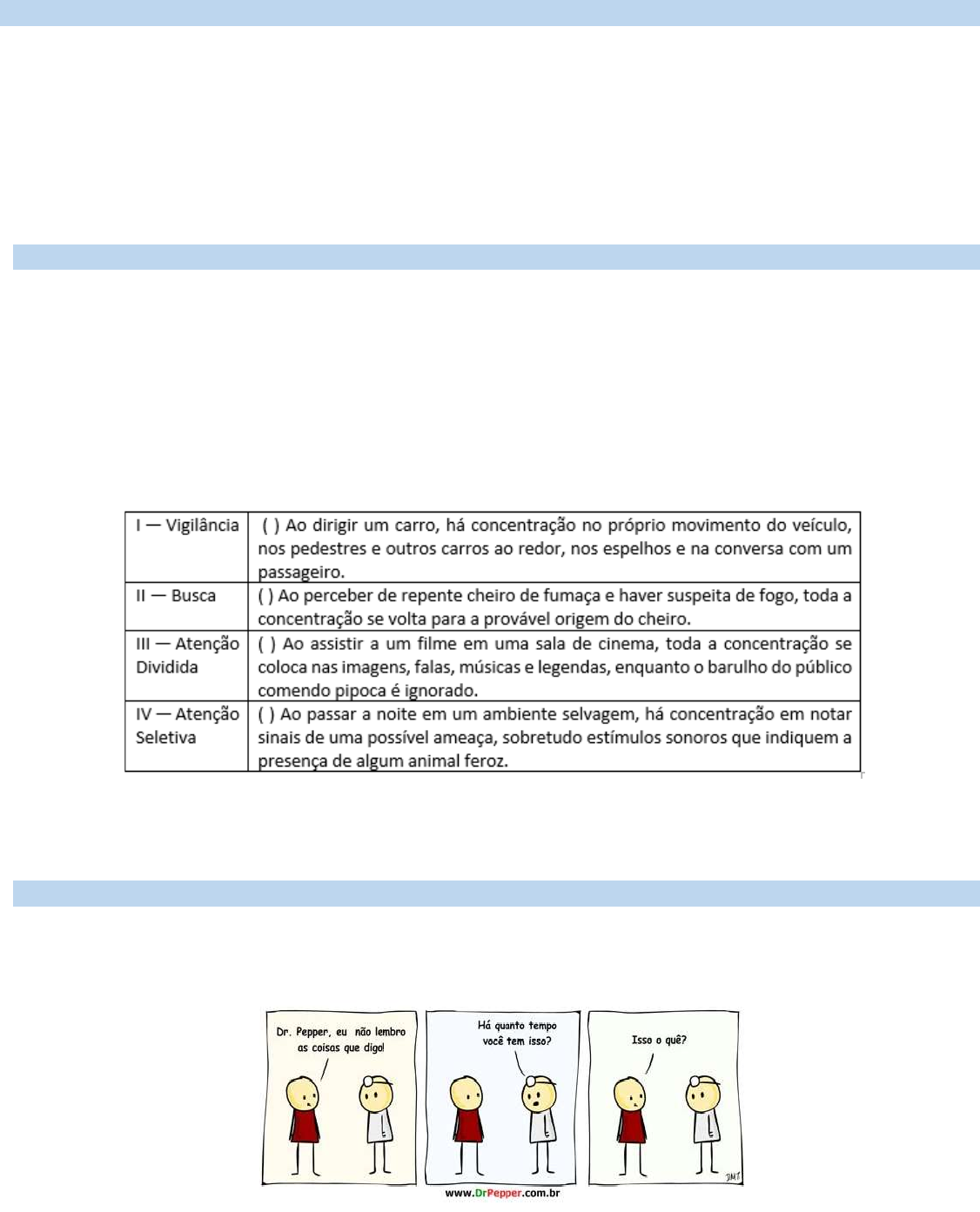 Psicologia do desenvolvimento - Avaliação On-Line 4 (AOL 4) – Questionário 1) A Psicologia do Desenvolvimento estuda e descreve, tal como se pode inferir de seu nome, o desenvolvimento do psiquismo de uma pessoa, mas também pode estudar e descrever dificuldades que impeçam ou retardem esse desenvolvimento. Tendo em vista esse tópico, indique a opção abaixo que apresenta um problema cuja descrição e/ou tratamento não são escopos da Psicologia do Desenvolvimento, sobretudo em relação aos Transtornos da Aprendizagem: a) Uma criança desenvolve um quadro de epilepsia e é assim diagnosticada. b) Uma criança apresenta funcionamento cerebral atípico, provavelmente, por conta de uma síndrome cromossômica. c) Uma criança nasce surda e, como não falante, comunica-se em linguagem de sinais. d) Uma criança tem crises de ansiedade que, inclusive, prejudicam sua autoimagem. e) Uma criança que não consegue se locomover adequadamente é diagnosticada com um Transtorno Motor. 2) Geralmente, quando estamos em um ambiente, há uma infinidade de estímulos diferentes (e, portanto, de informações) que chegam ao nosso cérebro, mas decidimos nos ater a apenas alguns deles. Essa capacidade de se concentrar em determinados elementos, simultaneamente ignorando todos os demais, recebe o nome de atenção. Na coluna à esquerda, estão listadas quatro funções da atenção; na coluna à direita, são apresentados exemplos desses fenômenos: a) I, II, III, IV. b) I, IV, II, III. c) III, IV, II, I. d) III, II, I, IV. e) III, II, IV, I. 3) Nessa tirinha do Dr. Pepper, encontramos um paciente com um caso no mínimo curioso de falta de memória. Marque a opção que explicaria corretamente uma hipótese para esse caso: a) O paciente tem problemas com a sua memória de trabalho, aquela que armazena informações por um curto período de tempo enquanto a informação é relevante. b) O paciente tem problemas com a sua memória instantânea, aquela ligada a acontecimentos específicos de bastante importância, de pesada carga emocional. c) O paciente tem problemas com a sua memória processual, aquela que ordena quais são os passos lógicos para a execução satisfatória de uma tarefa específica. d) O paciente tem problemas com a sua memória implícita, aquela que surge involuntariamente e que é ligada a uma forte emoção. e) O paciente tem problemas com a sua memória declarativa, aquela que guarda nomes, fatos, números e datas. 4) Dentre os vários elementos da composição da subjetividade, pode-se destacar a emoção. Acerca do desenvolvimento das emoções, pondere as afirmativas abaixo: I — O desenvolvimento das emoções acontece de modo ordenado. Ao longo da infância, emoções mais simples (alegria, tristeza, medo etc.) vão aos poucos tomando contornos de emoções mais complexas (vergonha, empatia e orgulho, por exemplo). II — Um bebê que seja negligenciado emocionalmente, se for nutrido de maneira adequada, não apresentará distúrbios de crescimento nem complicações de saúde. III — Uma hipótese para a explicação dos quadros de transtornos de conduta em jovens é a falta de um repertório suficiente de emoções. Ao lidar com uma emoção que desconhece, esse(a) jovem encontra uma série de dificuldades. Assinale a opção correta: a) Estão corretas apenas as afirmações I e III. b) Estão corretas apenas as afirmações I e II. c) Todas as afirmações estão corretas. d) Estão corretas apenas as afirmações II e III. e) Está correta apenas a afirmação I 5) Toda informação que chega ao cérebro por meio de estímulos sensoriais precisa ser analisada e interpretada. Esse fenômeno chama-se Percepção. Segundo Feldman, "a percepção é um processo construtivo pelo qual vamos além dos estímulos que nos são apresentados e tentamos construir uma situação com sentido". Essas tentativas de "construir uma situação com sentido", por sua vez, são denominadas Princípios de Percepção pela escola Gestalt. Abaixo, na coluna à esquerda, está o nome de cada um desses princípios; e, à direita, a descrição de cada um deles. Relacione-os. a) IV — II — III — V — I. b) IV — III — II — I — V. c) V — III — IV — I — II. d) II — IV — I — V — III. e) V — III — II — IV — I. 6) Em tempos recentes, popularizou-se o termo TDA-H, sigla para Transtorno de Déficit de Atenção/Hiperatividade, às vezes até erroneamente associado a qualquer criança que tenha algum grau de falta de concentração. Outra de suas características é a falta de controle de impulsos que, unida à já previamente mencionada desatenção, pode prejudicar o processo de aprendizagem. Qual das opções abaixo descreve adequadamente um outro transtorno de neurodesenvolvimento que prejudica a aprendizagem? a) O Transtorno do Espectro Autista é um dos casos mais intrigantes: pessoas que sofrem desse transtorno geralmente possuem muita dificuldade em criar e manter relações sociais, mas, por outro lado, normalmente possuem uma memória e aptidões intelectuais acima da média. b) Os Transtornos Específicos de Aprendizagem acontecem quando uma criança é incapaz de entender um determinado assunto, suas regras e especificidades. Um exemplo clássico é o do estudante que se sai bem em todas as matérias, mas possui grandes dificuldades em Matemática. É um transtorno que pode ser facilmente superado através da educação formal. c) Os Transtornos Motores dizem respeito exclusivamente às habilidades manuais de uma criança, ou seja, sua destreza com ambas as mãos, que, nesse caso, é bastante reduzida. Felizmente, a fisioterapia e o acompanhamento profissional contínuo são capazes de tratar o problema de forma eficaz. d) Os Déficits Intelectuais correspondem a dificuldades cognitivas na resolução de problemas e podem ser consequentes de uma lesão durante o nascimento ou o desenvolvimento de uma criança. Ainda assim, indivíduos que apresent