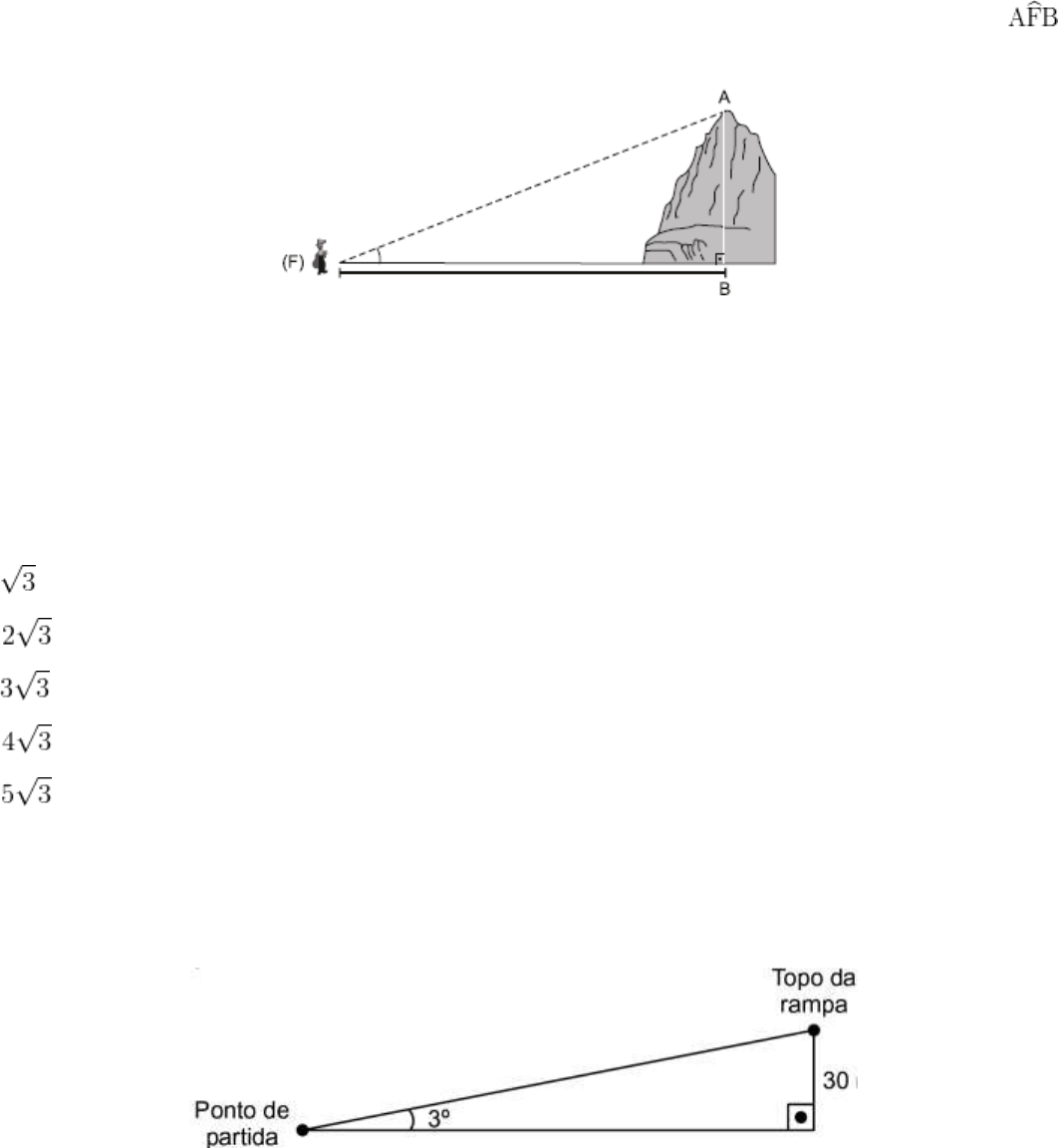 Questão 1) Na figura, a seguir, um fazendeiro (F) dista 600 m da base da montanha (ponto B). A medida do ângulo é igual a 30º. Ao calcular a altura da montanha, em metros, o fazendeiro encontrou a medida correspondente a Questão 2) João estava procurando seu gatinho, que desde manhã tinha desaparecido, quando o ouviu miando do alto de uma árvore. Para retirá-lo de lá, João pegou uma escada de 4 m, em sua casa, e encostou-a na árvore de tal forma que o ângulo da escada com o chão foi de 60º. Sendo a árvore perpendicular ao solo, determine a altura que o gato estava em relação ao chão. a) b) c) d) e) Questão 3) Um ciclista sobe, em linha reta, uma rampa com inclinação de 3 graus a uma velocidade constante de 4 metros por segundo. A altura do topo da rampa em relação ao ponto de O tempo, em minutos, que o ciclista levou para percorrer completamente a rampa é (Use a aproximação sen 3º = 0,05) a) 2,5. b) 7,5. c) 10. d) 15. e) 30. Questão 4) Uma empresa de iluminação necessita esticar um cabo de energia provisório do topo de um edifício, cujo formato é um retângulo, a um determinado ponto do solo distante a 6 metros, como ilustra a figura a seguir. O comprimento desse cabo de energia, em metros, será de a) 28. b) 14. c) 12. d) 10. e) 8.