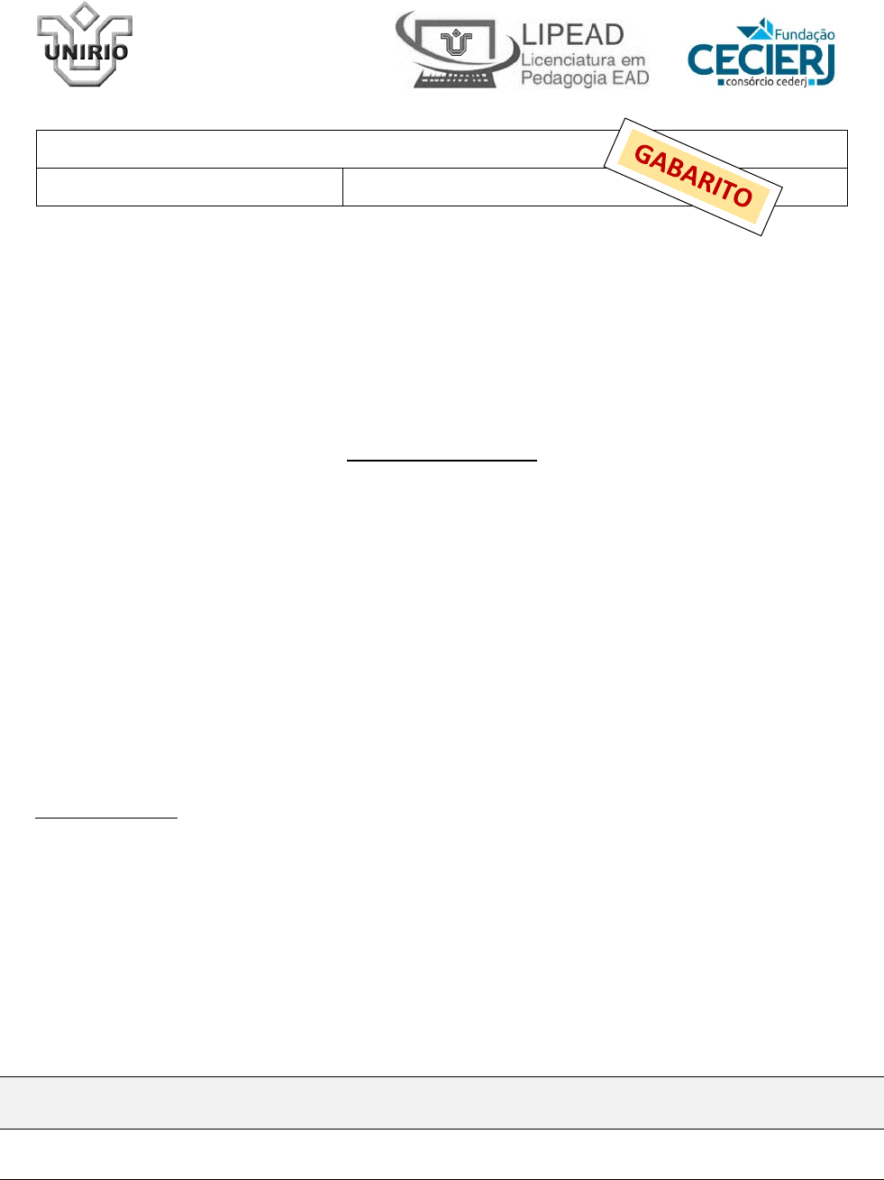 Nome: Matrícula: Polo: EDUCAÇÃO E TRABALHO Coordenação: Prof. Dr. Dalton Alves Equipe de Professores Mediadores a Distância: Profª. Drª. Fátima Chaves Profª. Ma. Roberta Guimarães Prof. Dr. Robert Lee Segal APX2 – 2020.1 Esta é a sua Segunda Avaliação a Distância Especial, em substituição a Segunda Avaliação Presencial, cancelada em decorrência da atual pandemia do Coronavírus (COVID-19). Esta avaliação é individual. Você irá encontrar 2(duas) questões dissertativas e 4(questões objetivas) nesta avaliação; Leia atentamente seus enunciados. Entender o que se pede em cada questão é o melhor caminho para o sucesso numa avaliação, pois, uma resposta que não esteja de acordo com o que se pede para fazer, por mais certa que esteja, estará errada; IMPORTANTE: Revise suas respostas e verifique se as ideias estão claras, sobretudo, nas questões dissertativas; Responda com suas próprias palavras a partir dos estudos e leituras que realizou, não serão aceitos plágios, nem meras cópias de trechos dos textos de referência da disciplina Educação e Trabalho; Sobre os Plágios: Se você sabe o que responder, qual é a resposta, então, por que não responder por si? Por que copiar-e-colar literalmente ideias pinçadas aqui e ali ao invés de tentar se apropriar delas e expressá-las com suas próprias palavras, de forma autoral? Ao invés disto, procure se apropriar das ideias em causa em cada questão e responder por si mesmo(a). Já que entendeu do que se trata, onde está a resposta nos textos de referência, então, escreva e desenvolva. Só se aprende a escrever de modo autônomo escrevendo. Apenas jogando a ideia ao acaso na folha de resposta, no esquema "copiar-e-colar" você nunca irá superar isto e nunca será um(a) livre pensador(a), algo essencial para ser um(a) educador(a). Sabemos dos problemas e complexidades, mas é apenas os enfrentando que poderemos superá-los. É como uma luta, e “quem diz luta diz possibilidade de avanço e naturalmente também de derrota” (SNYDERS). Só quem não luta já está de antemão derrotado(a). QUESTÕES OBJETIVAS (4.0 Pontos) QUESTÃO 01 = [1,0 Ponto] Segundo Eraldo BATISTA, Texto 12, o IDORT – Instituto de Organização Racional do Trabalho funcionava como uma instituição educacional nas décadas de 1930 e 1940 no Brasil, bem como ele afirma que esta entidade criada por empresários paulistas foi essencial na discussão sobre o ensino profissional e orientou até a criação e organização das escolas técnicas do “Sistema S”. O IDORT implementou uma UNIVERSIDADE FEDERAL DO ESTADO DO RIO DE JANEIRO 2 nova pedagogia do ensino profissionalizante com base nos princípios da racionalidade técnica da produção, segundo a concepção taylorista-fordista. Com base nestas ideias, assinale a única afirmativa ERRADA: [ ] O Taylorismo/Fordismo tem por objetivo concreto fundar uma “pedagogia da fábrica” de cunho tecnicista e reestruturar o processo produtivo capitalista do século XX sob novas bases; [ ] Os cursos profissionalizantes organizados pelo IDORT visavam restringir a formação do trabalhador à aprendizagem de práticas meramente operacionais (técnicas) e que pouco exigissem do seu esforço intelectual, criativo e autônomo. [ X ] A pedagogia do ensino profissionalizante do IDORT visava um homem ativo, inteligente, que transformasse o operário em um profissional autônomo e criativo. [ ] O IDORT concebia que a educação profissionalizante deveria ser funcional às necessidades dos industriais, controlando, disciplinando e “domesticando” os trabalhadores; QUESTÃO 02 = [1,0 Ponto] Com base no TEXTO 14 = SOUSA JUNIOR, Justino. Omnilateralidade. In: Dicionário da educação profissional, marque apenas a ÚNICA afirmativa ERRADA, dentre as opções a seguir, em relação àquilo que corresponde ao conceito de OMNILATERALIDADE: [ ] O conceito de omnilateralidade guarda relação com outro conceito importante para o problema da formação humana que é o de politecnia. [ ] A omnilateralidade se refere a uma formação humana oposta à formação unilateral provocada pelo trabalho alienado, pela divisão do trabalho, pela reificação, pelas relações burguesas estranhas, enfim. [ X ] A omnilateralidade se realiza no âmbito das relações burguesas, ao passo que a politecnia apenas se realiza com a superação destas relações. [ ] A omnilateralidade se compreende em oposição à unilateralidade na formação do homem que vive do trabalho; [ ] A formação omnilateral tem a ver com a criação de novas bases sociais que permitam o livre desenvolvimento das potencialidades humanas. [ ] O conceito de omnilateralidade remete ao campo vasto, complexo e variado das dimensões humanas: ética, afetiva, moral, estética, sensorial, intelectual, prática; no plano dos gostos, dos prazeres, das aptidões, das habilidades, dos valores etc., que serão propriedades da formação humana em geral, desenvolvidas socialmente. QUESTÃO 03 = [1,0 Ponto] Considerando o Texto 21 de ASKSENEN, Elisângela, analise e identifique qual é a teoria da educação que corresponde ao texto desta citação: "Os conteúdos são fundamentais e sem conteúdos relevantes, conteúdos significativos, a aprendizagem deixa de existir, ela transforma-se num arremedo, ela transforma-se numa farsa. Parece-me, pois, fundamental que se entenda isso e que, no interior da escola, nós 3 atuemos segundo essa máxima: a prioridade de conteúdos, que é a única forma de lutar contra a farsa do ensino. Por que esses conteúdos são prioritários? Justamente porque o domínio da cultura constitui instrumento indispensável para a participação política das massas. (...) [Por isso] o dominado não se liberta se ele não vier a dominar aquilo que os dominantes dominam. Então, dominar o que os dominantes dominam é condição de libertação". Agora MARQUE nas alternativas a seguir a única opção correta que corresponde à teor