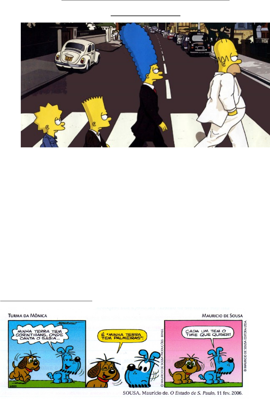 Escola Estadual Prof. José Pedretti Neto Prof: Juliano Cesar de campos 3º A Roteiro de atividade de Língua Portuguesa Intertextualidade A palavra intertextualidade é formada pelo sufixo inter que faz referência à noção de relação. Esse relacionamento ocorre entre um texto e outro, como se eles conversassem e sofressem influência um do outro. A intertextualidade está presente em músicas, propagandas publicitárias, artes plásticas, dança e outras expressões que podem enriquecer o tema tratado. Intertextualidade implícita e explícita A intertextualidade pode ser apresentada de forma direta (explícita) ou indireta (implícita): Implícita: não há relação direta com o texto fonte nem outras coisas que o identifiquem. Explícita: há relação direta com o texto e elementos com o texto fonte. Tipos de intertextualidade Alusão: faz referência a elementos de outros textos de maneira indireta, ou seja, implícita. Citação: quando é acrescentado partes de outros textos em uma produção textual, o que gera a intertextualidade direta. Epígrafe: complemento de parágrafo ou frase no texto produzido que se relaciona com outro. Paráfrase: recriação de um texto com a mesma ideia do texto fonte. Paródia: a paródia é a subversão de um texto original, de maneira crítica ou satírica. Bricolagem: criação de um texto a partir de elementos retirados de outros. Sample: músicas, textos utilizados como base para outras novas produções. Pastiche: vários tipos de manifestações em uma mesma obra. Exercícios de Intertextualidade 1- Operários, 1933, óleo sobre tela, 150×205 cm, (P122), Acervo Artístico-Cultural dos Palácios do Governo do Estado de São Paulo Desiguais na fisionomia, na cor e na raça, o que lhes assegura identidade peculiar, são iguais enquanto frente de trabalho. Num dos cantos, as chaminés das indústrias se alçam verticalmente. No mais, em todo o quadro, rostos colados, um ao lado do outro, em pirâmide que tende a se prolongar infinitamente, como mercadoria que se acumula, pelo quadro afora. (Nádia Gotlib. Tarsila do Amaral, a modernista.) O texto aponta no quadro de Tarsila do Amaral um tema que também se encontra nos versos transcritos em: a) “Pensem nas meninas/ Cegas inexatas/ Pensem nas mulheres/ Rotas alteradas.” (Vinícius de Moraes) b) “Somos muitos severinos/ iguais em tudo e na sina:/ a de abrandar estas pedras/ suando-se muito em cima.” (João Cabral de Melo Neto) c) “O funcionário público não cabe no poema/ com seu salário de fome/ sua vida fechada em arquivos.” (Ferreira Gullar) d) “Não sou nada./ Nunca serei nada./ Não posso querer ser nada./À parte isso, tenho em mim todos os sonhos do mundo.” (Fernando Pessoa) e) “Os inocentes do Leblon/ Não viram o navio entrar (…)/ Os inocentes, definitivamente inocentes/ tudo ignoravam,/ mas a areia é quente, e há um óleo suave que eles passam pelas costas, e aquecem.” (Carlos Drummond de Andrade) Leia os textos abaixo para responder à questão 2. Ideologia Meu partido É um coração partido E as ilusões estão todas perdidas Os meus sonhos foram todos vendidos Tão barato que eu nem acredito Eu nem acredito Que aquele garoto que ia mudar o mundo (Mudar o mundo) Frequenta agora as festas do “Grand Monde” Meus heróis morreram de overdose Meus inimigos estão no poder Ideologia Eu quero uma pra viver Ideologia Eu quero uma pra viver O meu prazer Agora é risco de vida Meu sex and drugs não tem nenhum rock ‘n’ roll Eu vou pagar a conta do analista Pra nunca mais ter que saber quem eu sou Pois aquele garoto que ia mudar o mundo (Mudar o mundo) Agora assiste a tudo em cima do muro Meus heróis morreram de overdose Meus inimigos estão no poder Ideologia Eu quero uma pra viver Ideologia Eu quero uma pra viver. (Cazuza e Roberto Frejat – 1988) E as ilusões estão todas perdidas (v. 3) Esse verso pode ser lido como uma alusão a um livro intitulado Ilusões perdidas, de Honoré de Balzac. 2)Tal procedimento constitui o que se chama de: a) metáfora b) pertinência c) pressuposição d) intertextualidade e) metonímia Observe o texto e a imagem: O gordo é o novo fumante Nunca houve tanta gente acima do peso – nem tanto preconceito contra gordos. De um lado, o que há por trás é uma positiva discussão sobre saúde. Por outro, algo de podre: o nascimento de uma nova eugenia. (Adaptado de: Super Interessante. Editora Abril. 306.ed. jul. 2012. p.21.) Em relação ao texto, considere as afirmativas a seguir: I. O código não verbal, principalmente no que se refere ao segundo desenho, revela o discurso preconceituoso e, consequentemente, um aspecto ideológico. II. O sentido de proibição é captado por meio da intertextualidade estabelecida entre os códigos não verbais a qual, por sua vez, revela aspectos ligados ao gênero do humor. III. O conteúdo expresso na placa revela que, futuramente, indivíduos obesos sofrerão ainda mais discriminação social. IV. O efeito de sentido expresso pelo conteúdo não verbal serve para reforçar o caráter polissêmico da placa. 3)Assinale a alternativa correta: a)Somente as afirmativas I e II são corretas. b) Somente as afirmativas I e IV são corretas. c) Somente as afirmativas III e IV são corretas. d) Somente as afirmativas I, II e III são corretas. e) Somente as afirmativas II, III e IV são corretas. 4 – Quem não passou pela experiência de estar lendo um texto e defrontar-se com passagens já lidas em outros? Os textos conversam entre si em um diálogo constante. Esse fenômeno tem a denominação de intertextualidade. Leia os seguintes textos: I. Quando nasci, um anjo torto Desses que vivem na sombra Disse: Vai Carlos! Ser “gauche” na vida. ANDRADE, Carlos Drummond de. Alguma poesia. Rio de Janeiro: Nova Aguilar, 1964) II. Quando nasci veio um anjo safado O chato dum querubim E decretou que eu tava predestinado A ser errado assim Já de saída a minha estrada entortou Mas vou até o fim