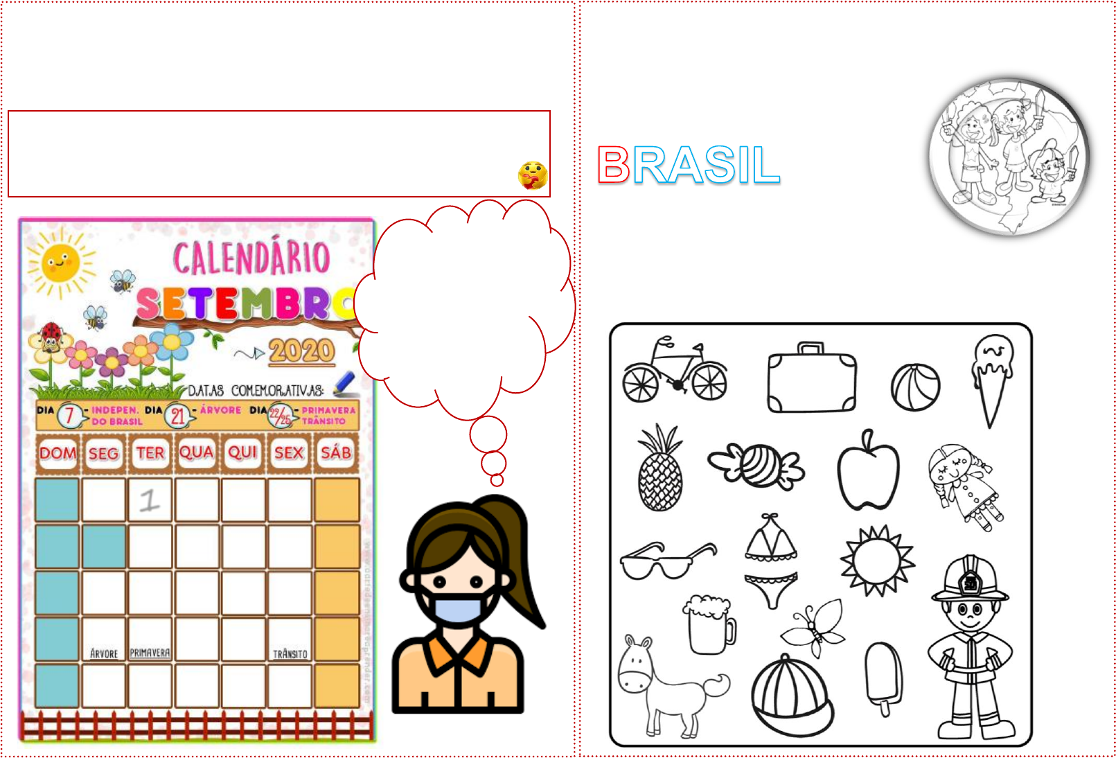 ESCOLA MUNICIPAL DE ED. INF. CELSO MAURÍCIO DE PONTES PROFESSORA: ANA PAULA ANSELMO DOS SANTOS SEGUNDA-FEIRA, 31 DE AGOSTO DE 2020 SOU: ________________________________________TURMA: PRÉ II OLÁ, MEUS AMORES!!! O MÊS DE SETEMBRO ESTÁ RECHEADO DE DATAS COMEMORATIVAS. A INDEPENDÊNCIA DO BRASIL, DIA DA ÁRVORE, DIA DO TRÂNSITO E MUITO MAIS... TENHAM UM MÊS ABENÇOADO! SOU: ________________________________________________________ TEMA: INDEPENDÊNCIA DO BRASIL VAMOS LEVANTAR HIPÓTESES DA LINGUAGEM ESCRITA? OBSERVE A PALAVRA ABAIXO: - QUAL A PRIMEIRA LETRA DO NOME? _________ - QUANTAS LETRAS TEM O NOME? ____________ PINTE SOMENTE AS IMAGENS COM NOMES INICIADOS PELA LETRA B. COM A AJUDA DE ALGUÉM DA FAMÍLIA, COMPLETE O CALENDÁRIO DO MÊS DE SETEMBRO. 1 ESCOLA MUNICIPAL DE ED. INF. CELSO MAURÍCIO DE PONTES PROFESSORA: ANA PAULA ANSELMO DOS SANTOS QUARTA-FEIRA, 02 DE SETEMBRO DE 2020 SOU: ________________________________________TURMA: PRÉ II TEMA: INDEPENDÊNCIA DO BRASIL SOU: ________________________________________________________ NO DIA 7 DE SETEMBRO NOSSO PAÍS FICOU INDEPENDENTE DE PORTUGAL. COLE PEDACINHOS DE EVA VERDE E AMARELO NO MAPA DO BRASIL. ESCOLA MUNICIPAL DE ED. INF. CELSO MAURÍCIO DE PONTES PROFESSORA: ANA PAULA ANSELMO DOS SANTOS SEXTA-FEIRA, 04 DE SETEMBRO DE 2020 SOU: ________________________________________TURMA: PRÉ II TEMA: INDEPENDÊNCIA DO BRASIL SOU: ________________________________________TURMA: PRÉ II VAMOS LEVANTAR HIPÓTESES DA LINGUAGEM ESCRITA? OBSERVE O SOM INICIAL DA PALAVRA ABAIXO: PINTE OS DESENHOS INICIADOS PELA SÍLABA EM DESTAQUE SOU: ________________________________________TURMA: PRÉ II SOU: ________________________________________TURMA: PRÉ II TEMA: INDEPENDÊNCIA DO BRASIL NO ESPAÇO ABAIXO, CORTE AS FORMAS GEOMÉTRICAS QUE VOCÊ RECEBEU E MONTE A BANDEIRA DO BRASIL. ENCERRAMOS NOSSA 1ª SEMANA DE ATIVIDADES!!! PINTE NO CALENDÁRIO A DATA DE HOJE! ESCOLA MUNICIPAL DE ED. INF. CELSO MAURÍCIO DE PONTES PROFESSORA: ANA PAULA ANSELMO DOS SANTOS SEGUNDA-FEIRA, 09 DE SETEMBRO DE 2020 SOU: ________________________________________TURMA: PRÉ II TEMA: DIA DA ÁRVORE SOU: ________________________________________TURMA: PRÉ II TEMA: DIA DA ÁRVORE VAMOS LEVANTAR HIPÓTESES DA LINGUAGEM ESCRITA? OBSERVE A PALAVRA ABAIXO: VEJA AS IMAGENS E PINTE APENAS OS DESENHOS COM NOMES INICIADOS PELA LETRA A. AS ÁRVORES SÃO ESSENCIAIS PARA A CONSERVAÇÃO DO MEIO AMBIENTE. 21 DE SETEMBRO É O DIA DA ÁRVORE. PINTE NO CALENDÁRIO A DATA QUE REPRESENTA ESSE DIA. ESCOLA MUNICIPAL DE ED. INF. CELSO MAURÍCIO DE PONTES PROFESSORA: ANA PAULA ANSELMO DOS SANTOS QUARTA-FEIRA, 11 DE SETEMBRO DE 2020 SOU: ________________________________________TURMA: PRÉ II TEMA: DIA DA ÁRVORE SOU: ________________________________________TURMA: PRÉ II TEMA: DIA DA ÁRVORE SOU: ________________________________________TURMA: PRÉ II TEMA: DIA DA ÁRVORE SOU: ________________________________________TURMA: PRÉ II TEMA: DIA DA ÁRVORE RECORTE AS FIGURAS QUE VOCÊ RECEBEU E COLE-AS NOS QUADROS CORRETOS. ENCERRAMOS NOSSA 2ª SEMANA DE ATIVIDADES!!! PINTE NO CALENDÁRIO A DATA DE HOJE! ESCOLA MUNICIPAL DE ED. INF. CELSO MAURÍCIO DE PONTES PROFESSORA: ANA PAULA ANSELMO DOS SANTOS SEGUNDA-FEIRA, 14 DE SETEMBRO DE 2020 SOU: ________________________________________TURMA: PRÉ II TEMA SOU: ________________________________________TURMA: PRÉ II TEMA: A PESSOA COM DEFICIÊNCIA A CAROL É DEFICIENTE FÍSICA, ESTÁ USANDO CADEIRA DE RODAS. ENCONTRE OS 7 ERROS QUE EXISTEM ENTRE OS DESENHOS ABAIXO. NO DIA 21 DE SETEMBRO LEMBRAMOS A NECESSIDADE DE INCLUSÃO E INTEGRAÇÃO DA PESSOA COM DEFICIÊNCIA. PINTE NO CALENDÁRIO ESTA DATA. ESCOLA MUNICIPAL DE ED. INF. CELSO MAURÍCIO DE PONTES PROFESSORA: ANA PAULA ANSELMO DOS SANTOS QUARTA-FEIRA, 16 DE SETEMBRO DE 2020 SOU: ________________________________________TURMA: PRÉ II TEMA: A PESSOA COM DEFICIÊNCIA O QUE FAZER PARA AJUDAR A PESSOA COM DEFICIÊNCIA? PINTE APENAS AS CENAS EM QUE ELES ESTÃO SENDO AJUDADOS. SOU: ________________________________________TURMA: PRÉ II TEMA: A PESSOA COM DEFICIÊNCIA ESCOLA MUNICIPAL DE ED. INF. CELSO MAURÍCIO DE PONTES PROFESSORA: ANA PAULA ANSELMO DOS SANTOS SEXTA-FEIRA, 18 DE SETEMBRO DE 2020 SOU: ________________________________________TURMA: PRÉ II TEMA: A PESSOA COM DEFICIÊNCIA VEJA OS DIREITOS DAS CRIANÇAS E PINTE APENAS O QUE ESTÁ RELACIONADO À PESSOA COM DEFICIÊNCIA. SOU: ________________________________________TURMA: PRÉ II TEMA: A PESSOA COM DEFICIÊNCIA VEJA ALGUMAS PERSONAGENS DA TURMA DA MÔNICA QUE POSSUEM ALGUMA DEFICIÊNCIA. DEPOIS, PEÇA PRA ALGUÉM DA FAMÍLIA LER AS CARACTERÍSTICAS, NUMERE CORRETAMENTE E PINTE O DESENHO. 1 – ANDRÉ, menino autista que ensina a turma a conviver com as diferenças. 2 – DORINHA, garota cega que reconhece os amigos pelo cheiro e pela voz. 3 – HUMBERTO, garoto surdo que reconhece os amigos pela visão. 4 – LUCA, garoto cadeirante que adora jogar basquete. SOU: ________________________________________TURMA: PRÉ II TEMA: A PESSOA COM DEFICIÊNCIA É IMPORTANTE DESTACAR QUE SOMOS DIFERENTES, MAS TEMOS DIREITOS IGUAIS. VEJA O DESENHO E DÊ UM BELO COLORIDO. SOU: ________________________________________TURMA: PRÉ II TEMA: A PESSOA COM DEFICIÊNCIA NO ESPAÇO ABAIXO, FAÇA UM LINDO DESENHO DE BRINCADEIRAS COM INTEGRAÇÃO DE PESSOAS COM DEFICIÊNCIA. ENCERRAMOS NOSSA 3ª SEMANA DE ATIVIDADES!!! PINTE NO CALENDÁRIO A DATA DE HOJE! ESCOLA MUNICIPAL DE ED. INF. CELSO MAURÍCIO DE PONTES PROFESSORA: ANA PAULA ANSELMO DOS SANTOS SEGUNDA-FEIRA, 21 DE SETEMBRO DE 2020 SOU: ________________________________________TURMA: PRÉ II TEMA: A PRIMAVERA SOU: ________________________________________TURMA: PRÉ II TEMA: A PRIMAVERA NO DIA 22 DE SETEMBRO INICIA O PERÍODO MAIS FLORIDO DO ANO: A PRIMAVERA PINTE NO CALENDÁRIO ESTA DATA. ESCOLA MUNICIPAL DE ED. INF. CELSO MAURÍCIO DE PONTES PROFESSORA: ANA PAULA ANSELMO DOS SANTOS QUARTA-FEIRA, 23 DE SETEMBRO DE 2020 SOU: ____