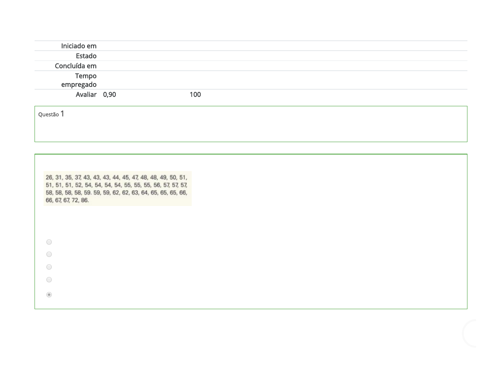 26/03/2020 Questionário 2: Revisão da tentativa ava.unifacear.edu.br/mod/quiz/review.php?attempt=697062&cmid=290859 1/7 Iniciado em quinta, 26 mar 2020, 16:36 Estado Finalizada Concluída em quinta, 26 mar 2020, 16:46 Tempo empregado 9 minutos 56 segundos Avaliar 0,90 de um máximo de 0,90(100%) Questão 1 Correto Atingiu 0,18 de 0,18 Os dados a seguir representam as idades das 50 mulheres mais in�uentes do mundo, em 2012. (Fonte: Forbes). Construa uma distribuição de frequência usando sete classes. As frequências para as 7 classes respectivamente é: Escolha uma: a. 1, 6, 12, 18, 11, 1, 1 b. 3, 6, 10, 18, 10, 2, 1 c. 3, 5, 12, 18, 11, 1, 1 d. 2, 6, 10, 18, 10, 2, 1 e. 2, 5, 12, 18, 11, 1, 1 Sua resposta está correta. A resposta correta é: 2, 5, 12, 18, 11, 1, 1. 26/03/2020 Questionário 2: Revisão da tentativa ava.unifacear.edu.br/mod/quiz/review.php?attempt=697062&cmid=290859 2/7 Questão 2 Correto Atingiu 0,18 de 0,18 O número de vitórias no campeonato para cada time da Associação Americana de futebol são: 13. 10. 12. 11. 7. 8. 6. 6. 10. 7. 12. 4. 6. 5. 2. 2. Encontre a amplitude, a média, a variância e o desvio padrão para os dados apresentados. Escolha uma: a. Amplitude = 11 μ = 7,6 σ = 11,4 σ = 3,4 b. Amplitude = 10 μ = 3,4 σ = 3,4 σ = 11,4 c. Amplitude = 10 μ = 7,6 σ = 3,4 σ = 11,4 d. Amplitude = 12 μ = 8,7 σ = 15,4 σ = 4,3 e. N.D.A 2 2 2 2 26/03/2020 Questionário 2: Revisão da tentativa ava.unifacear.edu.br/mod/quiz/review.php?attempt=697062&cmid=290859 3/7 Sua resposta está correta. A resposta correta é: Amplitude = 11 μ = 7,6 σ = 11,4 σ = 3,4. 2 26/03/2020 Questionário 2: Revisão da tentativa ava.unifacear.edu.br/mod/quiz/review.php?attempt=697062&cmid=290859 4/7 Questão 3 Correto Atingiu 0,18 de 0,18 A partir das letras A, B e C que estão marcados sobre o eixo horizontal. A partir delas, determine qual é a média, a mediana e a moda. Escolha uma: a. A = moda pois é o bloco mais alto; B = Mediana, uma vez que a distribuição é assimétrica à direita C = média, uma vez que a distribuição é assimétrica à direita. 26/03/2020 Questionário 2: Revisão da tentativa ava.unifacear.edu.br/mod/quiz/review.php?attempt=697062&cmid=290859 5/7 b. A = Mediana pois é o bloco mais alto; B = Moda, uma vez que a distribuição é assimétrica à direita C = média, uma vez que a distribuição é assimétrica à direita. c. N.D.A d. A = moda pois é o bloco mais alto; B = média, uma vez que a distribuição é assimétrica à direita C = Mediana, uma vez que a distribuição é assimétrica à direita. e. A = média pois é o bloco mais alto; B = Mediana, uma vez que a distribuição é assimétrica à direita C = moda, uma vez que a distribuição é assimétrica à direita. Sua resposta está correta. A resposta correta é: A = moda pois é o bloco mais alto; B = Mediana, uma vez que a distribuição é assimétrica à direita C = média, uma vez que a distribuição é assimétrica à direita.. 26/03/2020 Questionário 2: Revisão da tentativa ava.unifacear.edu.br/mod/quiz/review.php?attempt=697062&cmid=290859 6/7 Questão 4 Correto Atingiu 0,18 de 0,18 Calcule a amplitude total dos seguintes conjuntos de números: A = {10, 12, 13, 20, 25, 34, 45} Escolha uma: a. 45 b. 35 c. 20 d. 1 e. 10 Sua resposta está correta. A resposta correta é: 35. 26/03/2020 Questionário 2: Revisão da tentativa ava.unifacear.edu.br/mod/quiz/review.php?attempt=697062&cmid=290859 7/7 Questão 5 Correto Atingiu 0,18 de 0,18 Segundo o vídeo, quais são os tipos principais de frequência? Escolha uma: a. N.D.A b. Absoluta, Relativa e acumulada c. Relativa d. Absoluta e relativa e. Absoluta Sua resposta está correta. A resposta correta é: Absoluta e relativa. http://ava.unifacear.edu.br/mod/quiz/view.php?id=290851&forceview=1 http://ava.unifacear.edu.br/mod/quiz/view.php?id=290867&forceview=1