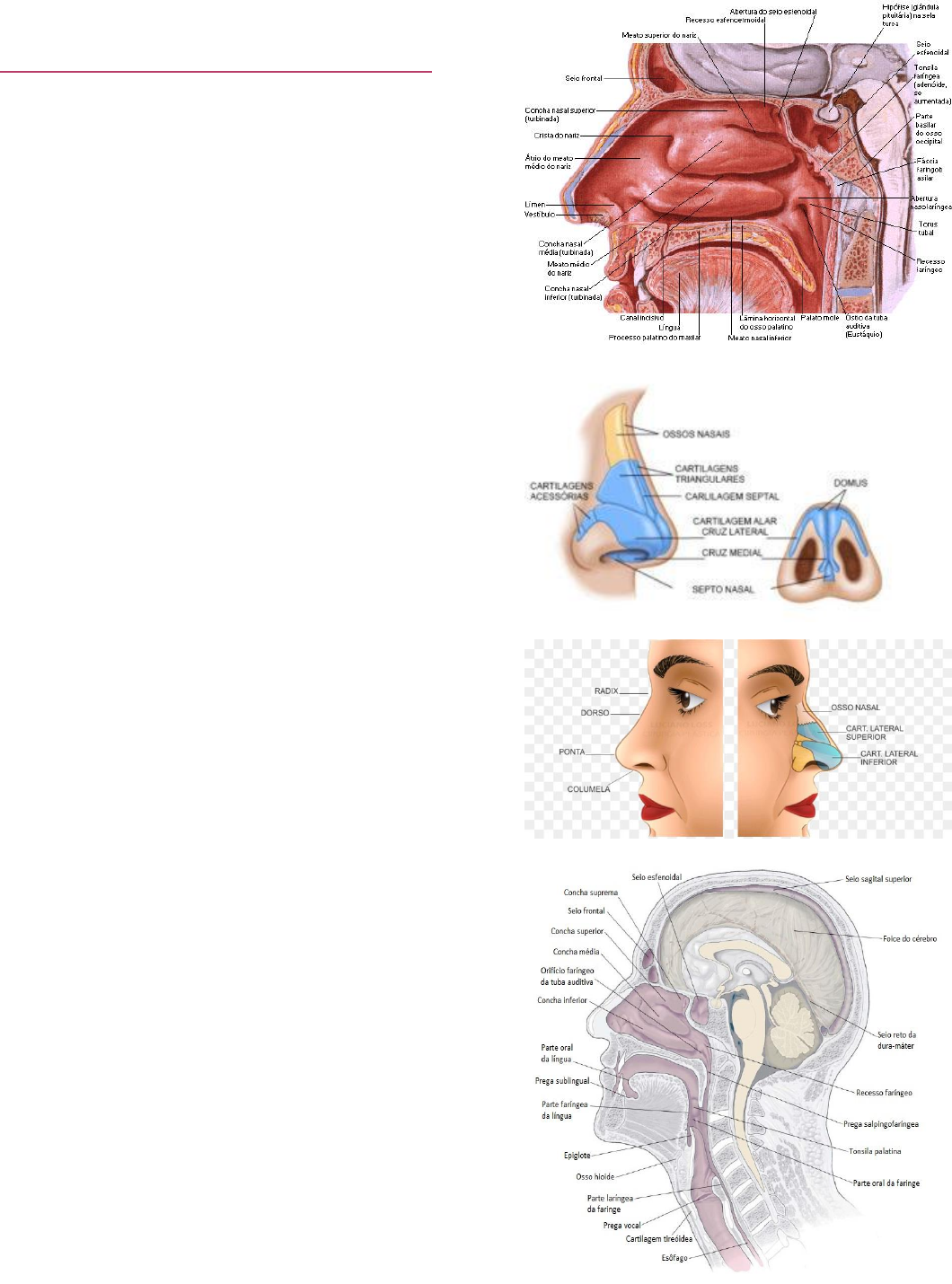 Sistema Respiratório Anatomia do Sistema Respiratório Nariz Parte interna e externa Parte externa : Esqueleto de sustentação de osso e cartilagem hialina Esqueleto ósseo : Osso frontal , ossos nasais e maxilares Esqueleto cartilaginoso : Cartilagem do septo nasal (forma a parte anterior do septo nasal), cartilagens nasais laterais e cartilagens alares (formam parte das narinas) Parte interna : Função : Aquecer ,umedecer e filtrar o ar que entra , detectar estímulos olfatórios , modificar as vibrações da fala Cavidade Nasal Dividido em dois lados por uma divisão chamada septo Vestíbulo : Parte anterior da cavidade nasal, logo dentro das narinas , revestido por pelos Conchas : Subdividem cada lado da cavidade nasal em uma série de passagens semelhantes a sulcos - Meatos superior , médio e inferior A túnica mucosa reveste a cavidade e suas projeções A disposição das conchas e dos meatos aumentam a área da superfície na parte interna do nariz e impede a desidratação agindo como defletor que aprisiona gotículas de água durante a exalação Epitélio olfatório : Os receptores olfatórios situam-se na membrana que reveste as conchas nasais superiores e os septos adjacentes A medida que o ar inspirado rodopia em volta das conchas e meatos é aquecido pelo sangue dos capilares O muco secretado pelas células calciformes , umedece o ar e aprisiona as partículas de pó A drenagem dos ductos nasolacrimais e talvez das secreções provenientes dos seios paranasais também ajudam a umedecer o ar , os cílios movem o muco e as partículas de pó aprisionadas para a faringe onde podem ser engolidas ou cuspidas , removendo assim as partículas. Faringe Tubo em forma de funil com cerca de 13 cm de comprimento Começa nas narinas internas e estende-se até o nível da cartilagem cricóidea Localização : Atrás das cavidades nasal e oral , acima da laringe e logo a frente das vertebras cervicais Funciona como via de passagem de ar e alimento Aloja as tonsilas É dividida em : 1 –Nasofaringe: Situa-se atrás da cavidade nasal e estende-se até o plano do palato mole , na parede posterior contém a tonsila faríngea . Aqui também troca pequena quantidade de ar com as tubas auditivas , para equilibrar a pressão do ar entre a faringe e o ouvido médio 2- Orofaringe: Parte intermediaria ,situa-se atrás da cavidade oral e estende-se do palato mole até o nível do hioide , tem apenas uma abertura a boca, é passagem comum de ar e alimento , as tonsilas palatina e lingual são encontradas aqui . 3-Laringofaringe : Parte inferior ,começa no hioide e comunica o esôfago á laringe , passagem de ar e alimento Laringe Passagem curta , que liga a laringofaringe com a traqueia , situa-se entre C4-C6 Composta por 9 pedaços de cartilagem Três ocorrem isoladas : Tireóidea ,epiglótica e cricóidea) e três ocorrem em pares: Aritenóideas, cuneiformes e corniculadas Cartilagem aritenóideas: Influenciam as posições e tensões das pregas vocais Cartilagem tireóidea: Pombo de adão Epiglote : Move-se para cima e para baixo , durante a deglutição a faringe e a laringe se elevam , a faringe se torna mais larga para receber alimento ou bebida e a epiglote se move para baixo formando uma tampa fechando a glote Produção da voz Dois pares de pregas 1 par superior chamado de pregas ventriculares (Cordas vocais falsa) 1 par inferior chamado de pregas vocais (Verdadeiras) O espaço entre as pregas ventriculares é chamado de rima do vestíbulo Quando os músculos se contraem , tencionam os ligamentos elásticos e esticam as pregas vocais nas vias aéreas , de modo que a rima da glote é estreitada . Se o ar for direcionado contra as pregas vocais , elas vibram e iniciam ondas sonoras na coluna de ar na laringe , nariz e boca . Quanto maior a pressão do ar , mais alto o som . Traquéia Passagem tubular para o ar 12 cm de comprimento e 2,5 cm de diâmetro Localizada na frente do esôfago , estende-se da laringe até a margem superior de T5 onde se divide nos brônquios principais direito e esquerdo 16 a 20 anéis de cartilagem hialina horizontais incompletos , a parte aberta de cada anel fica voltada para o esôfago Brônquios Na borda superior de T5 a traqueia se divide no brônquio principal direito e entra no pulmão direito e em brônquio principal esquerdo entra no pulmão esquerdo Obs: O direito é mais vertical , curto e mais largo que o esquerdo , devido a localização do coração O ponto onde a traqueia se divide nos brônquios principais chama-se Carina Entrando nos pulmões eles se dividem em : Brônquios secundários lobares um para cada lobo do pulmão (Direito tem 3 e esquerdo 2 ) Os brônquios lobares se ramificam formando brônquios ainda menores , chamados de Bronquíolos terminais Essa ramificação extensa assemelha-se a uma arvore invertida , chamada de arvore brônquica A medida que a arvore se torna mais extensa , diversas mudanças estruturais são observadas Pulmões Orgão par , em forma de cone , situado na cavidade torácica Pleura : Envolve os pulmões , pleura parietal – reveste a cavidade torácica . Pleura visceral – Recobre os próprios pulmões Entre as pleuras existe a cavidade pleural , que contém liquido lubrificante que reduz o atrito . inflamação recebe o nome de pleurite e o excesso de liquido chama-se derrame pleural Base , ápice , face costal , face medial ??? Lobos e fissuras Segmento broncopulmonar – Componentes pequenos chamados lóbulo Bronquiolos terminais se subdividem em ramos microscópicos chamados de Bronquíolos respiratórios Bronquíolos respiratórios se subdividem em ductos alveolares Alvéolos É uma evaginação calciforme revestida por epitélio Sáculos alveolares – São dois ou mais alvéolos que compartilham uma abertura em comum Surfactante – Mistura complexa de fosfolipideos e lipoproteínas que diminui a tensão superficial do liquido alveolar que reduz a tendência do alvéolo de entrar em colapso .