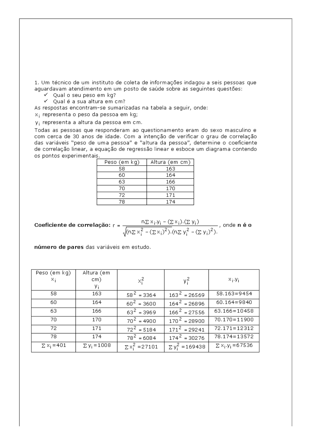 25/08/2020 UNIP - Universidade Paulista : DisciplinaOnline - Sistemas de conteúdo online para Alunos. https://online.unip.br/imprimir/imprimirconteudo 1/12 Conteúdo 1 e 2. Correlação e regressão linear 25/08/2020 UNIP - Universidade Paulista : DisciplinaOnline - Sistemas de conteúdo online para Alunos. https://online.unip.br/imprimir/imprimirconteudo 2/12 25/08/2020 UNIP - Universidade Paulista : DisciplinaOnline - Sistemas de conteúdo online para Alunos. https://online.unip.br/imprimir/imprimirconteudo 3/12 Exercício 1: "Um revendedor de lâmpadas recebeu um grande carregamento de um fabricante, que afirma que as lâmpadas têm uma vida média de 1200 horas. Uma amostra com 10 lâmpadas extraída deste carregamento apresentou média amostral de 1280 horas e s= 120 horas. Os dados indicam que a vida média das baterias recebidas é maior do que 1200 horas anunciados? Realize o teste com 1% de nível de significância. Assuma que a distribuição de lâmpadas seja normal." Observe o problema acima e responda qual a estatística do teste? 25/08/2020 UNIP - Universidade Paulista : DisciplinaOnline - Sistemas de conteúdo online para Alunos. https://online.unip.br/imprimir/imprimirconteudo 4/12 A) 5,607 B) 2,790 C) 1,535 D) 0,210 E) 2,108 O aluno respondeu e acertou. Alternativa(E) Comentários: E) Exercício 2: Observe o problema acima e assinale a alternativa que indica o tipo de teste que deve ser realizado e o ponto crítico. A) unilateral à esquerda e ponto crítico -1,96. B) unilateral à direita e ponto crítico 1,96. C) bilateral e pontos críticos -1,96 e 1,96. D) unilateral à esquerda e ponto crítico -2,25. E) unilateral à direita e ponto crítico 2,25. 25/08/2020 UNIP - Universidade Paulista : DisciplinaOnline - Sistemas de conteúdo online para Alunos. https://online.unip.br/imprimir/imprimirconteudo 5/12 O aluno respondeu e acertou. Alternativa(C) Comentários: C) Exercício 3: Observe o problema e responda qual é a estatística do teste? A) 1,23 B) 2,15 C) -7,15 D) -0,34 E) 0,4548 O aluno respondeu e acertou. Alternativa(D) Comentários: D) Exercício 4: Em uma escola o professor fez uma pesquisa contando com a participação de 5 alunos. Nesta pesquisa foram feitas duas indagações: Quantas horas você estudou para a prova de Matemática? 25/08/2020 UNIP - Universidade Paulista : DisciplinaOnline - Sistemas de conteúdo online para Alunos. https://online.unip.br/imprimir/imprimirconteudo 6/12 Qual nota você tirou na prova de Matemática? Os resultados estão listados a seguir: Tempo de estudo (em horas) xi Nota da Prova yi 0 2 1 5 2 6 3 7 4 10 Qual é a equação da reta de regressão linear? A) y*=1,50xi+7,80 B) y*=1,80xi+2,40 C) y*=-1,50xi+2,78 D D) y*=-1,61xi+7,80 E) y*=0,976xi+7,80 25/08/2020 UNIP - Universidade Paulista : DisciplinaOnline - Sistemas de conteúdo online para Alunos. https://online.unip.br/imprimir/imprimirconteudo 7/12 O aluno respondeu e acertou. Alternativa(B) Comentários: B) Exercício 5: Foi feita uma pesquisa contando com a participação de 6 adolescentes de 14 anos. Nesta pesquisa foram feitas duas indagações: Quantos livros você leu no mês de março? Quantas horas você jogou videogame no mês de março? Os resultados estão listados a seguir: Número de horas jogando videogame Números de livros 10 7 24 5 40 3 50 2 76 1 100 0 Qual é a equação da reta de regressão linear? A) y*=-0,07xi+6,5 B) y*=0,07xi+6,5 25/08/2020 UNIP - Universidade Paulista : DisciplinaOnline - Sistemas de conteúdo online para Alunos. https://online.unip.br/imprimir/imprimirconteudo 8/12 C) y*=-0,95xi+6,5 D) y*=0,95xi+6,5 E) y*=-0,07xi-6,5 O aluno respondeu e acertou. Alternativa(A) Comentários: A) Exercício 6: Foi feita uma pesquisa contando com a participação de 6 adolescentes de 14 anos. Nesta pesquisa foram feitas duas indagações: Quantos livros você leu no mês de março? Quantas horas você jogou videogame no mês de março? Os resultados estão listados a seguir: Número de horas jogando videogame Números de livros 10 7 24 5 40 3 50 2 76 1 25/08/2020 UNIP - Universidade Paulista : DisciplinaOnline - Sistemas de conteúdo online para Alunos. https://online.unip.br/imprimir/imprimirconteudo 9/12 100 0 O gráfico da reta de regressão linear é: A) B) C) 25/08/2020 UNIP - Universidade Paulista : DisciplinaOnline - Sistemas de conteúdo online para Alunos. https://online.unip.br/imprimir/imprimirconteudo 10/12 D) E) 25/08/2020 UNIP - Universidade Paulista : DisciplinaOnline - Sistemas de conteúdo online para Alunos. https://online.unip.br/imprimir/imprimirconteudo 11/12 O aluno respondeu e acertou. Alternativa(E) Comentários: E) Exercício 7: A) uma correlação linear positiva (r=0,91) 25/08/2020 UNIP - Universidade Paulista : DisciplinaOnline - Sistemas de conteúdo online para Alunos. https://online.unip.br/imprimir/imprimirconteudo 12/12 B) uma correlação linear negativa (r=-0,89). C) uma correlação linear perfeita negativa (r=-1). D) uma correlação linear perfeita positiva (r=1). E) não existe correlação entre as variáveis. O aluno respondeu e acertou. Alternativa(D) Comentários: D)