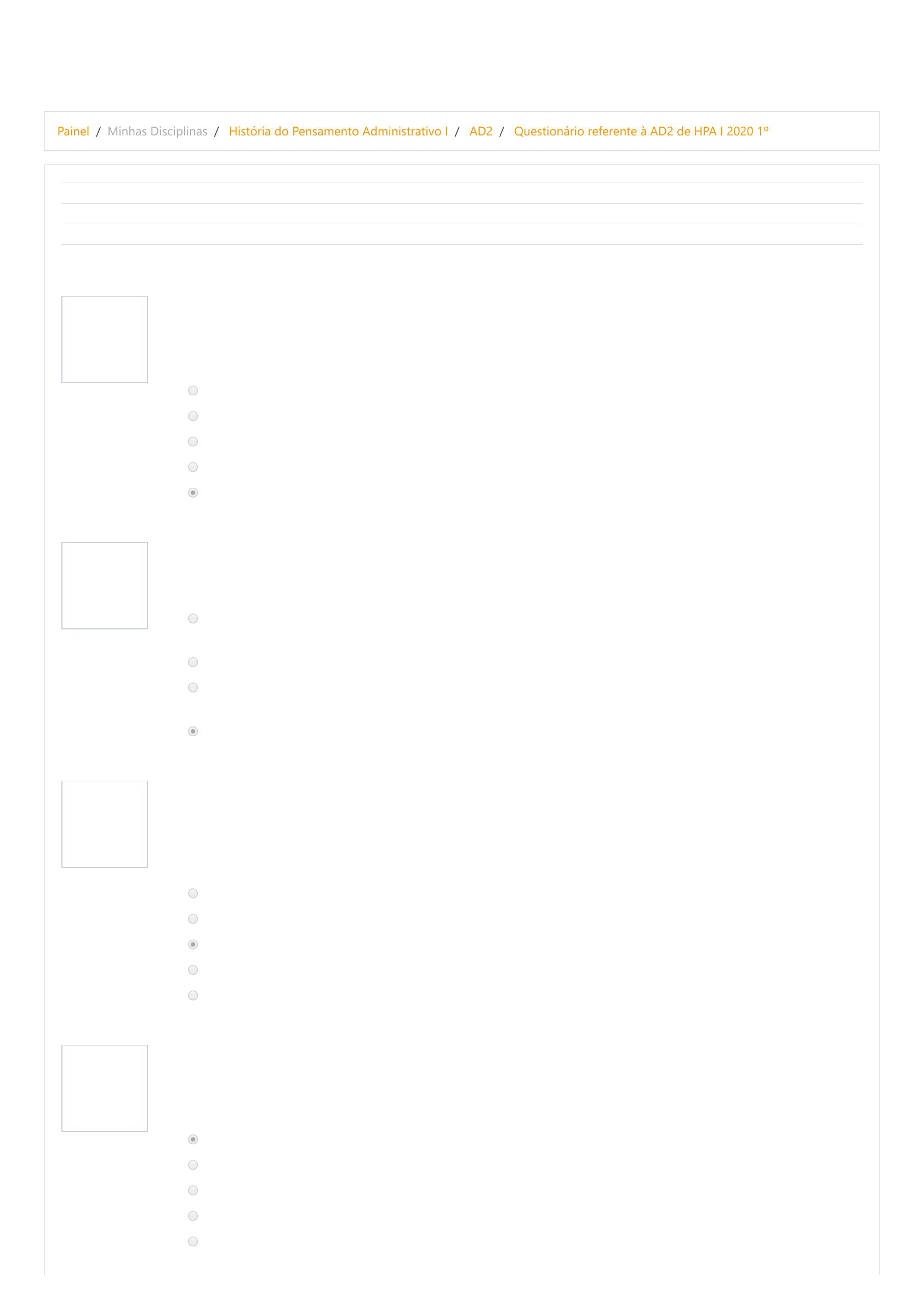 04/05/2020 Questionário referente à AD2 de HPA I 2020 1º: Revisão da tentativa https://graduacao.cederj.edu.br/ava/mod/quiz/review.php?attempt=136032&cmid=174066 1/3 Painel / Minhas Disciplinas / História do Pensamento Administrativo I / AD2 / Questionário referente à AD2 de HPA I 2020 1º Questão 1 Completo Vale 0,40 ponto(s). Questão 2 Completo Vale 0,40 ponto(s). Questão 3 Completo Vale 0,40 ponto(s). Questão 4 Completo Vale 0,40 ponto(s). Iniciado em segunda, 4 mai 2020, 13:06 Estado Finalizada Concluída em segunda, 4 mai 2020, 13:29 Tempo empregado 22 minutos 55 segundos Ao construir um modelo burocrático, Weber não se preocupou com a sua implementação e seus efeitos práticos. Marque a alternativa que corresponde a uma disfunção da burocracia. Escolha uma: a. legalidade b. regras impessoais c. meritocracia d. obediência às leis e. particularismo Dentre as alternativas a seguir, marque aquela que demonstra um princípio adotado pela Teoria das Relações Humanas: Escolha uma: a. os padrões de comportamento e de comunicação, bem como as relações de amizade, pouco influenciam no desempenho da organização; b. o homem é fundamentalmente um ser econômico-racional e não emocional; c. as organizações são formadas por estruturas formais, regras e normas, assim como por práticas e procedimentos informais. d. as organizações são sistemas cooperativos, predominantemente sociais e não mecanicistas. ____________ foi o precursor no estudo dos males da sociedade industrial e dos efeitos nocivos da vida doentia da fábrica na psique dos trabalhadores. O cansaço físico era apenas um sintoma de um problema de maior amplitude. Assinale a alternativa que preenche a lacuna. Escolha uma: a. Herbert Simon b. McGregor c. Elton Mayo d. Mary Parker Follett e. Karl Marx Todo operário verifica a qualidade, identifica e corrige os erros durante o processo. Sempre que necessário, a linha de produção é interrompida para os devidos reparos. Este elemento (característica) compõe o sistema... Escolha uma: a. toyotista. b. sloanista. c. nenhuma das alternativas apresentadas na questão. d. dos seis sigma. e. fordista. https://graduacao.cederj.edu.br/ava/my/ https://graduacao.cederj.edu.br/ava/course/view.php?id=1211 https://graduacao.cederj.edu.br/ava/course/view.php?id=1211§ion=12 https://graduacao.cederj.edu.br/ava/mod/quiz/view.php?id=174066 04/05/2020 Questionário referente à AD2 de HPA I 2020 1º: Revisão da tentativa https://graduacao.cederj.edu.br/ava/mod/quiz/review.php?attempt=136032&cmid=174066 2/3 Questão 5 Completo Vale 0,40 ponto(s). Questão 6 Completo Vale 0,40 ponto(s). Questão 7 Completo Vale 0,40 ponto(s). Questão 8 Completo Vale 0,40 ponto(s). A Teoria das Relações Humanas tem entre suas características dedicar maior atenção a: Escolha uma: a. comunicação, liderança, motivação e dinâmica de grupo. b. comunicação informal, motivação entre os pares, liderança transacional e equipe motivada. c. organização informal, trabalho em equipe, motivação e controle emocional. d. organização formal, motivação, liderança e trabalho em equipe. e. motivação, liderança, organização formal e estrutura industrial por tarefas. São elementos criados ou adotados ao longo da evolução do Sistema de Produção desenvolvido por Henry Ford, exceto: Escolha uma: a. a produção de um único modelo de carro, com uma única cor. b. a produção voltada para o mercado de massa. c. a jornada de trabalho de oito horas. d. o Manual do Proprietário. e. o produto-marca. Conforme nossos estudos na Aula 7, após as leituras dos conteúdos, conhecemos o modelo industrial conhecido como “produção enxuta” e suas principais características. Segundo os analistas industriais, à época, este método de produção seria capaz de proporcionar melhores produtos a um custo mais baixo. Com base neste entendimento, avalie as afirmações disponibilizadas à seguir sobre as características e vantagens da chamada “produção enxuta”. I – Combina a vantagem da produção artesanal e a de massa. II – Reduz os níveis de estoque e produz uma maior variedade de produtos em uma quantidade crescente. III – A fábrica torna-se um local para a busca de aperfeiçoamentos contínuos no processo de produção. Avaliando as afirmações, sinalize dentre as opções abaixo a que podemos citar como correta. Escolha uma: a. Está correta apenas a afirmação III. b. Estão corretas as afirmações I, II e III. c. Estão corretas as afirmações I e III. d. Está correta apenas a afirmação I. e. Está correta apenas a afirmação II. Segundo Karl Emil Maximilian Weber, o Max Weber, o modelo burocrático (por ele desenvolvido) busca uma organização altamente eficiente, pois dispõe de normas e regras, divisão do trabalho, hierarquia de cargos e funcionários capacitados. Este enunciado é... Escolha uma opção: Verdadeiro Falso 04/05/2020 Questionário referente à AD2 de HPA I 2020 1º: Revisão da tentativa https://graduacao.cederj.edu.br/ava/mod/quiz/review.php?attempt=136032&cmid=174066 3/3 Questão 9 Completo Vale 0,40 ponto(s). Questão 10 Completo Vale 0,40 ponto(s). Kaizen é um termo japonês criado para designar um processo contínuo e permanente de melhoria da produção. (1) Este princípio gestor da produção, desenvolvido por Taiichi Ohno, na Toyota, busca o envolvimento de todos os trabalhadores e não requer grandes investimentos. (2) Escolha uma: a. a primeira afirmação (1) é falsa e a segunda (2) afirmação está correta. b. a primeira afirmação (1) é falsa e a segunda (2) afirmação também está errada. c. a primeira afirmação (1) é verdadeira e a segunda (2) afirmação também está correta. d. a primeira afirmação é verdadeira (1) e a segunda (2) afirmação está errada. A sociedade industrial surgiu com o desenvolvimento do taylorismo e do fordismo e pode-se definir o fordismo como um estágio mais avançado do taylo