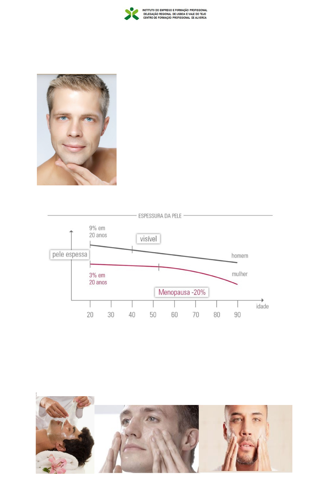 UFCD 3645 – Tratamentos estética masculina Formadora: Esmeralda Lopes Turma : 19019 Aluna: Lúcia Sardo ACTIVIDADE 4 – CARACTERÍSTICAS DA PELE MASCULINA Características da pele masculina A pele masculina tem um envelhecimento biologicamente mais suave e mais subtil que a pele feminina, tem uma espessura densa (aproximadamente 20% mais espessa) , contém mais colagénio, e apresenta um aspeto mais áspero, esticado, firme e grosso. O colagénio da pele masculina diminui a uma velocidade constante, fazendo com que haja um afinamento gradual com o passar dos anos, influenciando diretamente no desenvolvimento de rugas, que nos homens tendem a aparecer mais tarde, porém, mais pronunciadas e marcadas do que nas mulheres. Os homens têm mais glândulas sebáceas e, como tal, mais poros e maiores do que as mulheres. As glândulas sebáceas trabalham mais ativamente na pele masculina, logo, a produção de sebo é maior em comparação com as mulheres, por esse motivo a pele masculina é mais oleosa com aspeto mais brilhante e com tendência a ter impurezas e acne. O pH da pele masculina é também mais ácido (entre 4,5 e 5,5) com maior irrigação sanguínea e maior produção de melanina.
