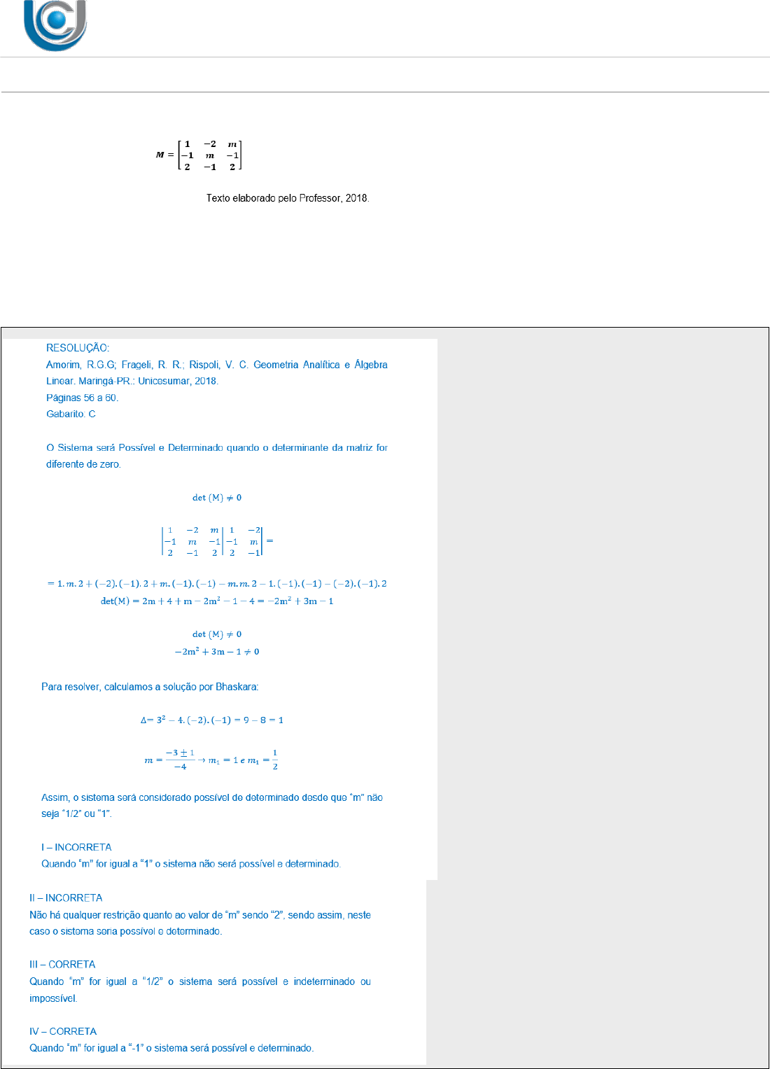 UNICESUMAR - CENTRO UNIVERSITÁRIO CESUMAR PRÉ-VISUALIZAÇÃO DE QUESTÕES QUESTÃO 01 | Objetiva Código: 155758 A inversão de matrizes, o cálculo de determinantes e outros procedimentos realizados com matrizes são muito importantes na resolução de sistemas lineares e usar algumas predefinições pode facilitar na aplicação desses conceitos. Uma determinada empresa conseguiu encontrar uma matriz que traduz o sistema de equações referente a diminuição dos custos de sua produção. Sobre a matriz acima, afirma-se: I) Quando “m” for igual a “1”, o sistema será possível e determinado. II) Quando “m” for igual a “2”, o sistema será impossível. III) Quando “m” for igual a “1/2”, o sistema não será possível e determinado. IV) Quando “m” for igual a “-1”, o sistema será possível e determinado. Estão corretas as afirmativas: Resposta esperada: UNICESUMAR - CENTRO UNIVERSITÁRIO CESUMAR PRÉ-VISUALIZAÇÃO DE QUESTÕES A I, apenas. B II, apenas. C III, apenas. D IV, apenas. E III e IV, apenas UNICESUMAR - CENTRO UNIVERSITÁRIO CESUMAR PRÉ-VISUALIZAÇÃO DE QUESTÕES QUESTÃO 02 | Objetiva Código: 155771 Vetores, geometricamente falando, têm inúmeras aplicações na física, química e matemática. Um dos casos mais comuns de utilização dessas representações é a indicação de forças e campos em determinado corpo ou sistemas. Dado um conjunto de vetores, descritos abaixo, julgue as afirmações. Obs: cada um dos quadrados menores mede uma unidade de medida. Estão corretas: Resposta esperada: UNICESUMAR - CENTRO UNIVERSITÁRIO CESUMAR PRÉ-VISUALIZAÇÃO DE QUESTÕES A Apenas I e III. B Apenas II e IV. C Apenas I, II e IV. D Apenas I e IV. E I, II, III e IV. UNICESUMAR - CENTRO UNIVERSITÁRIO CESUMAR PRÉ-VISUALIZAÇÃO DE QUESTÕES QUESTÃO 03 | Objetiva Código: 155772 Em determinada cidade, a construção de postos de saúde deve obedecer a seguinte regra: a distância entre as unidades básicas de saúde (UBS) deve ser de 5km. Sabendo disso e considerando que o primeiro posto construído está localizado no marco 0 – (0,0) do plano cartesiano – afirma-se: I) Em qualquer ponto, cujo valor “x² + y²” for igual a 5, pode haver um segundo posto. II) Em (x, 4), apenas na posição em que x = 3 ou x = - 3 poderá haver um segundo posto. III) Em (0, y), “y” é obrigatoriamente a posição de coordenada 5 para um segundo posto. IV) Em (5, y), “y” é obrigatoriamente a posição de coordenada igual a 0 para um segundo posto. Estão corretas: Resposta esperada: UNICESUMAR - CENTRO UNIVERSITÁRIO CESUMAR PRÉ-VISUALIZAÇÃO DE QUESTÕES A Apenas I e III. B Apenas I e IV. C Apenas II e III. D Apenas II e IV. E Apenas I, II e III. UNICESUMAR - CENTRO UNIVERSITÁRIO CESUMAR PRÉ-VISUALIZAÇÃO DE QUESTÕES QUESTÃO 04 | Objetiva Código: 155773 Conhecendo a forma de um lote de terra (triangular) e colocando as coordenadas A (10,11,12) e B (4,5,6) em dois dos vértices sobre um terceiro ponto, afirma-se: I) P (7,8,9) é o ponto médio do segmento. II) P (7,8,9) é equidistante de A e B, portanto, corresponde ao terceiro vértice desse triângulo, sendo o triângulo isósceles. III) P (3,3,3) é o ponto médio do segmento. IV) P (13,8,3) é equidistante de A e B, portanto, corresponde ao terceiro vértice desse triângulo, sendo o triângulo isósceles. Estão corretas: Resposta esperada: UNICESUMAR - CENTRO UNIVERSITÁRIO CESUMAR PRÉ-VISUALIZAÇÃO DE QUESTÕES A Apenas I, II e III. B Apenas I e III. C Apenas II e IV. D Apenas I e IV. E Apenas II e III. UNICESUMAR - CENTRO UNIVERSITÁRIO CESUMAR PRÉ-VISUALIZAÇÃO DE QUESTÕES QUESTÃO 05 | Objetiva Código: 155776 Ao se analisar as posições entre pontos do espaço, uma das possibilidades é conferir a cada um deles um conjunto de coordenadas que defina essa posição em relação a uma origem (0,0,0). Uma vez que se defina um determinado ponto e uma determinada distância, pode-se encontrar o conjunto de pontos que está à distância determinada do ponto definido. Sendo assim, se estivermos interessados em avaliar quais os pontos estão a uma distância de 25 unidades da origem e respeitam a estrutura P = (x,12,16): I) Encontramos que a única possibilidade é (15,12,16). II) Encontramos que uma possibilidade é (5,2,6). III) Encontramos que uma possibilidade é (15,12,16). IV) Encontramos que uma possibilidade é (-15,12,16). É correto o que afirma-se em: Resposta esperada: UNICESUMAR - CENTRO UNIVERSITÁRIO CESUMAR PRÉ-VISUALIZAÇÃO DE QUESTÕES A I, apenas. B II, apenas. C III, apenas. D III e IV, apenas. E II, III e IV, apenas. UNICESUMAR - CENTRO UNIVERSITÁRIO CESUMAR PRÉ-VISUALIZAÇÃO DE QUESTÕES QUESTÃO 06 | Objetiva Código: 232445 Ao se estudar matrizes e sistemas lineares, alguns cálculos são muito recorrentes, dentre eles, encontrar o determinante da matriz e sua matriz inversa. Uma determinada empresa conseguiu encontrar uma matriz que traduz o sistema de equações referente a sua produção: Texto elaborado pelo Professor, 2019. Sobre a matriz acima, afirma-se: I) Quando “a” for igual a “1”, o determinante da matriz será 0. II) Quando “a” for igual a “ - 9”, o determinante da matriz será 0. III) Quando “a” for igual a “2”, determinante da matriz será “14”. IV) Quando “a” for igual a “0”, a matriz inversa será Estão corretas as afirmativas: Resposta esperada: UNICESUMAR - CENTRO UNIVERSITÁRIO CESUMAR PRÉ-VISUALIZAÇÃO DE QUESTÕES A I, II e III, apenas. B I, II e IV, apenas. C I, III e IV, apenas. D II, III e IV, apenas. E I, II, III e IV. UNICESUMAR - CENTRO UNIVERSITÁRIO CESUMAR PRÉ-VISUALIZAÇÃO DE QUESTÕES QUESTÃO 07 | Objetiva Código: 232447 Uma empresa, ao realizar compras fez os seguintes pedidos: Primeiro pedido: dez itens X e vinte itens Y. o que custou R$ 500,00; Segundo pedido: quinze itens X e cinco itens Y, o que custou R$ 250,00. Texto elaborado pelo Professor, 2019. Sobre a situação a