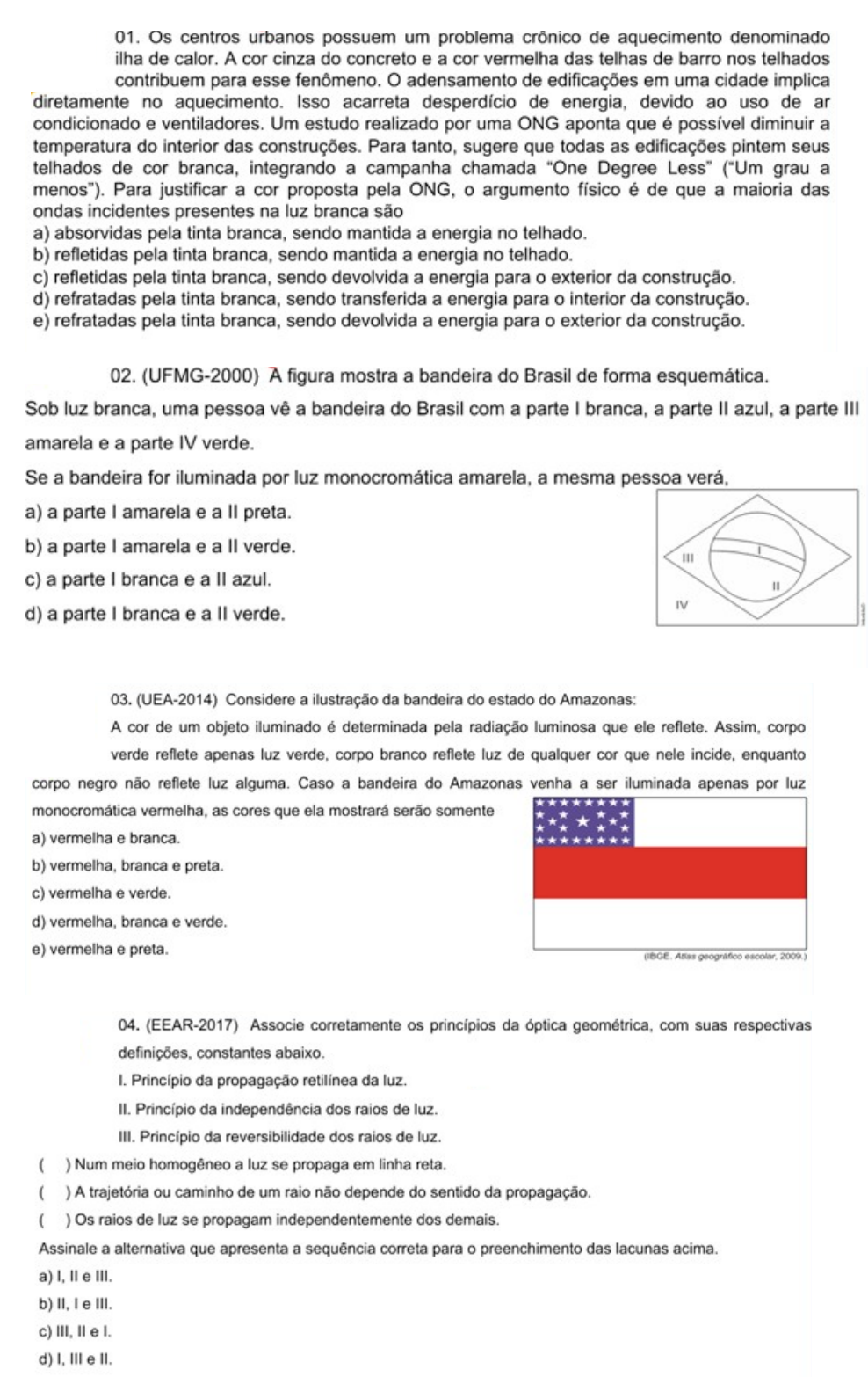 Um raio luminoso incide sobre dois espelhos planos X e Y, dispostos em paralelo como mostra a figura abaixo. Sendo N a normal ao espelho X no ponto de incidência do raio luminoso, é correto afirmar que os ângulos α e β medem, respectivamente: *120º e 30º. 110º e 70º. 120º e 60º. 150º e 60º. 150º e 30º. Um raio de luz incide sobre uma superfície de um espelho plano conforme mostra a figura: Sabendo-se que AB = 2√3 m , calcule a que distância do espelho o raio refletido atinge a parede. 3 m 4 m 5 m 2 m *6 m Na figura temos dois espelhos planos, E1 e E2, cujas superfícies refletoras formam entre si um ângulo de 60º. Um raio de luz incide no espelho E1 e, após se refletir, vai incidir em E2. Qual o ângulo que este último raio refletido forma com E2? 60º 10º 40º 30º *80º Um feixe de luz entra no interior de uma caixa retangular de altura L, espelhada internamente, através de uma abertura A. O feixe, após sofrer 5 reflexões, sai da caixa por um orifício B depois de decorrido 10-8 segundos. Os ângulos formados pela direção do feixe e o segmento AB estão indicados na figura adiante. Calcule o comprimento do segmento AB. O que acontece com o número de reflexões e o tempo entre a entrada e a saída do feixe, se diminuirmos a altura da caixa L pela metade? Adote: velocidade da luz = 3.108 m/s. 1,5 m. Passa de 5 para 11 e o tempo não se altera. 3,0 m. Passa de 5 para 10 e o tempo cai pela metade. *1,5 m. Passa de 5 para 10 e o tempo não se altera. 3,0 m. Passa de 5 para 11 e o tempo não se altera. 1,5 m. Passa de 5 para 11 e o tempo cai pela metade. (SBF-SP-2007) Vejam a palavra AMBULÂNCIA escrita na foto a seguir de duas maneiras, aquela da parte dianteira é vista corretamente do espelho retrovisor de um automóvel. Dizemos que algumas letras não mudam quando colocadas na frente do espelho, enquanto outras mudam, estas que não mudam são chamadas de invariantes por reflexão especular. Você poderia dizer quantas letras maiúsculas do alfabeto português não mudam em frente a um espelho? Inclua as letras K, W e Y e, como se vê, estas duas últimas são invariantes por reflexão. 9 10 12 *11 13 A figura representa um espelho plano E vertical e dois segmentos de reta AB e CD perpendiculares ao espelho: Supondo que um raio de luz parta de A e atinja C por reflexão no espelho, o ponto de incidência do raio de luz no espelho dista de D, em centímetros: *32 48 24 16 40 Um rapaz de 1,80 m de altura vê todo o seu corpo refletido num espelho plano vertical, situado a uma distância CD = 3 m. Os olhos do rapaz encontram-se a 1,70 m do solo. O comprimento mínimo AB que tem esse espelho e sua posição BC em relação ao solo são respectivamente: 1,80 m e zero 0,80 m e 0,75 m 1,70 m e 0,10 m *0,90 m e 0,85 m 1,50 m e 0,50 m Dois espelhos foram colocados um de frente para o outro, separados por uma distância de 3 m, conforme a figura a seguir. Uma pessoa fica posicionada entre os espelhos a 1 m do espelho da direita (d) e a 2 m do espelho da esquerda (e). Qual a distância entre a pessoa e a segunda imagem formada no espelho da direita? 4,0 m 8,0 m *6,0 m 10,0 m 2,0 m