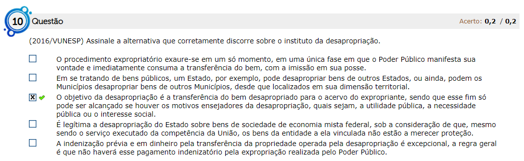 (2016/VUNESP) Assinale a alternativa que corretamente discorre sobre o instituto da desapropriação. O procedimento expropriatório exaure-se em um só momento, em uma única fase em que o Poder Público m