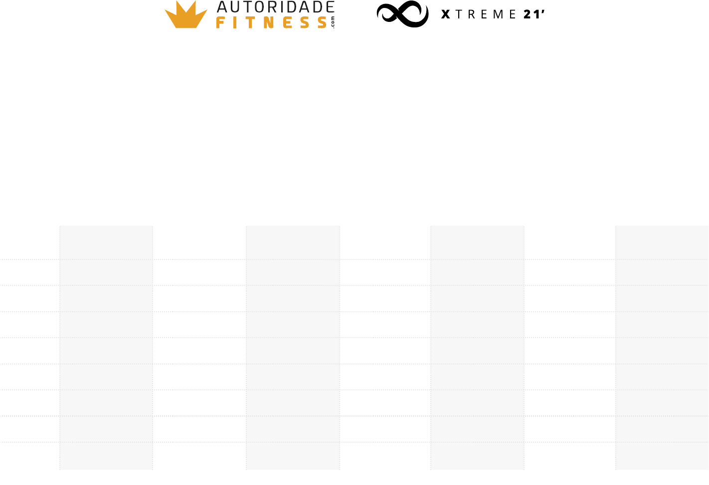 Semana Terça-feira Quinta-feira Sábado 1 Body Control Total Core Low Body Limit Fat Burn Fight Xtreme Circuit X-Combo Yoga / Descanso 2 Low Body Limit Power Mixed Xtreme Circuit Total Core X-Combo X-Abs / Boombum / Yoga Yoga / Descanso 3 Xtreme Circuit Fat Burn Fight Body Control Power Mixed Low Body Limit X-Abs / Boombum / Yoga Yoga / Descanso 4 Total Core Body Control Power Mixed Fat Burn Fight X-Combo X-Abs / Boombum / Yoga Yoga / Descanso 5 Body Control Total Core Low Body Limit Fat Burn Fight Xtreme Circuit X-Combo Yoga / Descanso 6 Low Body Limit Power Mixed Xtreme Circuit Total Core X-Combo X-Abs / Boombum / Yoga Yoga / Descanso 7 Low Body Limit Power Mixed Xtreme Circuit Total Core X-Combo X-Abs / Boombum / Yoga Yoga / Descanso 8 Total Core Body Control Power Mixed Fat Burn Fight X-Combo X-Abs / Boombum / Yoga Yoga / Descanso Segunda-feira Quarta-feira Sexta-feira Domingo Seja bem vindo(a) ao Xtreme 21! Essa é a agenda padrão que o Sérgio criou para otimizar os resultados do Xtreme. Você já pode começar a treinar agora mesmo. Além disso, dentro das próximas 48 horas, seu coach da equipe Autoridade Fitness vai ligar para você para personalizar a sua agenda de treinos e adaptá-la à sua rotina. Nós da Autoridade Fitness acreditamos muito no poder da personalização dos treinos. O que queremos dizer com personalização? Um profissional de Educação Física vai estar junto com você pelo próximos 30 dias, adaptando a sua rotina de treinamento e descansos aos seus objetivos pessoais para otimizar os SEUS resultados. OBSERVAÇÕES IMPORTANTES 1) Se 21 minutos for muito intenso para o começo, inicie com alguma das aulas Lights de 7 minutos. Elas foram pensadas para a adaptação do seu corpo ao X21. Comece com uma aula, progrida para duas aulas com intervalo de 2 minutos entre elas, até completar as três aulas de 7 minutos em sequência; 2) Após cada treino finalizado o ideal é a aula Cool Down, para relaxar e distensionar sua musculatura; 3) Se em algum dos dias a sua musculatura estiver excessivamente cansada para 21 minutos, faça uma aula Light de 7 minutos seguida da aula de Cool Down, OU faça a prática de Yoga. Mas não fique parado(a): seu corpo se recupera mais rápido em movimento do que em repouso; 4) Aos sábados, faça a aula X-Abs, OU Boombum, OU Yoga; 5) Aos domingos, faça um dia de descanso para o seu corpo, ou faça a aula regenerativa de Yoga; 6) Caso você não receba uma ligação do seu coach em 48h, envie um e-mail para contato@xtreme21.com; 7) Caso você tenha algum feedback a respeito do acompanhamento Autoridade Fitness, envie um e-mail a qualquer momento ao longo do mês para o Maurício, que é o coordenador do acompanhamento, no e-mail mauricio@autoridadefitness.com. A partir de agora estamos juntos para alcançar os seus objetivos! Segue firme, e bom treino!