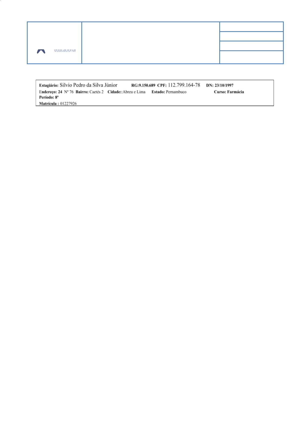 TERMO DE COMPROMISSO DE ESTÁGIO CURRICULAR OBRIGATÓRIO Número: GES-FOR-55 Aprovação: Diretoria Adjunta de Estágio Versão 00 (Comprovante de Inexistência de Vínculo empregatício) Art. 3, Lei Nº 11.788, de 25 de Setembro de 2008 Instituição de Ensino: GRUPO SER EDUCACIONAL Endereço: Rua Guilherme Pinto, 114 Bairro: Graças Cidade: Recife Estado: PE CNPJ: 04.986.320/0001-13 Representante: Jânyo Janguiê Bezerra Diniz Unidade Concedente: Endereço: Bairro: Cidade: Estado: CNPJ: Representado por: Cargo: As partes nominadas, qualificadas e identificadas acima têm por justo e acordado, através do presente TERMO DE COMPROMISSO, a realização de ESTÁGIO CURRICULAR OBRIGATÓRIO, pelas disposições da Lei Nº 11.788, de 25 de Setembro de 2008 e pelas cláusulas e condições adiante estabelecidas e reciprocamente aceitas. I – DO ESTÁGIO I-1 – Definição: (a) é o ato educativo escolar supervisionado, desenvolvido no ambiente de trabalho, com jornada não superior a seis (6) horas diárias e 30 horas semanais; (b) é parte integrante do Projeto Pedagógico do Curso, bem como do itinerário formativo do ESTAGIÁRIO; (c) visa ao aprendizado de competências próprias da atividade profissional e a contextualização curricular, objetivando o desenvolvimento do ESTAGIÁRIO; (d) não cria vinculo empregatício entre ESTAGIÁRIO e UNIDADE CONCEDENTE, por expressa disposição do Art. 3º da Lei Nº 11.788, de 25 de setembro de 2008. II – DAS OBRIGAÇÕES DAS PARTES II-1 – Obriga-se a INSTITUIÇÃO DE ENSINO a: (a) verificar as instalações da UNIDADE CONCEDENTE, quanto a sua adequação à formação cultural e profissional do educando; (b) indicar professor, da área a ser desenvolvida no estágio, como responsável pelo acompanhamento e avaliação das atividades do ESTAGIARIO; (c) exigir do ESTAGIÁRIO a apresentação, semestralmente do relatório das atividades por ele desenvolvidas no estágio; (d) comunicar a UNIDADE CONCEDENTE, no início do período letivo, as datas de realização de avaliações acadêmicas, para efeito de redução à metade da carga horário do estágio; (e) celebrar aditivos com a UNIDADE CONCEDENTE e o ESTAGIÁRIO, para incorporar o plano de atividades, ao termo de compromisso; (f) comunicar a UNIDADE CONCEDENTE, a conclusão, desistência ou abandono de curso, bem como o trancamento da matrícula ou a perda do vinculo acadêmico, a qualquer outro titulo, pelo ESTAGIÁRIO; (g) contratar em favor do ESTAGIÁRIO, seguro contra acidentes pessoais de Apólice Nº. 524397, Seguradora SulAmerica; II-2 – Obriga-se a UNIDADE CONCEDENTE a: (a) zelar pelo cumprimento do presente Termo de Compromisso; (b) manter as suas instalações ofertadas para o estágio nas condições de proporcionar ao ESTAGIARIO atividades de aprendizagem social, profissional e cultural; (c) Indicar funcionário do seu quadro de pessoal, com formação ou experiência profissional na área do conhecimento desenvolvida no curso do ESTAGIARIO, para orientar e supervisionar as respectivas atividades do estágio, ações estas que não podem, simultaneamente, ser dirigidas a mais de 10 (dez) ESTAGIÁRIOS; (d) quando do desligamento do ESTAGIARIO, entregar termo de realização do estágio com indicação resumida de atividades desenvolvidas, dos períodos e das avaliação de desempenho; (e) manter à disposição da fiscalização documentos que comprovem a relação de estágio; (f) aplicar ao ESTAGIÁRIO legislação referente a medicina do trabalho. II-3 – Obriga-se ao ESTAGIÁRIO a: (a) cumprir, fielmente, a jornada de estágio; (b) exercer as atividades constantes no plano de estágio, acatando as recomendações e instituições; (c) observar o regulamento do estágio do curso e demais normas da INSTITUIÇÃO DE ENSINO, bem como as normas internas da UNIDADE CONCEDENTE; (d) comunicar a UNIDADE CONCEDENTE e a INSTITUIÇÃO DE ENSINO qualquer fato relevante ocorrido no seu estágio, inclusive e sobretudo se implicar na extinção ou suspensão do seu vinculo acadêmico; (e) elaborar e entregar à INSTITUIÇÃO DE ENSINO, semestralmente, relatório das atividades desenvolvidas no estágio; (f) comunicar a INSTITUIÇÃO DE ENSINO qualquer alteração ou modificação do estabelecimento neste termo de compromisso, zelando pelo seu respectivo cumprimento. III – DA CARACTERIZAÇÃO E DEFINIÇÃO DO ESTÁGIO (a) Horário: XXX HORAS DIÁRIAS (b) Duração do estágio / / A / / (c) Carga horária semanal: HORAS (d) Benefícios: Sem benefícios (e) Bolsa auxilio: Sem Bolsa auxílio (f) Local do estágio: (g) Departamento: (NOME DO CURSO) (h) Orientador: NOME E CONSELHO DO PRECEPTOR (i) Cargo do Orientador: (j) Plano de atividades: Conforme Plano de Atividades para estágio curricular do curso da IES. TERMO DE COMPROMISSO DE ESTÁGIO CURRICULAR OBRIGATÓRIO Número: GES-FOR-55 Aprovação: Diretoria Adjunta de Estágio Versão 00 IV – DA VINGÊNCIA (a) IV-1 – A vigência do presente Termo de Compromisso do Estágio é de / / A / / , podendo, porém ser denunciado por ambas as partes a qualquer tempo, unilateralmente. }JJJJJJJJJJJJJJJJJJJJJJJJJJJJJJJJJJJJJJJJJJJJJJJJJJJJJJJJ De acordo, Testemunhas: 2