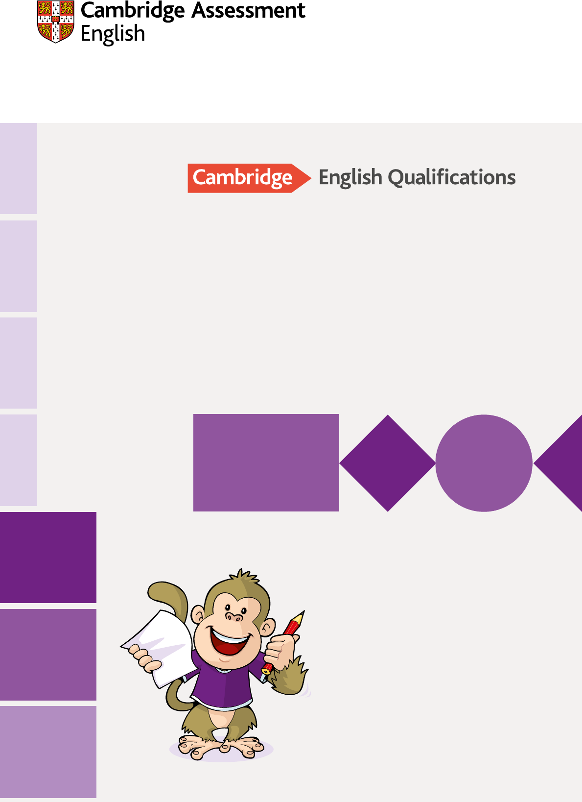 Copyright © UCLES 2018 | CER/2603/8Y04 *9723357231* B1 C2 C1 A2 A1 Pre A1 B2 Volume Sample papers For exams from 2018 Pre A1 Starters, A1 Movers and A2 Flyers All details are correct at the time of going to print in April 2018. Cambridge Assessment English The Triangle Building Shaftesbury Road Cambridge CB2 8EA United Kingdom cambridgeenglish.org /cambridgeenglish /cambridgeenglishtv /cambridgeeng /cambridgeenglish We are Cambridge Assessment English. Part of the University of Cambridge, we help millions of people learn English and prove their skills to the world. For us, learning English is more than just exams and grades. It’s about having the confidence to communicate and access a lifetime of enriching experiences and opportunities. With the right support, learning a language is an exhilarating journey. We’re with you every step of the way. 1 http://www.cambridgeenglish.org https://www.facebook.com/CambridgeEnglish https://www.youtube.com/user/cambridgeenglishtv https://twitter.com/CambridgeEng https://www.instagram.com/cambridgeenglish/ 1 Pre A1 Starters Listening 3 Marking key 10 Tapescript 11 Reading and Writing 15 Marking key 23 Speaking 24 A1 Movers Listening 27 Marking key 36 Tapescript 37 Reading and Writing 41 Marking key 56 Speaking 57 A2 Flyers Listening 61 Marking key 69 Tapescript 70 Reading and Writing 75 Marking key 89 Speaking 91 Contents 2 Cambridge Assessment English Introduction Pre A1 Starters, A1 Movers and A2 Flyers are designed specifically for young learners aged 6–12. They are fun, colourful and activity based, motivating children to learn. All three of the qualifications are aligned with the Common European Framework of Reference (CEFR) published by the Council of Europe, and demonstrate real-life communication skills. About these sample papers These sample papers show you what the three exams look like. When children know what to expect, they will feel more confident and prepared. Listening sample tests To download the Listening sample tests go to: Pre A1 Starters cambridgeenglish.org/starters-audio-sample-v1 A1 Movers cambridgeenglish.org/movers-audio-sample-v1 A2 Flyers cambridgeenglish.org/flyers-audio-sample-v1 For more information about the exams and for more sample papers go to: cambridgeenglish.org/starters cambridgeenglish.org/movers cambridgeenglish.org/flyers Schools BA SI C IN D EP EN D EN T PR O FI C IE N T C2 C1 B2 B1 A2 A1 A1 Pre Cambridge English Scale Common European Framework of Reference (CEFR) 80 90 100 110 120 130 140 150 160 170 180 190 200 210 220 230 A1 Movers A2 Key for Schools B1 Preliminary for Schools Pre A1 Starters B2 First for Schools C1 Advanced C2 Proficiency A2 Flyers Yo un g Le ar ne rs http://www.cambridgeenglish.org/starters-audio-sample-v1 http://www.cambridgeenglish.org/movers-audio-sample-v1 http://www.cambridgeenglish.org/flyers-audio-sample-v1 http://www.cambridgeenglish.org/starters http://cambridgeenglish.org/movers http://cambridgeenglish.org/flyers Pr e A 1 St ar te rs L is te ni ng Pre A1 Starters 3 Centre Number Candidate Number Pre A1 Starters Listening There are 20 questions. You have 20 minutes. You will need a pen or pencil. My name is: .................................................................... Copyright © UCLES 2018 Download the audio files for the sample paper here: cambridgeenglish.org/starters-audio-sample-v1 http://www.cambridgeenglish.org/starters-audio-sample-v1-from-2018 http://www.cambridgeenglish.org/starters-audio-sample-v1-from-2018 4 Cambridge Assessment English Pre A 1 Starters Listening 3 Part 1 – 5 questions – Listen and draw lines. There is one example. Sue Ann Lucy Nick Pat Jill Dan Pr e A 1 St ar te rs L is te ni ng Pre A1 Starters 54 Part 2 – 5 questions – Read the question. Listen and write a name or a number. There are two examples. Examples What is the new girl’s name? Kim.................................. How old is the new girl? 8.................................. 6 Cambridge Assessment English Pre A 1 Starters Listening 5 Questions 1 What is Kim’s family name? .................................. 2 Where does Kim live? in ......................Street 3 What number is Kim’s house? .................................. 4 What is the name of Kim’s horse? .................................. 5 How old is Kim’s horse? .................................. Pr e A 1 St ar te rs L is te ni ng Pre A1 Starters 76 Part 3 – 5 questions – Listen and tick ( ) the box. There is one example. What animal has Alex got in his bedroom? A B C 1 Which picture are May and Sam looking at? A B C 2 What are Mrs Good’s class doing this afternoon? A B C 8 Cambridge Assessment English Pre A 1 Starters Listening 7 3 What is Mum’s favourite fruit? A B C 4 Which dog is Anna’s? A B C 5 What is Lucy wearing? A B C Pr e A 1 St ar te rs L is te ni ng Pre A1 Starters 9 8 Part 4 – 5 questions – Listen and colour. There is one example. 10 Cambridge Assessment English Pre A 1 Starters Listening Pre A1 Starters Listening Marking key Part 1 5 marks Lines should be drawn between: 1 Lucy girl behind tree 2 Jill girl feeding ducks 3 Dan boy with kite 4 Ann girl reading 5 Nick boy on bike Part 2 5 marks 1 W-A-L-L 2 S-U-N 3 15/fifteen 4 T-I-G-E-R 5 7/seven Part 3 5 marks 1 B 2 A 3 A 4 B 5 C Part 4 5 marks 1 Colour balloon in boy’s hand – yellow 2 Colour balloon between boxes – pink 3 Colour balloon under table – green 4 Colour balloon on chair – brown 5 Colour balloon behind cat – orange ( ) = Acceptable extra words are placed in brackets / = A single slash is placed between acceptable alternative words within an answer Pr e A 1 St ar te rs L is te ni ng Pre A1 Starters 11 R = rubric F = Female adult M = Male adult Fch = Female child Mch = Male child Pre A1 Starters Listening Tapescript R Hello. This is the Cambridge English Starters Listening sample test. [MUSIC] Look at Part 1. Look at the picture. Listen and look. There is one example. PAUSE 00’03” Mch Here’s a photo o