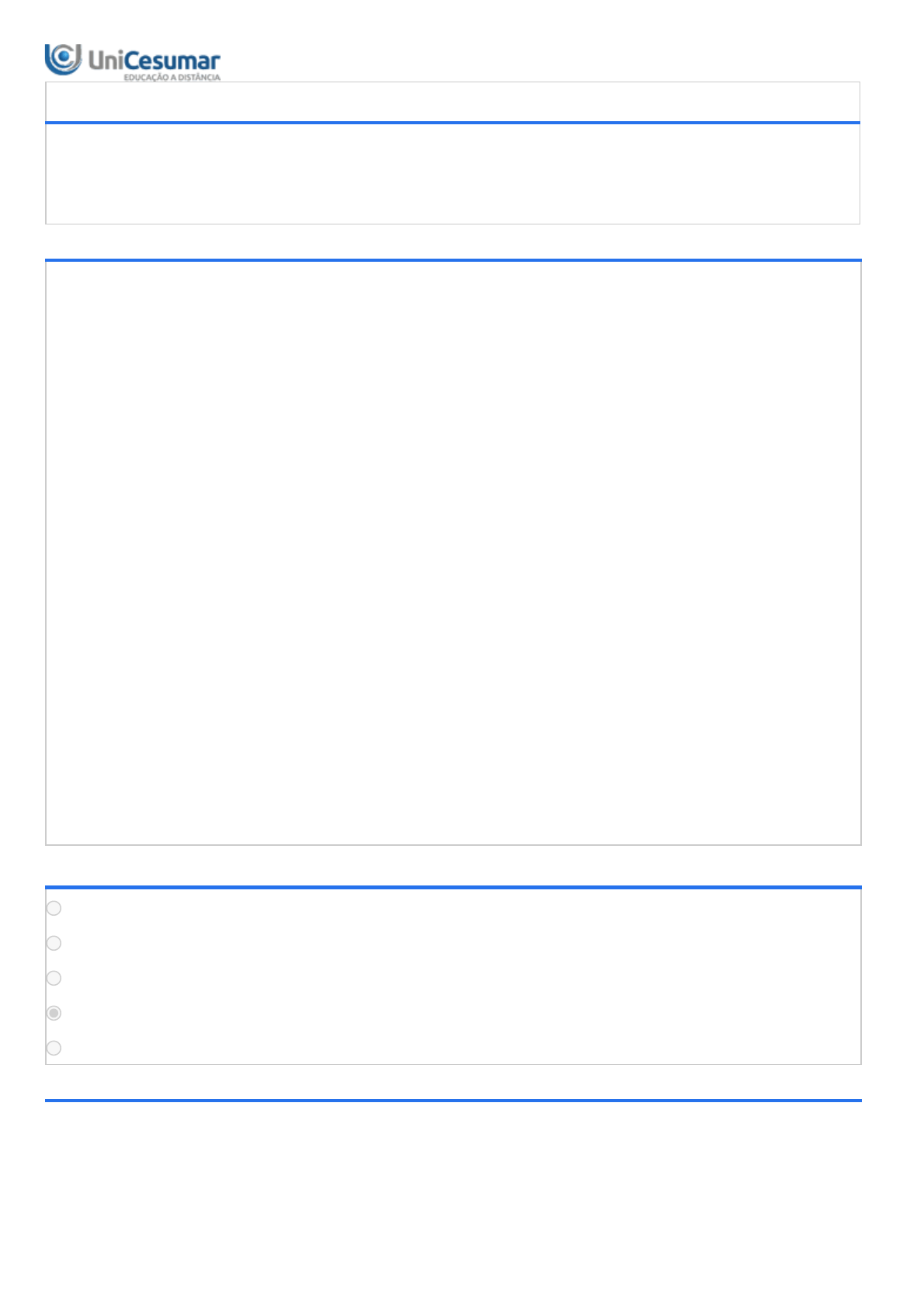 07/09/2020 Unicesumar - Ensino a Distância 1/7 ATIVIDADE 2 - BEDU - INTERVENÇÃO PROFISSIONAL EM EDUCAÇÃO FÍSICA- 2020C1 Período:31/08/2020 08:00 a 18/09/2020 23:59 (Horário de Brasília) Status:ABERTO Nota máxima:0,50 Gabarito:Gabarito será liberado no dia 19/09/2020 00:00 (Horário de Brasília) Nota obtida: 1ª QUESTÃO As habilidades são essenciais a atuação profissional em Educação Física, e compreendem uma parte importante das dimensões de competência profissional propostas por Feitosa e Nascimento (2003; 2006), e inclui diversas habilidades. Sabemos que as habilidades perpassam o saber fazer apenas, e acabam por englobar conhecimentos, atitudes (saber ser) e a prática (saber agir) proveniente da experiência. TEIXEIRA, F. C.; BELEM, I. C. Intervenção Profissional em Educação Física. Maringá - PR.:Unicesumar, 2019. Considerando as habilidades propostas por Feitosa e Nascimento (2003; 2006) baseado no livro didático, associe os conceitos relacionando às habilidades a suas características ou explicações/definições. (1) Planejamento (2) Comunicação (3) Avaliação (4) Incentivação (5) Gestão ( ) Capacidade de transmitir os conteúdos de forma clara e sucinta. ( ) Saber organizar e gerir os recursos, sejam eles pessoais, materiais ou temporais ( ) Influenciar o interesse e a motivação dos alunos/atletas para a realização dos exercícios. ( ) Organização e estruturação das atividades, assim como antecipação de situações que podem ocorrer e dos resultados. ( ) Analisar o desempenho, realizar a correção dos erros e propiciar informações pertinentes para a correção da execução das atividades. A sequência correta desta classificação é: ALTERNATIVAS 1, 2, 3, 4, 5. 2, 3, 1, 4, 5. 1, 3, 2, 5, 4. 2, 5, 4, 1, 3. 2, 4, 5, 1, 3. 2ª QUESTÃO 07/09/2020 Unicesumar - Ensino a Distância 2/7 O treinador é peça fundamental no processo desportivo, por ser o responsável pelo desenvolvimento e bem-estar dos atletas. Quando se trato do treinamento esportivo para crianças e jovens, estudos internacionais têm apontado a necessidade de alicerçar os treinamentos, de modo a conduzir ao desenvolvimento positivo no âmbito esportivo. Para isso, o treinador deve estar preparado, o que exige diversidade de conhecimentos profissionais, interpessoais e intrapessoais TEIXEIRA, F. C.; BELEM, I. C. Intervenção Profissional em Educação Física. Maringá - PR.:Unicesumar, 2019. Considerando a atuação do treinador/técnico para o Desenvolvimento Positivo do Joven atleta, é correto o que se afirma em: ALTERNATIVAS Os treinadores devem focar seu trabalho no desenvolvimento das capacidades físicas, uma vez que estes são os aspectos mais importantes para o esporte. Os treinos devem ser pensados de modo a trabalhar também com intervenções psicológicas realizadas pelo treinador, a fim de promover o bem-estar dos atletas. Os treinadores consideraram que o mais importante é o trabalho lúdico durante os treinamentos, pois isto proporciona experiências positivas e acaba motivando os atletas. O treinador não deve se preocupar com as relações interpessoais, isto porque este aspecto exerce pouca ou nenhuma influência no processo de desenvolvimento dos jovens atletas. O treinador deve ser capaz de criar um ambiente que promova o progresso em seus atletas, estando então preparado, o que exige uma diversidade de conhecimentos profissionais, interpessoais e intrapessoais, além dos conhecimentos específicos do esporte. 3ª QUESTÃO Sabe-se que aspectos psicológicos estão relacionados ao bom desempenho esportivo, ou ainda a adesão e participação em programas de exercício físico. Deste modo é importante que o profissional de Educação Física possua conhecimentos a respeito das avaliações possíveis de serem realizadas quanto a estas variáveis. TEIXEIRA, F. C.; BELEM, I. C. Intervenção Profissional em Educação Física. Maringá - PR.: Unicesumar, 2019 Considerando as avaliações psicológicas que podem ser realizadas, avalie as asserções e assinale V para verdadeiro e F para falso: I. Uma das funções do profissional de Educação Física é estar apto para o trabalho com intervenções psicológicas junto a seus atletas/alunos. II. Todos os instrumentos voltados à análise de variáveis podem ser utilizados pelos profissionais de Educação Física, não sendo necessário ter o auxílio de um psicólogo. III. É importante que o profissional de Educação Física conheça instrumentos que possa utilizar em sua intervenção a fim de detectar comportamentos positivos e negativos de seus atletas/alunos. IV. A avaliação de variáveis psicológicas é essencial para os profissionais de Educação Física, visto que ao identificar comportamentos diferentes possa encaminhar seus atletas/alunos para os profissionais responsáveis. As afirmações I, II, III e IV são, respectivamente: ALTERNATIVAS 07/09/2020 Unicesumar - Ensino a Distância 3/7 F, F, V, V. V, V, V, V. V, F, F, V. F, F, F, F. F, V, V, V. 4ª QUESTÃO Diversas teorias têm sido utilizadas para a compreensão e investigação da competência profissional. Embora a diversidade de teorias, alguns autores buscam demonstrar como diversos fatores devem ser considerados para a compreensão e desenvolvimento das competências. TEIXEIRA, F. C.; BELEM, I. C. Intervenção Profissional em Educação Física. Maringá - PR.:Unicesumar, 2019. Com relação ao Modelo de Competência Profissional, verifique as proposições a seguir: I. A reflexão é um dos pontos principais no que se refere à competência profissional. Isto porque, esta permite ao profissional analisar suas ações. II. Os resultados da competência profissional podem ser constatados pelo próprio sujeito, seus pares ou por meio do feedback. A percepção desses resultados pode se dar de forma macro, micro e parcial. III. As metacompetências e transcompetências citadas no modelo são gerais a todas as profissões, p