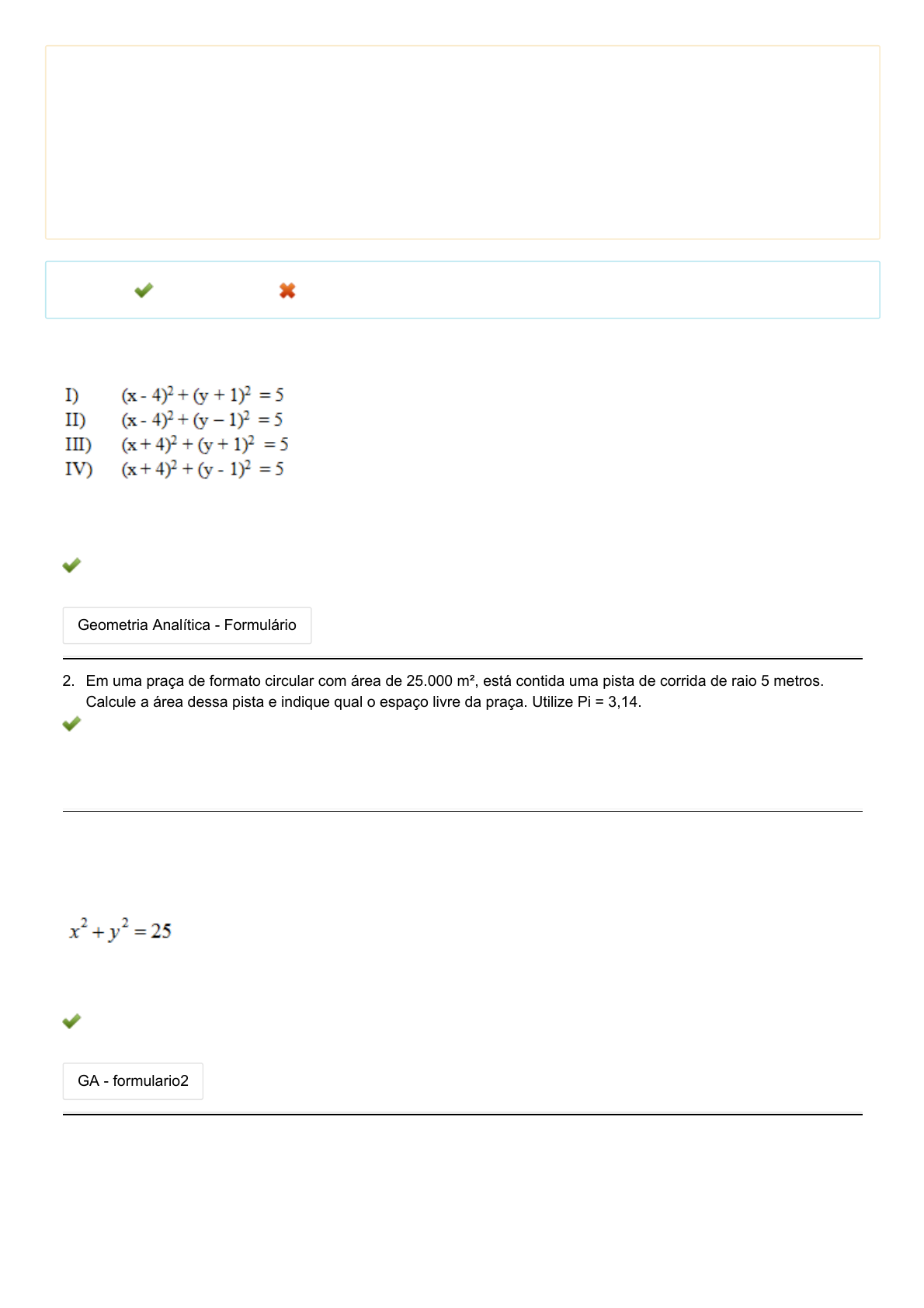 07/09/2020 UNIASSELVI - Centro Universitário Leonardo Da Vinci - Portal do Aluno - Portal do Aluno - Grupo UNIASSELVI https://portaldoalunoead.uniasselvi.com.br/ava/notas/request_gabarito_n2.php 1/4 Acadêmico: Jaqueline Kologeski (1482823) Disciplina: Geometria Analítica (MAT20) Avaliação: Avaliação II - Individual FLEX ( Cod.:514283) ( peso.:1,50) Prova: 21437704 Nota da Prova: 10,00 Legenda: Resposta Certa Sua Resposta Errada 1. Os pontos A(2, - 2 ) e B(6, 0) são as extremidades do diâmetro de uma circunferência de centro C(a, b) e raio r. Determine a equação reduzida dessa circunferência e assinale a alternativa CORRETA: a) A opção II está correta. b) A opção III está correta. c) A opção IV está correta. d) A opção I está correta. Anexos: Geometria Analítica - Formulário 2. Em uma praça de formato circular com área de 25.000 m², está contida uma pista de corrida de raio 5 metros. Calcule a área dessa pista e indique qual o espaço livre da praça. Utilize Pi = 3,14. a) O espaço livre é de 24.921,50 m². b) O espaço livre é de 24.968,60 m². c) O espaço livre é de 78,5 m². d) O espaço livre é de 31,40 m². 3. Em geometria, denomina-se corda como sendo o segmento de reta que une dois pontos de uma seção cônica. Quando a corda numa circunferência coincide com seu centro, recebe o nome particular de diâmetro. Com base nisso, qual o comprimento da corda determinada pela reta x - y = 0 sobre a circunferência representada pela equação a seguir? a) O comprimento da corda vale 8 unidades de comprimento. b) O comprimento da corda vale 6 unidades de comprimento. c) O comprimento da corda vale 12 unidades de comprimento. d) O comprimento da corda vale 10 unidades de comprimento. Anexos: GA - formulario2 https://portaldoalunoead.uniasselvi.com.br/extranet/layout/request/imag_prova_ead_anexo_n2.php?action1=MjE0Mzc3MDQ=&action2=NTI5MjU3 https://portaldoalunoead.uniasselvi.com.br/extranet/layout/request/imag_prova_ead_anexo_n2.php?action1=MjE0Mzc3MDQ=&action2=NTI5MjU4 07/09/2020 UNIASSELVI - Centro Universitário Leonardo Da Vinci - Portal do Aluno - Portal do Aluno - Grupo UNIASSELVI https://portaldoalunoead.uniasselvi.com.br/ava/notas/request_gabarito_n2.php 2/4 4. Uma circunferência é o local geométrico onde todos os seus pontos distam uniformemente de uma medida r de um centro fixo. No plano cartesiano, a equação geral de uma circunferência possui centro com coordenadas (3, 4) e diâmetro igual à distância entre os pontos A(0, 4) e B(6, 4). Com base no exposto, classifique V para as opções verdadeiras e F para as falsas: ( ) x² + y² + 6x - 8y - 21 = 0. ( ) x² + y² - 6x + 8y + 18 = 0. ( ) x² + y² - 6x - 8y - 23 = 0. ( ) x² + y² - 6x - 8y + 16 = 0. Assinale a alternativa que apresenta a sequência CORRETA: a) F - V - F - F. b) V - F - F - F. c) F - F - V - F. d) F - F - F - V. 5. A representação gráfica de uma circunferência é dada por um modelo quadrático. Para determiná-lo, é necessário conhecer as coordenadas do centro da circunferência e o comprimento do seu raio. Neste caso, encontre a equação geral da circunferência, cujo centro é (-2, 4) e que passa pela origem do sistema cartesiano, e assinale a alternativa CORRETA: a) Somente a opção III está correta. b) Somente a opção I está correta. c) Somente a opção IV está correta. d) Somente a opção II está correta. Anexos: Geometria Analítica - Formulário Geometria Analítica - Formulário 6. Uma forma de encontrar a posição relativa entre uma reta e uma circunferência é verificando a sua intersecção, ou seja, analisando se a reta e a circunferência terão dois pontos em comum, apenas um ponto em comum ou nenhum ponto em comum. A partir disto, assinale a alternativa CORRETA que representa a posição relativa da reta x - y + 1 = 0 em relação à circunferência a) Tangente. b) Externa. c) Secante. d) Bissetriz. Anexos: Geometria Analítica - Formulário Geometria Analítica - Formulário Geometria Analítica - Formulário https://portaldoalunoead.uniasselvi.com.br/extranet/layout/request/imag_prova_ead_anexo_n2.php?action1=MjE0Mzc3MDQ=&action2=NTI5MjU3 https://portaldoalunoead.uniasselvi.com.br/extranet/layout/request/imag_prova_ead_anexo_n2.php?action1=MjE0Mzc3MDQ=&action2=NTI5MjU3 https://portaldoalunoead.uniasselvi.com.br/extranet/layout/request/imag_prova_ead_anexo_n2.php?action1=MjE0Mzc3MDQ=&action2=NTI5MjU3 https://portaldoalunoead.uniasselvi.com.br/extranet/layout/request/imag_prova_ead_anexo_n2.php?action1=MjE0Mzc3MDQ=&action2=NTI5MjU3 https://portaldoalunoead.uniasselvi.com.br/extranet/layout/request/imag_prova_ead_anexo_n2.php?action1=MjE0Mzc3MDQ=&action2=NTI5MjU3 07/09/2020 UNIASSELVI - Centro Universitário Leonardo Da Vinci - Portal do Aluno - Portal do Aluno - Grupo UNIASSELVI https://portaldoalunoead.uniasselvi.com.br/ava/notas/request_gabarito_n2.php 3/4 7. Para determinarmos o perímetro de uma região, somamos as medidas dos lados. No caso das circunferências, esse perímetro é determinado pelo comprimento da circunferência. Assim, a prefeitura está para construir uma praça que disporá de uma pista de corrida em forma circular. Sabendo que a praça mede de uma extremidade a outra 250 metros e que a pista terá um raio de 50 metros, qual será o comprimento dessa pista? Utilize Pi = 3,14. a) A pista terá 628 metros de comprimento. b) A pista terá 314 metros de comprimento. c) A pista terá 1570 metros de comprimento. d) A pista terá 785 metros de comprimento. 8. No estudo da equação reduzida da circunferência, vimos uma expressão em que os pontos do centro da circunferência estão explicitados. Desta forma, podemos destacar seu centro e raio de maneira imediata. Sendo assim, assinale a alternativa CORRETA que apresenta as coordenadas do centro e do raio da circunferência x² + (y + 7)² = 1. a) C (0,7) e R = 1 b) C (0,-7) e R = 1 c) C (1, 7) e R = -1/7 d) C (1,-7) e R = 1/7 9. Toda circunferência pode ser expressa 