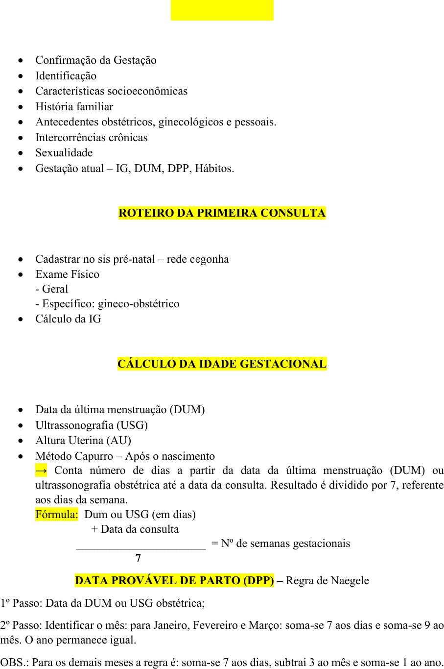 PRÉ-NATAL • Confirmação da Gestação • Identificação • Características socioeconômicas • História familiar • Antecedentes obstétricos, ginecológicos e pessoais. • Intercorrências crônicas • Sexualidade • Gestação atual – IG, DUM, DPP, Hábitos. ROTEIRO DA PRIMEIRA CONSULTA • Cadastrar no sis pré-natal – rede cegonha • Exame Físico - Geral - Específico: gineco-obstétrico • Cálculo da IG CÁLCULO DA IDADE GESTACIONAL • Data da última menstruação (DUM) • Ultrassonografia (USG) • Altura Uterina (AU) • Método Capurro – Após o nascimento → Conta número de dias a partir da data da última menstruação (DUM) ou ultrassonografia obstétrica até a data da consulta. Resultado é dividido por 7, referente aos dias da semana. Fórmula: Dum ou USG (em dias) + Data da consulta ______________________ = Nº de semanas gestacionais 7 DATA PROVÁVEL DE PARTO (DPP) – Regra de Naegele 1º Passo: Data da DUM ou USG obstétrica; 2º Passo: Identificar o mês: para Janeiro, Fevereiro e Março: soma-se 7 aos dias e soma-se 9 ao mês. O ano permanece igual. OBS.: Para os demais meses a regra é: soma-se 7 aos dias, subtrai 3 ao mês e soma-se 1 ao ano. TESTES A SEREM REALIZADOS NA UBS • Teste rápido de gravidez • Teste rápido de triagem para sífilis e sorologia para sífilis (VDRL) • Teste rápido diagnóstico para HIV e sorologia para HIV I e II; • Teste rápido diagnóstico para Hepatite B e C; • EXAMES SOLICITADOS 1º TRIMESTRE • Hemograma • Tipagem sanguínea e fator Rh • Coombs indireto (ser for Rh negativo) • Glicemia em jejum • Teste rápido de triagem para sífilis e/ou VDRL • Teste rápido diagnóstico anti-HIV • Anti HCV • Toxoplasmose IgM e IgG • Citomegalovírus IgM e IgG • Eletroforese de hemoglobina • Sorologia para Hepatite B (HbsAg) • Urocultura + urina tipo I (sumário de urina) • Ultrassonografia Obstétrica • Citopatológico de colo de útero (se necessário) • Exame de secreção vaginal (se houver indicação clínica) • Parasitológico de fezes (se houver indicação clínica) • Anti-HBS EXAMES SOLICITADOS 2º TRIMESTRE • Teste de tolerância para glicose com 75g, se a glicemia estiver acima de 85mg/dl ou se houver fator de risco preferencialmente entre a 24ª e a 28ª semana • Coombs indireto (se for Rh negativo) EXAMES SOLICITADOS 3º TRIMESTRE • Hemograma • Glicemia de jejum • Coombs indireto (se for Rh negativo) • VDRL • Anti-HIV • Sorologia para hepatite B (HbsAg) e C (HCV) • Repita o exame de toxoplasmose e citomegalovírus se o IgG não for reagente • Urocultura + urina tipo I (sumário de urina) • Bacterioscopia de secreção vaginal (a partir de 36 semanas de gestação) PRINCIPAIS ORIENTAÇÕES • Nutrição • Atividade física • Complicações • Pré-natal, gestação e parto • Relação sexual • Vacinação • Aleitamento materno • Prescrição de Sulfato Ferroso e Ácido Fólico VACINAÇÃO • Vacina dupla do tipo adulto – dT (difteria e tétano) Esquema de vacinação de dT 1ª dose -Precoce 2ª dose- 30 a 60 dias depois da 1ª dose (pode fazer a dTpa) 3ª dose- 30 a 60 dias depois da 2ª dose (pode fazer a dTpa) - Gestante com esquema completo e última dose administrada há mais de cinco anos e menos de 10 anos: deve-se administrar uma dose de reforço. - Gestante com esquema vacinal completo), sendo a última dose há mais de 10 anos: aplique uma dose de reforço. • Vacina contra influenza (fragmentada) É recomendada a todas as gestantes em qualquer período gestacional. • Vacina contra hepatite B - Gestantes em qualquer período gestacional. - Três doses com intervalo de 30 dias entre a primeira e a segunda e de 180 dias entre a primeira e a terceira. • Vacina contra dTpA a aplicação da dose na 20ª semana. EXAME FÍSICO • Exame físico geral • Exame físico gineco-obstétrico → exame de Citopatológico apenas com coleta de ectocérvice. PALPAÇÃO OBSTÉTRICA E MEDIDA DA ALTURA UTERINA → Técnica para palpação abdominal (Manobras de Leopold) - Consiste em um método palpatório do abdome materno em 4 passos. 1- Delimite o fundo do útero com a borda cubital de ambas as mãos e reconheça a parte fetal que o ocupa; 2- Deslize as mãos do fundo uterino até o polo inferior do útero, procurando sentir o dorso fetal; 3- Explore a mobilidade do polo, que se apresenta no estreito superior pélvico; 4- Determine a situação fetal, colocando as mãos sobre as fossas ilíacas, deslizando-as em direção à escava pélvica e abarcando o polo fetal, que se apresenta. 1º Manobra – verifica a situação fetal. 2º Manobra – verifica posição fetal. 3º Manobra – verifica apresentação fetal. 4º Manobra – verifica insinuação fetal. As situações que podem ser encontradas são: • longitudinal (apresentação cefálica e pélvica), • transversa (apresentação córmica) e oblíquas. MEDIDA UTERINA Técnica de palpação → Mede-se da sínfise púbica até a ponta mais alta do fundo uterino. (Mede-se da extremidade inicial (0cm) da fita métrica, iniciando na sínfise púbica). Obs.: Nº de semanas é proporcional à altura uterina em cm (com tolerância de 2cm para mais ou para menos). PRESCRIÇÃO PARA GESTANTES 1º Sulfato Ferroso: 40mg por dia. Tomar 40 minutos antes do almoço. 2º Ácido fólico: 0,2mg – 40 gotas por dia. AUSCULTA DOS BATIMENTOS CARDIOFETAIS (BCF) • Deve ser realizada com sonar, após 12 semanas de gestação, ou com Pinard, após 20 semanas. • É considerada normal a frequência cardíaca fetal entre 120 a 160 bpm. Fatores que dificultam a ausculta: • Excesso de líquido amniótico; • Implantação anterior da placenta; • Grande espessura da parede abdominal; • Contração uterina. Técnica para ausculta dos batimentos Cardiofetais: • Posicione a gestante em decúbito dorsal, com o abdômen descoberto; • Identifique o dorso fetal. Além de realizar a palpa