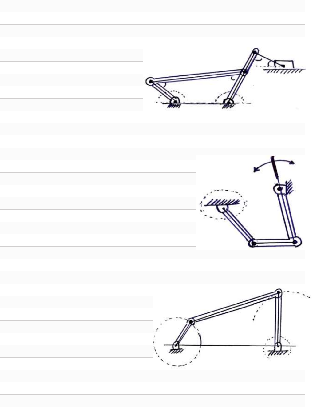 1 2 3 4 4: Manivela / Balancim 2: Manivela / Balancim - Mecanismo de retorno rápido: - Mecanismo de limpador de pára-brisa 2)Rotação ↔ Rotação (Manivela Dupla) Os elos 2 e 4 servem como manivelas, movimento para o balancim (4) que oscila. Os elos 2 e 4 servem como balancim, oscilando. 3) Translação ↔ Translação (Balancim Duplo). Manivela (2) Gira, a Biela (3) transfere o 1)Rotação ↔ Translação realizando movimento de rotação. Neste exemplo tem-se três configurações: - Quadrilátero articulado ou Manivela - Barra Oscilante 3 5 6 4 1 2 1 2 3 4 um movimento periódico no Balancim (4), portanto, uma rotação, pela Manivela (2), no qual é convertido para O movimento de entrada nesse mecanismo é o de Rotação ↔ Translação Dê exemplos de mecanismos que realizam movimentos de translação e01) rotação. Faça seus esboços. ção, a biela (3) por sua vez, transfere como elo 2, realiza movimento de rota - O elemento motor (manivela), descrito Rotação ↔ Translação nismo. este mecanismo. um movimento unidimensional no eixo x, obtendo assim uma saída de translação para movido (6). Este, é designado como balancim para o esquema, no qual executa então movimento para o elo 4 que, que então transfere para o elo 5, que desloca o elemento saída oscilante de trajetória bidirecional para este meca- ATIVIDADE N° 2 - ELEMENTOS DE MECANISMOS ALUNO: ADAILTON TEIXEIRA LIMA esboços da questão anterior. O que é grau de liberdade de um mecanismo? Dê exemplos seguindo os 02) L: número de juntas inferiores.de juntas superiores; acionamento que o mecanismo vai necessitar. Segundo o critério de Grubler, pode-se nico no plano ou espaço. Pode ser definido também pelo número de movimentos de das (independentes), suficiente a descrever a posição de um corpo ou sistema mecâ- Grau de liberdade num mecanismo: Pode-se representar pelo número de coordena- 1 2 3 4 3 4 1 2 3 4 5 6 GDL = 3*(n-1) - H - 2*L n: 6 ; H: 0 ; L: 7 (6 ângulos + 1 translação) = 3*(6-1) + 0 - 2*7 = 1 2 1 GDL = 3*(n-1) - H - 2*L n: 4; H:0; L: 4 (4 ângulos) GDL = 3*(n-1) - H - = 1 = 3*(4-1) - 0 - 2*4 movimentos em x e y). n: 4 ; H: 0 ; L:4 (2 ângulos + = 1 = 3*(4-1) - 0 - 2*4 n: número de elos; H: número determinar o número de graus a partir de: GDL = 3(n-1) - H - 2L ; texer Máquina de escrever 03) Para os mecanismos abaixo, pesquise e identifique os seguintes elemen- tos: parte móvel, parte fixa, parte motora e parte movida. E onde se aplica, identifique também a biela, a manivela e o balancim: 11 2 3 4 Exemplo 2: Came - Seguidor a vapor, e na transmissão de movimento motor. Mecanismo utilizado em máquinas Biela-Pistão, onde o pistão é o elemento Exemplo 1: Pistão-Biela Aplicação: Modelo invertido do esquema Seguindo o esquema, temos: para as rodas de uma locomotiva. Aplicação: Acionamentos em geral; Máquinas operatrizes; Seguindo o esquema, temos: res de combustão interna. Eixo comando de válvula de moto- 1 1 2 3 Manivela: 2 - Came; Parte movida: 3 - Seguidor; Parte motora: 2 - Came; Parte fixa: 1 - Estrutura;Parte fixa: 1 - Estrutura; Parte motora: 2 - Pistão; Parte móvel: 3 - Biela; Parte movida: 4 - Manivela; Balancim: 3 - Seguidor. Manivela serve como Balancim. Biela permanece com sua função; Pistão serve como Manivela;
