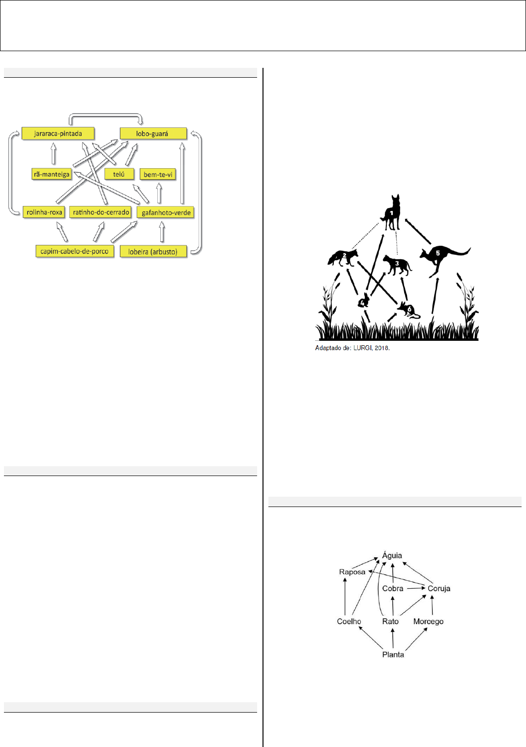 Professor: Rafael Disciplina: Biologia EA Assunto: Energia ecossistema Questão 01 (FUVEST 2020) Em um cerrado campestre bem preservado, ocorre a teia trófica representada no esquema a) Cite uma espécie dessa teia alimentar que ocupa mais de um nível trófico, especificando quais são eles b) Cite cinco espécies de uma cadeia alimentar que faça parte dessa teia. Desenhe um esquema da pirâmide de energia desse ambiente c) Com relação à dinâmica dessa teia alimentar, descreva o efeito indireto da extinção local do bem-te-vi sobre a população do predador de topo dessa teia (ou seja, aquele que preda sem ser predado por nenhum outro componente da teia). Caso o capim-cabelo-de-porco venha a sofrer uma grande queda em sua biomassa, qual interação biológica seria esperada entre os consumidores primários que se alimentam desse recurso? Questão 02 (SANTA CASA 2020) A análise de uma cadeia alimentar formada por produtores e consumidores permite concluir que a) Os produtores perdem grande parte da energia fixada na matéria orgânica e isso não ocorre na transferência de energia entre os consumidores b) Os produtores transformam energia luminosa em energia química e consomem grande parte dela em seu metabolismo, sobrando menos energia para os consumidores primários c) Cerca de 70% da energia química sintetizada pelos produtores é armazenada e pode ser utilizada integralmente por todos os consumidores d) A energia obtida pelos produtores segue um fluxo cíclico, no qual os consumidores sempre apresentam menos energia do que aqueles organismos que os antecederam e) Cerca de 10% da energia solar que atinge os produtores é utilizada para síntese da matéria orgânica, que será totalmente consumida pelos consumidores. Questão 03 (UEL 2020) O esquema, a seguir, representa uma teia alimentar simplificada dos mamíferos da Austrália. Estão representados em 1) Dingo (Canis dingo), 2) raposa europeia (Vulpes vulpes), 3) Gato doméstico (Felis catus), 4) Lebre europeia (Oryctolagus cuniculus), 5) Cangurus (Macropus e Osphranter spp.) e 6) Pequenos mamíferos (diversas espécies). Os animais representados pelos números 2, 3 e 4 não são nativos da Austrália; as demais espécies são. As setas representam as relações consumidor-recurso. As linhas tracejadas representam o amensalismo que, no esquema, significa que predadores são afetados pela abundância de dingo, mas este não recebe nenhum benefício. Com base na análise do esquema e do texto, responda aos itens a seguir. a) Quantos níveis tróficos estão representados na teia? Em qual nível estão o canguru e o dingo? b) O governo australiano quer exterminar 2 milhões de gatos até 2020 devido aos impactos que essa espécie vem causando aos pequenos mamíferos nativos, os quais, por sua vez, vêm diminuindo em função da predação feita pelos gatos. Essa decisão irá aumentar o tamanho populacional apenas de pequenos mamíferos nativos? Explique as consequências do extermínio dos gatos a curto e médio prazo Questão 04 (UFPR 2020) Assinale a alternativa que relaciona corretamente os níveis tróficos dos organismos constituintes da teia alimentar representada ao lado a) Plantas são produtores e águias e corujas são simultaneamente consumidores de 1º, 2º e 3º ordens b) Coelhos, ratos e morcegos são consumidores de 1º ordem, enquanto raposas são simultaneamente consumidores de 2º, 3º e 4º ordens Professor: Rafael Disciplina: Biologia EA Assunto: Energia ecossistema c) Ratos e morcegos são consumidores de 1º ordem, enquanto a coruja atua simultaneamente como consumidor de 2º, 3º e 4º ordens d) Cobras e corujas são simultaneamente consumidores de 2º e 3º ordens, enquanto águias atuam simultaneamente como consumidores de 2º, 3º e 4º e 5º ordens. e) Plantas são produtores, enquanto raposas e águias são simultaneamente consumidores de 2º, 3º, 4º e 5º ordens. Questão 05 (UFRGS 2020) Considere as seguintes afirmações sobre pirâmides ecológicas I – produtividade primária líquida representa, na pirâmide de energia, a matéria orgânica acumulada pelos autótrofos em um período de tempo II – A pirâmide de biomassa é invertida nos oceanos, pois o fitoplâncton tem alta taxa de reprodução e é rapidamente consumido pelo zooplâncton III – A pirâmide de energia representa as transformações e o fluxo unidirecional de energia nos ecossistemas Quais estão corretas? a) Apenas I b) Apenas II c) Apenas III d) Apenas II e III e) I, II e III Questão 06 (ENEM 2009) A figura representa uma cadeia alimentar em uma lagoa. As setas indicam o sentido do fluxo de energia entre os componentes dos níveis tróficos. Sabendo-se que o mercúrio se acumula nos tecidos vivos, que componentes dessa cadeia alimentar apresentará maior teor de mercúrio no organismo se nessa lagoa ocorrer um derramamento desse metal? a) As aves, pois são os predadores do topo dessa cadeia e acumulam mercúrio incorporado pelos componentes dos demais elos b) Os caramujos, pois se alimentam das raízes das plantas, que acumulam maior quantidade de metal c) Os grandes peixes, pais acumulam o mercúrio presentes nas plantas e nos peixes pequenos d) Os pequenos peixes, pois acumulam maior quantidade de mercúrio, já que se alimentam das plantas contaminadas e) As plantas aquáticas, pois absorvem grande quantidade de mercúrio da água através de suas raízes e folhas Questão 07 (ENEM 2013) Estudos de fluxo de energia em ecossistemas demonstram que a alta produtividade nos manguezais está diretamente relacionada às taxas de produção primária líquida e à rápida reciclagem dos nutrientes. Como exemplos de seres vivos encontrados nesse ambiente, temos: aves, caranguejos, insetos, peixes e algas. Dos grupos de seres vivos citados, os que contribuem diretamente para a manutenção dessa produtividade no referido ecossistema são a) Aves b) Algas c) Peixes d) Insetos e) Caranguejos Questão 08 (ENEM 2016) Um p