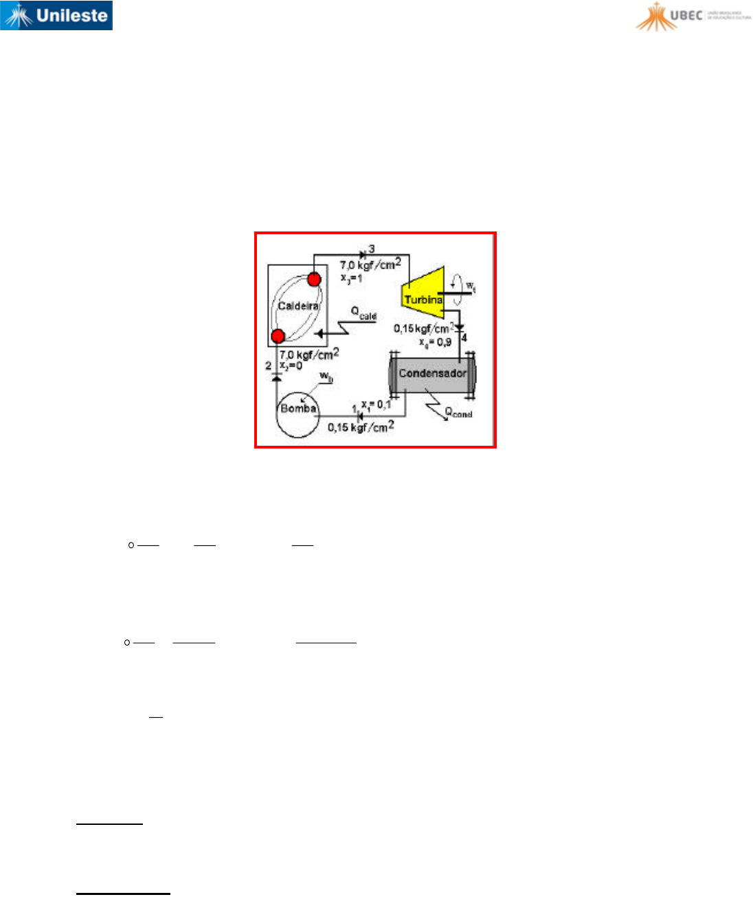 1 Entropia Exercícios Propostos 1. Considere o ciclo simples de potência a vapor, como mostrado na figura ao lado. Esse ciclo é ligeiramente diferente do ciclo normal das instalações a vapor, porque a bomba opera com uma mistura de líquido e vapor em tal proporção que líquido saturado (x=0) sai da bomba e entra na caldeira. Admitamos que a pressão e o título nos vários pontos do ciclo sejam os valores dados na figura. Pergunta-se: “Essa máquina operando nesse ciclo satisfaz a desigualdade de Clausius” ? Solução: No ciclo Rankine abaixo são dois os processos onde se realiza a transferência de calor: Caldeira e Condensador, portanto, utilizando desigualdade de Clausius, temos: Como a temperatura tanto na caldeira quanto no condensador permanece constante, integrando a equação anterior, resulta: Considerando: Das tabelas de vapor, temos: Entrada: P=7,0kgf/cm, x=0 hv=hentrada=659,5kcal/kg Saída: P=7,0kgf/cm, x=1 hl=hsaida=165,6kcal/kg Temperatura: T=164,2c Entrada: P=0,15kgf/cm, x=0,9 hv=53,5kcal/kg Saída da caldeira: P=0,15kgf/cm, x=0,1 hl=620,4kcal/kg Temperatura: T=53,6c rcondensadocaldeira T Q T Q T Q rcondensado rcondensado caldeira caldeira Q T Q TT Q 11 m Q q Caldeira: Condensador : kgkcalv kgkcalv vxxvv saida entrada lv /02,110 /71,563 )1( 2 Portanto: Logo: Conclusão: “O ciclo satisfaz a desigualdade de Clausius, oque equivale a dizer que o ciclo não viola a segunda lei da termodinâmica.” Pois kgkcalhhqcaldeira /9,4936,1655,65923 kgkcalhhq rcondensado /69,45371,56302,11041 2736,53 69,453 2732,164 9,493 T Q Kkg kcal T Q 2594,0 0 T Q 3 2. Considere que 1,0 kg de vapor d'água saturado a 100oc seja condensado para líquido saturado a 100 o c, num processo à pressão constante, através da transferência de calor para o ar do ambiente que está a 27 o c. Qual é o aumento líquido de entropia do sistema e do meio ambiente? Solução: Lembramos que o princípio de variação de entropia para o sistema e uma vizinhança é dado por: Portanto: Para o sistema: Da tabela de vapor para temperatura de saturação T=100 o c. sv=1,7561kcal/kgk sl=0,3121/kgk Considerando: Lembrar que: Q(-) Calor que sai / Q(+) Calor que entra Para a vizinhança: Da tabela de vapor para temperatura de saturação T=100 o c. hv=638,9kcal/kg hl=100,04kcal/kg Como: Logo: Portanto, o aumento de entropia líquido do sistema e vizinhança é dado por: QTdS kkg kcalS S ss T Q S sistema sistema lvsistema 444,1 3121,07561,1 )( T Q S hhQ vizinhança lvvizinhança kkg kcal T Q Svizinhança 7962,1 27327 04,1009,638 kkg kcalSS sistemavizinhança 3522,07962,1444,1 0T Q T Q dSdS vizinhançasistema S T h T Q T Q SS vizinhançasistema 0 4 3. (Concurso – Petrobrás 2012) Uma máquina térmica opera ciclicamente absorvendo, a cada ciclo, calor QQuente=2.400 kJ de uma fonte quente a TQuente=600 K e rejeitando calor QFria=1.800 kJ em uma fonte fria com TFria=300 K. O rendimento da máquina e a entropia gerada entre reservatórios, ΔSgerada, ao final de 1 ciclo da máquina são, respectivamente: (A) = 0,25; ΔST=2,0 kJ/K (B) = 0,75; ΔST=2,0 kJ/K (C) = 0,50; ΔST=10,0 kJ/K (D) = 0,50; ΔST=2,0 kJ/K (E) = 0,25; ΔST=10,0 kJ/K Solução: O rendimento pode ser calculado considerando: A entropia gerada no ciclo é obtida aplicando-se a Segunda Lei da Termodinâmica ao ciclo: (𝑠𝑠 − 𝑠𝑒) = 1 �̇� (∑ �̇� 𝑇 + ∆𝑠𝑔𝑒𝑟𝑎𝑑𝑎) Logo, para uma máquina térmica operando ciclicamente Portanto: (𝑠𝑠 − 𝑠𝑒) = ∆𝑠𝑐𝑖𝑐𝑙𝑜 = (∑ �̇� 𝑇 + ∆𝑠𝑔𝑒𝑟𝑎𝑑𝑎) = 0 Resposta: Letra (A) Quente Fria Fonte Fonte Q Q 1 2400 1800 1 25,0 0 Cicloes sss 0 gerada Fria Fria Quente Quente s T Q T Q 0 300 1800 600 2400 geradas K Kj K Kj Kg Kj Kg Kj sgerada 64 Kg Kj sgerada 0,2 5 4. (Concurso – Petrobrás 2010) Uma máquina térmica opera ciclicamente absorvendo, a cada ciclo, calor. Em relação a um sistema que sofre um processo irreversível, analise as afirmativas a seguir: I - Nesse sistema, a variação de entropia é sempre positiva. II - A soma da variação de entropia do sistema e de sua vizinhança é sempre positiva. III - Uma vez criada, a entropia se torna indestrutível. Está correto o que se afirma em (A) III, apenas. (B) I e II, apenas. (C) I e III, apenas. (D) II e III, apenas. (E) I, II e III. Solução: Para todos os ciclos irreversiveis das máquinas térmicas, tem-se que a variação de entropia é negativa: Por outro lado, a variação total de entropia envolvendo sistema e vizinhança é positiva: I - FALSA. A variação de entropia em um processo pode ser negativa se o sistema perder calor para o meio. II - VERDADEIRA. Para um processo irreversível, a variação total de entropia é sempre positiva. III - VERDADEIRA. A variação de entropia do universo nunca será negativa. Resposta: Letra (D) 0 0 T Q Q 0T Q T Q dSdS vizinhançasistema 6 5. (Concurso – Petrobrás 2010) Um sistema com massa igual a 100 kg é submetido a um processo no qual a sua entropia específica do sistema aumenta de 0,3 kJ/kgK para 0,4 kJ/kgK. Ao mesmo tempo, a entropia de sua vizinhança diminui de 80 kJ/K para 75 kJ/K. Com base nessas informações, conclui-se que esse processo é: (A) reversível. (B) reversível e isotérmico. (C) reversível e adiabático. (D) irreversível. (E) impossível de ocorrer. Solução: A variação total de entropia é: Processo Irreversível Resposta: Letra (D) 0T Q T Q dSdS vizinhançasistema vizinhançasistema Variação Líquida sss vizinhançasistema Variação Líquida sss K Kj KgK Kj KgsVariaçãoLíquida .80753,04,0.100 00,5 K Kj sVariaçãoLíquida 7 6. (Concurso – Petrobrás 2005) Um sistema de geração de energia opera entre duas fontes térmicas cujas temperaturas são 2000K e 400K. O sistema recebe 1200 kJ da fonte quente e rejeita 1020 kJ para a fonte fria, produzindo 180 kJ de trabalho. Com base nestes dados, afirma-se, corretamente, que o sistema proposto: (A) É impossível, pois viola a Le