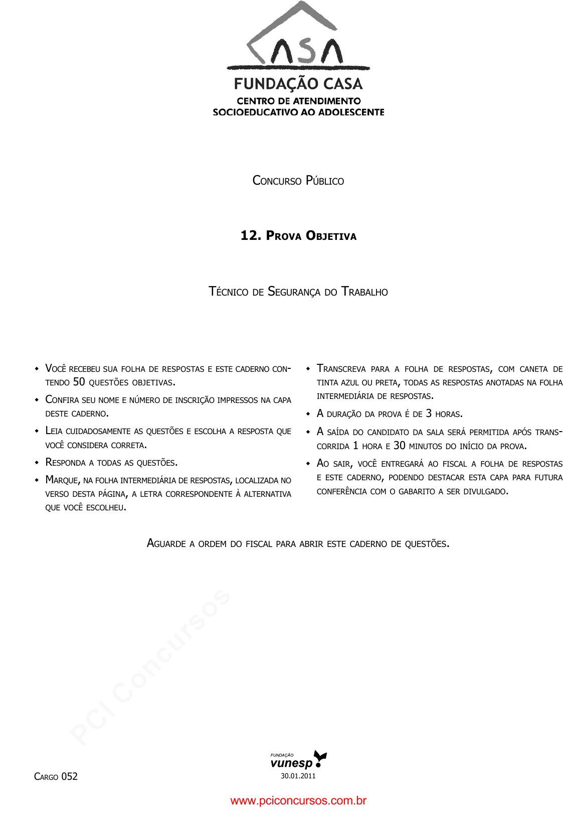 pcimarkpci MDAwMDowMDAwOjAwMDA6MDAwMDowMDAwOmZmZmY6YWE1MDoyNzFm:V2VkLCAwMiBTZXAgMjAyMCAyMjo1ODoyOSAtMDMwMA== ConCurso PúbliCo 12. Prova objetiva TéCniCo de segurança do Trabalho VoCê reCebeu sua folha de resPosTas e esTe Caderno Con- Tendo 50 quesTões objeTiVas. Confira seu nome e número de insCrição imPressos na CaPa desTe Caderno. leia CuidadosamenTe as quesTões e esColha a resPosTa que VoCê Considera CorreTa. resPonda a Todas as quesTões. marque, na folha inTermediária de resPosTas, loCalizada no Verso desTa Página, a leTra CorresPondenTe à alTernaTiVa que VoCê esColheu. TransCreVa Para a folha de resPosTas, Com CaneTa de TinTa azul ou PreTa, Todas as resPosTas anoTadas na folha inTermediária de resPosTas. a duração da ProVa é de 3 horas. a saída do CandidaTo da sala será PermiTida aPós Trans- Corrida 1 hora e 30 minuTos do iníCio da ProVa. ao sair, VoCê enTregará ao fisCal a folha de resPosTas e esTe Caderno, Podendo desTaCar esTa CaPa Para fuTura ConferênCia Com o gabariTo a ser diVulgado. aguarde a ordem do fisCal Para abrir esTe Caderno de quesTões. 30.01.2011Cargo 052 www.pciconcursos.com.br pcimarkpci MDAwMDowMDAwOjAwMDA6MDAwMDowMDAwOmZmZmY6YWE1MDoyNzFm:V2VkLCAwMiBTZXAgMjAyMCAyMjo1ODoyOSAtMDMwMA== 2CASA1002/12-TécSegTrabalho Folha intermediária de resPostas QUE STÃ O RESPOSTA 01 02 03 04 05 A B C D E A B C D E A B C D E A B C D E A B C D E 06 07 08 09 10 A B C D E A B C D E A B C D E A B C D E A B C D E 11 12 13 14 15 A B C D E A B C D E A B C D E A B C D E A B C D E 16 17 18 19 20 A B C D E A B C D E A B C D E A B C D E A B C D E QUE STÃ O RESPOSTA 26 27 28 29 30 A B C D E A B C D E A B C D E A B C D E A B C D E 31 32 33 34 35 A B C D E A B C D E A B C D E A B C D E A B C D E 36 37 38 39 40 A B C D E A B C D E A B C D E A B C D E A B C D E 41 42 43 44 45 A B C D E A B C D E A B C D E A B C D E A B C D E 21 22 23 24 25 A B C D E A B C D E A B C D E A B C D E A B C D E 46 47 48 49 50 A B C D E A B C D E A B C D E A B C D E A B C D E QUE STÃ O RESPOSTA www.pciconcursos.com.br pcimarkpci MDAwMDowMDAwOjAwMDA6MDAwMDowMDAwOmZmZmY6YWE1MDoyNzFm:V2VkLCAwMiBTZXAgMjAyMCAyMjo1ODoyOSAtMDMwMA== 3 CASA1002/12-TécSegTrabalho LÍNGUA PORTUGUESA Leia o texto para responder às questões de números 01 a 10. Da corrupção à crise A corrupção domina o Mundo. Esta é a conclusão amarga que resulta da análise dos indicadores de percepção da corrupção divulgados ontem pela Transparência Internacional. Cerca de 75 por cento dos países obtêm nota negativa, numa escala que vai de zero (os mais corruptos) a dez (os países mais “limpos”). A propagação da corrupção não tem limites e ultra- passa todas as fronteiras. De Angola, que apresenta um score de 1,9, à Venezuela, de Chávez, que obtém a pior classificação do continente americano (2,0), passando pela Rússia (2,1) ou até pela Grécia (3,5). Em termos globais, é evidente a relação direta entre a pobreza e a corrupção, o que torna esta epidemia ainda mais grave. Este fenômeno será até o fator que gera maior pobreza, já que é através dos seus mecanismos que se canalizam os recursos de todos para os bolsos de alguns. Talvez o verdadeiro combate à fome tenha sucesso quando as Nações Unidas trocarem os programas de apoio alimentar por estratégias efetivas de combate à fraude. E em Portugal? Por cá, o panorama é desolador. Só na última década, desceu dez posições no “ranking”. Em termos do espaço europeu ocidental, Portugal ocupa a 19.ª posição, em 30, apenas à frente de Itália, Grécia, Malta e países do antigo bloco do Leste. Esta posição é afinal o corolário lógico dum sistema que parece querer proteger a corrupção. E que tem como primeiro responsável um Parlamento que produz legislação confusa, cheia de regras, repleta de exceções e que permite, a quem as aplica, um enorme poder discricionário, fonte de todo o compadrio. Este cenário só poderia piorar com um sistema de justiça que se revela absolutamente incapaz no combate a este flagelo. Também em Portugal a corrupção gera pobreza, através da transferência dos bens coletivos para os mais poderosos, permi- tindo que os ricos sejam cada vez mais ricos e os pobres cada vez mais desgraçados. Talvez por cá, como no Mundo, a melhor forma de combater a crise seja começar por travar um combate, sem tréguas, à corrupção. (Texto de Paulo Morais, Jornal de Notícias [Portugal], 27.10.2010, com adaptações. Obtido pelo site http://jn.sapo.pt/Opiniao.) 01. De acordo com o autor, a corrupção (A) atinge, na grande maioria, países mais novos e, por conta disso, de vida mais precária. (B) é um mal que assola o mundo e, em Portugal, tem espaço nas práticas parlamentares. (C) tem um cenário melhor em Portugal, devido às ações prudentes do Parlamento. (D) está sob controle na Europa ocidental, mas assola os países do leste europeu e a América. (E) assola o mundo, segundo a Transparência Nacional, mas os dados são questionáveis. 02. No texto, fica claro que (A) a corrupção gera excesso de leis. (B) pobreza e corrupção se opõem. (C) a pobreza advém da corrupção. (D) as leis inibem a corrupção. (E) os ricos combatem a corrupção. 03. No terceiro parágrafo, a ideia que se defende é que (A) combatendo a corrupção combate-se de fato a fome. (B) os muitos que ajudam a poucos devem deixar de fazê-lo. (C) a fome é um problema social que não deve ser combatido. (D) o maior problema mundial está relacionado à fome. (E) a fome deve deixar de ser preocupação das Nações Uni- das. 04. Com a frase – ... permite, a quem as aplica, um enorme poder discricionário, fonte de todo o compadrio. – entende-se que a aplicação das leis com base em uma legislação confusa (A) impede que haja o favorecimento pessoal. (B) coíbe as decisões fraudulentas. (C) norteia as deliberações com mais justiça. (D) torna a justiça acessível a todos os cidadãos. (E) favorece as decisões 