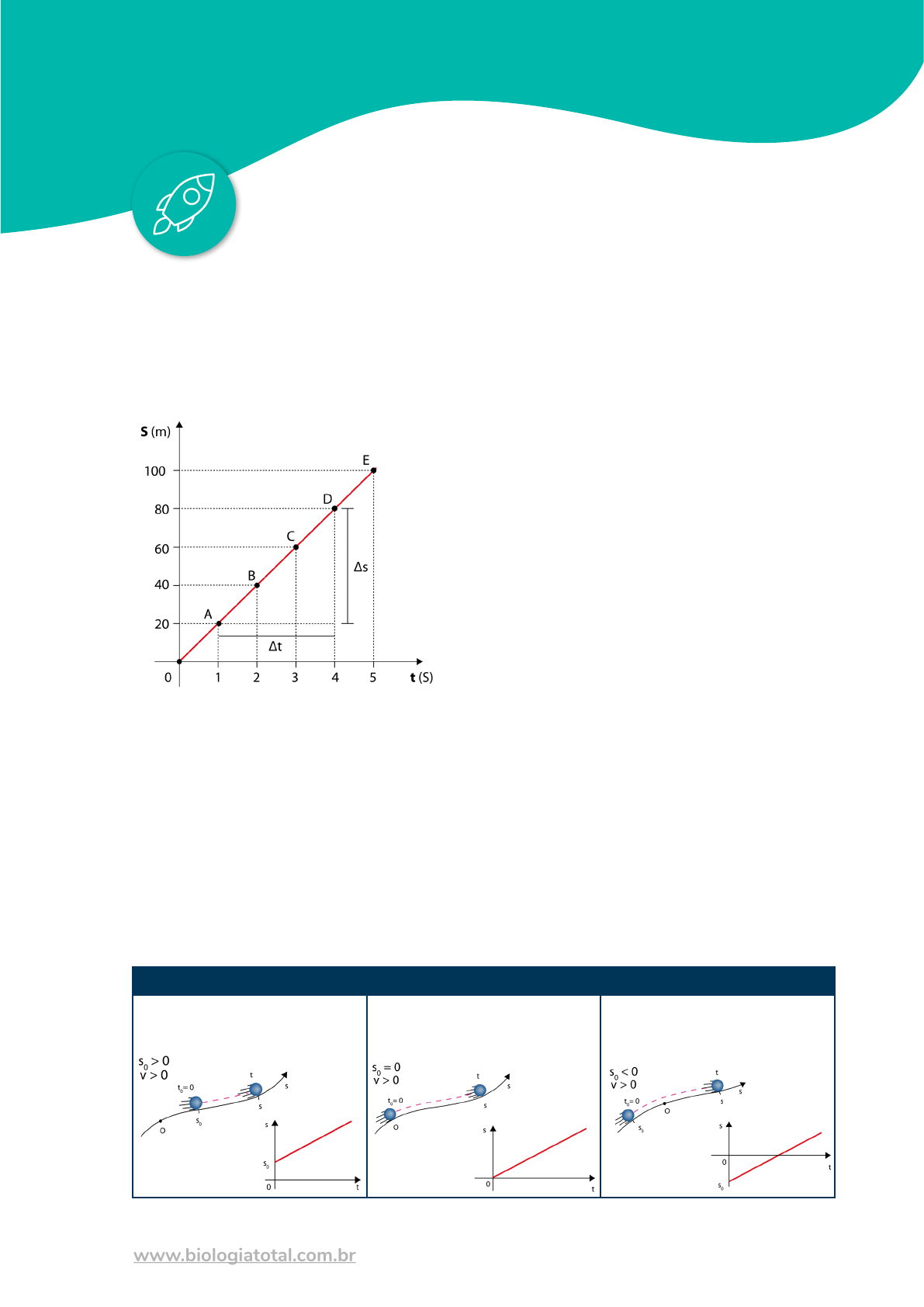 1www.biologiatotal.com.br GRÁFICOS DE MOVIMENTO MOVIMENTO UNIFORME (MU) No movimento uniforme, os gráficos do espaço e da velocidade (em função do tempo) são retilíneos, pois representam funções de 1º grau. Gráfico do espaço em função do tempo: De acordo com o gráfico, um carro desloca-se em movimento retilíneo e uniforme durante 5 s. Observe que: f O primeiro ponto marcado no gráfico é a origem O dos dois eixos, porque, em uma situação idealizada, quando t = 0 s, temos também S = 0 m; f O segundo ponto marcado (ponto A) indica que até o instante t1 = 1 s o carro havia percorrido uma distância s1 = 20 m; f O terceiro ponto marcado (ponto B) indica que até o instante t2 = 2 s o carro havia percorrido uma distância s2 = 40 m, e assim sucessivamente. No movimento uniforme, as grandezas são diretamente proporcionais, ou seja, quando o valor do tempo é duplicado, o valor do espaço percorrido também é duplicado. Nestes casos, podemos assumir que o espaço percorrido é diretamente proporcional ao tempo. A seguir, um exemplo dos tipos de movimento (progressivo e retrógrado) que podem ser representados graficamente: Movimento progressivo Movimento uniforme da trajetória Movimento uniforme com posição inicial positiva. Movimento uniforme com posição inicial nula. Movimento uniforme com posição inicial negativa. 2 G rá fic os D e M ov im en to Movimento retrógrado Movimento uniforme da trajetória Movimento uniforme com posição inicial positiva. Movimento uniforme com posição inicial nula. Movimento uniforme com posição inicial negativa. Gráfico da velocidade em função do tempo Considere um automóvel se deslocando em movimento uniforme com uma velocidade v = 60 km/h e que essa velocidade seja mantida durante um tempo t = 5h. Para construir o gráfico da velocidade desse automóvel em função do tempo, devemos traçar dois eixos perpendiculares para representar essas grandezas. No gráfico ao lado: f Estão representados diversos valores de tempo t, no eixo horizontal; f Estão representados os valores da velocidade v, correspondentes a cada valor do tempo t, no eixo vertical. Quando começamos a contar o tempo (t = 0 h), o carro já possuía a velocidade v = 60 km/h. O ponto A no gráfico mostra esse fato, pois no eixo das velocidades (eixo vertical), o ponto A representa um valor igual a 60 km/h. Após decorrido um tempo t = 1 h, o carro continua com uma velocidade v = 60 km/h e isso é indicado pelo ponto B no gráfico. No instante t = 2h, a velocidade do carro será representada pelo ponto C. Suponha que esse carro tenha se movimentado durante 5h, como podemos descobrir a distância percorrida pelo carro? Se calcularmos a área sob o gráfico, obtemos 60 km/h x 5 h = 300 km. MOVIMENTO UNIFORMEMENTE VARIADO (MUV) No movimento uniformemente variado, não só a posição muda, mas também a velocidade. Isso acontece porque existe uma aceleração, que causa uma mudança na velocidade do objeto ao longo do tempo. 3www.biologiatotal.com.br G rá fic os D e M ov im en toGráfico do espaço em função do tempo Em cada um dos gráficos a seguir, do espaço (s) em função do tempo (t), vamos verificar se o movimento correspondente é acelerado, retardado ou uniforme. Gráfico A Gráfico B Gráfico C Gráfico da velocidade em função do tempo Se a aceleração for positiva, e função que relaciona a velocidade (v) com o tempo (t) será crescente e a sua representação gráfica será parecida com um dos exemplos abaixo: Gráfico v x t - quando a aceleração escalar é positiva Se a aceleração for negativa, teremos: Gráfico v x t - quando a aceleração escalar é negativa 4 G rá fic os D e M ov im en to Gráfico da aceleração em função do tempo No MUV, a aceleração não varia, logo temos apenas duas opções para esse tipo de gráfico: aceleração positiva ou aceleração negativa. ANOTAÇÕES