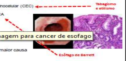Medicina FTC – 2020.1 Catarina Viterbo NEOPLASIAS DO TGI Gastroenterologia – Prof. Ronado Carneiro – 01/06/2020 • Maioria das neoplasias em seres humanos • Fatores de risco → tabagismo, alcoolismo, obesidade e dieta • Importância do diagnóstico precoce • Screening : exames de rotina →endoscopia, colonoscopia e USG abdome o Cuidado para não solicitar exames desnecessários. • Gama de manifestações: podem começar a manifestação com fadiga, cansaço, sintomas gerais, como a trombose Paraneoplásica de trombose venosa profunda paraneoplasia, ou com uma embolia pulmonar associada a um trombo tumoral. o Algumas neoplasias fora do intestino e alguns quadros relacionados a neoplasia tem início a partir de um trombo que sai do tumor e foi parar dentro do pulmão, provocando embolia pulmonar, um TEP ou um trombo que saiu do intestino e foi parar no sistema nervoso periférico, nos membros inferiores, levou a uma trombose venosa profunda e o paciente abre quadro com edema progressivo e importante com dor no membro inferior. Câncer do esôfago Adeno CA ( vs CA espinocelular →90%) CA espinocelular (CEC): juntamente com o carcinoma epidermóide tem relação com o tabagismo e elitismo. AdenoCA: muito relacionado com o esôfago de barret. Mas não obrigatoriamente tem que ser assim. • O paciente que tem esôfago de Barret entra no grupo de pacientes que tem que ser investigado frequentemente com o sistema de Screaning endoscópico. Isso porque essa alteração da mucosa (metaplasia intestinal completa da mucosa esofagiana) leva a chance cumulativa do desenvolvimento de adenocarcinoma ano após ano. • Requer acompanhamento específico com o Gastro. ♂ > ♀ 6ª maior causa Câncer do esôfago SINTOMAS Disfagia → > 50% da luz: Geralmente se manifesta quando o paciente já está com o quadro avançado. Tem associação quando há um comprometimento de mais de 50% da luz do esôfago. PACIENTE TEM: PIROSE + REGURGITAÇÃO INEXPLICADA + ANEMIA ASSOCIADA + FAIXA ETÁRIA MAIS AVANÇADA. → Não esperar a disfagia para pensar em CA de esôfago. É uma disfagia PROGRESSIVA: diferente da disfagia do paciente com doença da contração de musculatura esofagiana da musculatura. Em geral, é uma disfagia que o paciente já tem já algum tempo ou está associada a uma esofagite do refluxo, que já tem de 5 a 10 anos. Odinofagia e regurgitação Perda ponderal Halitose: A depender do nível de obstrução, o paciente mal consegue fazer o bolo alimentar migar na direção descendente e muitas vezes vai ter resto alimentar acumulado no esôfago dando halitose que acompanha esses quadros frequentemente. Sintomas desde o início (82%) → screening (fatores de Fases mais avançadas →estruturas adjacentes Mx: linfonodos, fígado, pulmão, adrenais e ossos: Nas fases mais avançadas, pela proximidade de estruturas adjacentes, a traqueia, os brônquios, é uma doença que costuma atingir esses órgãos com frequência grande. Então, não raramente faz diagnostico de quadro muito avançado, já com comprometimento da arvore respiratória, que dificulta muito o tratamento e complica o estadiamento da doença. Frequentemente, é uma neoplasia que leva a metástase linfonodal, e para o fígado, pulmão, suprarrenal, ossos. ➔ Existe alguns indícios de que uma pangastrite pudesse proteger, mas isso não está confirmado, pelo contrário, ela quando não tratada pode levar a uma gastrite atrófica, uma atrofia das células do estomago e é fator de risco para câncer gástrico. ➔ O estadiamento tem relação com os sintomas Profundidade: Tamanho, que está relacionado com a profundidade, ao grau de invasão. Uma coisa é um câncer que só atinge a mucosa, outra é aquele que invade a camada muscular. Evidentemente que a chance de sobrevida em 5 anos (quando fala de sobrevida é em média 5 anos após o diagnóstico da doença) vai mudar muito de acordo com o grau de invasão das camadas. Então, isso tem a ver com tamanho e profundidade. Disseminação linfonodal: uma coisa é ter um único gânglio, linfonodo acometido, outra é ter metástase de toda uma cadeia ganglionar, e outra é ter mais de 20 gânglios comprometidos, alguns já a distância, isso é muito importante na hora que for estadiar esse paciente Mx à distância: Não raramente, já chega paciente com metástase hepática, pulmonar, SNC, que é o estadiamento levando em consideração a ocorrência de metástase a distância que geralmente está associada a uma classificação ruim de estadiamento, a sobrevida bastante baixa. O exame PET-scan, uma tomografia com emissão de pósitrons, que é essa radiação que vai mostrar, por exemplo, uma metástase de linfonodo distante do foco primário. CÂNCER DE ESÔFAGO – TRATAMENTO Mucosectomia: tem o tratamento endoscópico, que é como se fosse uma raspagem, uma retirada da mucosa comprometida. Porque é uma doença restrita a mucosa, que não invade a submucosa, muscular da mucosa. • Se for uma lesão em alto relevo, que pode caracterizar um quadro mais avançado, dificultando o tratamento endoscópico como mucosectomia e muitas vezes requerendo através de uma esofagectomia. CÂNCER DE ESÔFAGO – TRATAMENTO CIRÚRGICO Esofagectomia: é a retirada, com junção das partes remanescentes, que é a realização de uma anamostose colón-colônica ou colón-entérica, que pode ser um pedaço pequeno ou enorme. QT e RxT pré ou paliativa: não é raro usar esse tratamento. Usado para reduzir o tamanho desse tumor ou até mesmo um paliativo. • Tratamento paliativo para redução do tamanho desse tumor, e para não sofrer tanto com disfagia, odinofagia e para tentar aumentar um pouco a sobrevida dele. Esse paciente frequentemente tem alguns distúrbios da deglutição, disfagia por conta da alteração da contratilidade dessa musculatura, não raramente, não pode dizer que troca de problema, mas tem repercussão do mecanismo de deglutição, de passagem do alimento impo
