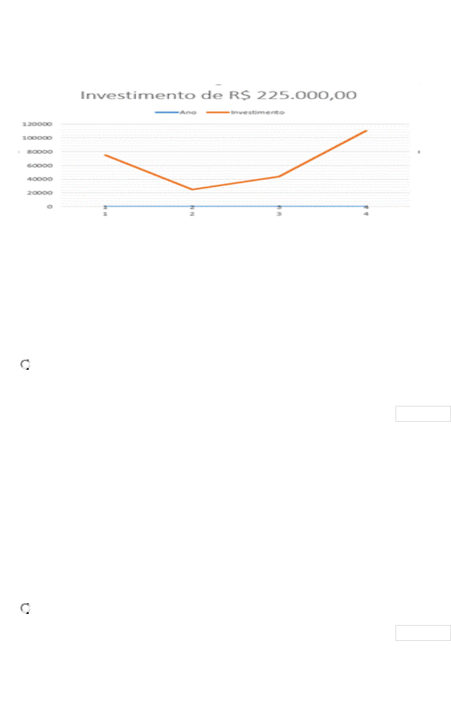 PERGUNTA 1 1. A empresa Machado Company fez um investimento inicial de R$ 225.000,00 em uma nova aplicação. Durante 4 anos, a empresa obteve faturamentos diferentes e o investidor acompanhou tais oscilações ao longo desse período por meio de um gráfico. Fonte: Elaborado pela autora. Diante do exposto, assinale a alternativa que descreve o fluxo de caixa representado no gráfico. 1º ano R$ 75.000,00, 2º ano R$ 25.000,00, 3º ano R$ 44.000,00 e 4º ano R$ 110.000,00. 1 pontos PERGUNTA 2 1. Um determinado investimento apresenta resultados iguais entre si, ou seja, o aumento ou a baixa nos fluxos de caixas são acompanhados na mesma direção dos outros fluxos de caixas. Esse tipo de investimento pode ser independente de outro investimento, porém existem alguns fatores externos que podem influenciar diretamente nesse projeto. Assinale a alternativa que retrata qual investimento está sendo abordado no enunciado da questão. Investimentos com dependência estatística. 1 pontos PERGUNTA 3 1. O Método da Taxa de Retorno Incremental é uma variação da TIR e deve ser utilizada para comparar alternativas de investimentos iniciais distintos. Portanto, a TIR incremental se refere ao incremento de receita dos investimentos em relação a outros investimentos. Nesse sentido, considere a Taxa de Retorno Incremental e analise as afirmativas a seguir. I. A TIR incremental traz os fluxos de caixa ao valor presente. II. A TIR incremental deve ser utilizada ao se analisar projetos mutuamente exclusivos, isto é, quando o fato de se executar um projeto irá prejudicar os benefícios do outro. III. A TIR incremental apresenta resultados associados entre os projetos, ou seja, os aumentos ou diminuições nos fluxos de caixa de um acompanham as variações do outro na mesma direção. Está correto o que se afirma em: II, apenas. 1 pontos PERGUNTA 4 1. Quando tomamos qualquer tipo de decisão sobre os projetos criados, devemos entender que existe uma variedade de investimentos. Pode acontecer de um afetar o outro ou não. Levando em consideração os vários tipos de investimentos usualmente tratados, relacione cada um deles com a descrição adequada. (1) Investimentos dependentes. (2) Investimentos independentes. (3) Investimentos mutuamente excludentes. (4) Investimentos com restrições orçamentárias. (5) Investimentos com dependência estatística. ( 2 ) A aceitação ou rejeição de um investimento não depende da escolha do outro. ( 5 ) Ele apresenta um resultado junto com ele mesmo, ou seja, os aumentos ou diminuições nos fluxos de caixa de um são acompanhados na mesma direção dos fluxos de caixa do outro. (4 ) São investimentos independentes de uma empresa que, em virtude de limitação orçamentária, não podem ser executados simultaneamente. (1 ) A escolha de investimento gera resultados positivos ou negativos em outros investimentos. ( 3) São os casos em que certo investimento anula os benefícios de outro ou também torna inviável a execução desse outro investimento. Assinale a alternativa que apresenta a sequência correta. 2; 5; 4; 1; 3. 1 pontos PERGUNTA 5 1. A empresa Micros LTDA está considerando investir em um novo projeto de investimento, para isso é necessário investir um total de R$ 224.000,00. Considere a tabela, a seguir, que consta o fluxo de caixa do período e o fluxo de caixa acumulado. Ano Fluxo de caixa Período Fluxo de caixa acumulado 0 -224.000 -224.000,00 1 58.562,22 -165.437,78 2 88.235,33 -77.202,45 3 75.352,00 -1.850,45 2. Fonte: Elaborada pela autora. Com base nos dados apresentados, indique qual alternativa retrata corretamente o valor do fluxo de caixa no final do terceiro ano. -1.850,45 1 pontos PERGUNTA 6 1. Leia o trecho a seguir. “Um projeto de investimento convencional apresenta desembolsos, na fase inicial e recebimentos, nos períodos futuros. Claro que para haver retorno sobre o investimento, será necessário que o total das entradas de caixa supere o das saídas. Dessa forma, admitida uma taxa de juros mínima aceitável pelo investidor, denominada Taxa Mínima de Atratividade (TMA), o projeto de investimento terá condições de ser aceito”. BARBIERI, J. C.; ÁLVARES, A. C. T.; MACHLINE, C. Taxa Interna de Retorno: controvérsias e interpretações. Revista GEPROS, n. 4, p. 131, 2007. Nesse sentido, considere a taxa mínima de atratividade e analise as afirmativas a seguir. I. A TIR sempre deverá ser menor do que a TMA. II. Por conta da aversão ao risco de cada investidor, a TMA é única para cada indivíduo. III. A TMA pode ser tratada como uma taxa de retorno, isto é, a TMA irá influir diretamente no nível da TIR. Está correto o que se afirma em: II, apenas. 1 pontos PERGUNTA 7 1. Leia o trecho a seguir. A TIR pode conter alguns problemas, como a presença de múltiplas ______________. Podendo existir devido a alterações de sinais entre os _____________. Isto é, em determinado momento o fluxo pode estar positivo e em outro, negativo. Entretanto, a ____________ soluciona essa questão e proporciona uma taxa de retorno mais precisa. Assinale a alternativa que preencha correta e sequencialmente as lacunas. Taxas de retorno, fluxos de caixa, TIR-M. 1 pontos PERGUNTA 8 1. Uma empresa fez um investimento no valor de R$ 20.000,00 que retorna valores de fluxos de caixas anuais de R$ 6.500,00 por 4 anos. O investidor considerou que 5,5% ao ano é a taxa de atratividade. Sendo assim, assinale a alternativa que apresenta o fluxo de caixa atualizado correto. VPL = R$ 2.783,48 1 pontos PERGUNTA 9 1. Um projeto só é válido quando ele gera lucro. Esse lucro é o aumento de suas receitas e diminuição dos custos de produção, porém precisamos saber que, para um projeto gerar lucro, é necessário avaliar suas capacidades. Para isso, alguns métodos entram em ação, objetivando trazer entendimento a respeito do comportamento dos investimentos. Com base no texto apresentado, assinale a alternativa que melhor descreve o VPL. É