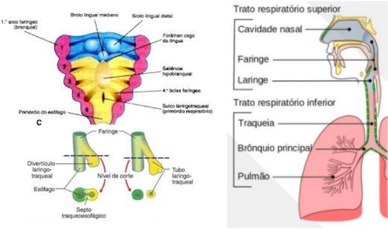 Sistema respiratório O desenvolvimento do sistema respiratório está intimamente relacionado ao do sistema digestivo desde o princípio. Origem: Porção superior: derivada do aparelho faríngeo (sulco laringotraqueal) Porção inferior: derivada do intestino anterior (divertículo respiratório) Endoderma do sulco laringotraqueal/divertículo respiratório: origina epitélio e glândulas da laringe, da traqueia, dos brônquios e dos pulmões Mesoderma intraembrionário esplâncnico: origina cartilagens, musculatura lisa dos brônquios, capilares, tecido conjuntivo e pleura visceral Sequência do desenvolvimento dos pulmões: · Pulmões primordiais expandem para dentro dos canais pericárdio-peritoneais da cavidade do corpo · Prega pleuroperitoneal e a prega pleuropericárdica separam os canais pericárdio-peritoneais das cavidades peritoneal e pericárdica com formação da cavidade pleural · Pleura visceral se origina do mesoderma · Endoderma dá origem ao revestimento mucoso dos brônquios e às células epiteliais dos alvéolos · Mesoderma ajuda a dar origem aos componentes restantes dos pulmões · Esplancnopleura origina: vasculatura, tecido conjuntivo, músculos e cartilagens associados aos brônquios, pleura dos pulmões Desenvolvimento da laringe: Epitélio: o endoderma se transforma em epitélio de revestimento da laringe. O epitélio do tubo se prolifera e se fecha (4semana), formando as pregas vocais e pregas vestibulares, quando há recanalização (volta a passem de ar) na 10 semana, a última porção a recanaliza a glote e pode acontecer algumas patologias por falta ou falha na recanalização. Cartilagens: o sulco laringotraqueal por proliferação do mesênquima se desenvolve e ficam inchadas formando uma ondulação, o mesênquima (células da crista neural) se transforma em cartilagens laríngeas do (3 entrada da laringe), 4 e 6 arcos faríngeos. Também há formação da epiglote (cartilagem) por proliferação do mesenquima do 3o e 4o arcos e o mesenquima da extremidade cefálica do tubo laringo-traqueal (entre 4o e 6o arcos) formam as tumefações aritenóides. Outras cartilagens que se formam são as do 6 e 5 arcos são as cartilagens tireóidea, criocóidea e aritenóideas, são cartilagem hialinas (que durante a fase adula depois dos 20 anos, sofrer calcificação e endurecem) Músculos: os mioblastos (mesoderme intraembrionário) do 4o e 6o arcos se transforma em músculos da laringe e todos recebem um nervo craneano (os importantes do no nervo X o vago) Os músculos mais importantes são os adutores são os músculos que aproximam cordas vocais e contraem glote, os músculos abdutores que afastam cordas vocais e dilatam glote e os músculos tensores que distendem cordas vocais. MALFORMAÇÕES CONGÊNITAS DA LARINGE Laringomalácea: alteração congênita, que caracteriza-se por uma imaturidade e flacidez das cartilagens da laringe, o que ocasiona um colabamento de sua luz, quando se instala a pressão negativa da inspiração. Clinicamente, manifesta-se por um estridor crônico, predominantemente inspiratório, que se acentua no choro, e diminui com a respiração tranqüila. A patologia pode envolver também a traquéia (laringotraqueomálacea). Diafragma laríngeo: ou membranas congênitas, onde uma lamina de tecido conjuntivo une uma corda vocal a outra, causando graus variáveis de insuficiência respiratória, dependendo de seu tamanho. Geralmente ocupa o terço anterior da fenda glótica, enquanto que o terço posterior permanece aberto. Se for total, leva ao óbito do recém-nascido se a membrana não for rompida imediatamente com uma manobra de entubação. Laringocele: são dilatações saculares arejadas localizadas no apêndice do vestíbulo laríngeo, que aumentam no esforço expiratório. Podem ser internas, externas ou mistas. A forma interna consta de um saco aéreo, localizado na zona da prega ventricular, limitado pela membrana tireo-hioídica. A forma externa se apresenta como um abalamento, na superfície externa e lateral da membrana tireo-hioídica. Desenvolvimento da traqueia: Endoderma: forma o epitélio de revestimento e glândulas da traqueia Mesoderma intraembrionário lateral esplâncnico/ mesênquima: forma as cartilagens da traqueia, tecido conjuntivo e músculos. O mesênquima se condensa e forma os anéis da traqueia. MALFORMAÇÕES CONGÊNITAS DA TRAQUEIA: Fístula traqueoesofágica: fusão incompleta das pregas traqueoesofágicas acontece por divisão (septação) incompleta da porção cranial do intestino anterior em porção respiratória (traqueal) e digestória (esofágica), causando uma passagem anormal. 6 SEMANA DO DESENVOLVIMENTO: Broto pulmonar: o divertículo laringotraqueal, na porção caudal, forma o broto pulmonar, que se divide em 2 tumefações, formando assim então os brotos brônquicos primitivos. As ramificações dos brotos pulmonares acontecem porque os brotos brônquicos primitivos crescem lateralmente para os canais pericardioperitoneais. A junção do endoderma mais mesênquima circundante (mesoderma lateral esplâncnico) forma os brônquios que se ramificam, formando os bronquíolos do pulmão e o mesênquima origina cartilagens, musculatura lisa, tecido conjuntivo bronquial, tecido conjuntivo e capilares pulmonares. Desenvolvimento dos pulmões: O divertículo respiratório (broto respiratório) cresce a partir da evaginação do divertículo laringotraqueal na parede ventral do intestino primitivo anterior, se expandindo na direção ventral e caudal, invadindo o mesênquima ao redor do intestino anterior, após isso se comunica diretamente com o intestino anterior, separa-se dele, e eventualmente o intestino anterior forma o esôfago. Concomitantemente, a extremidade distal do broto respiratório se bifurca nos brotos bronquiais primários direito e esquerdo, enquanto a extremidade proximal (pedúnculo) forma a traquéia e a laringe. Até a quinta semana de gestação, os brotos bronquiais pr
