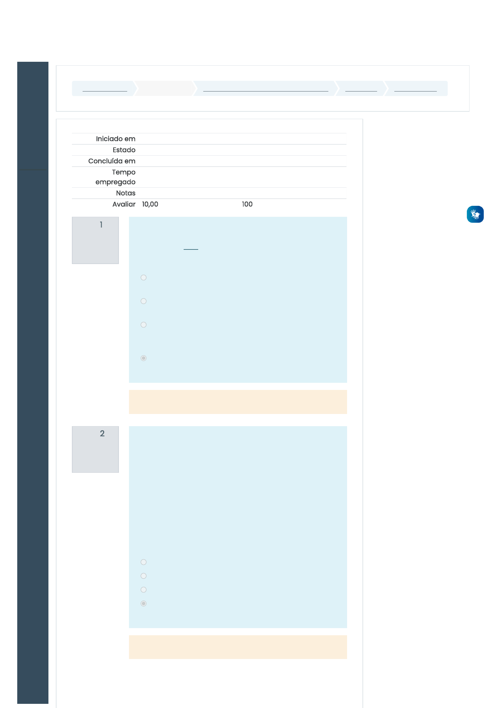 https://cursos.poca.ufscar.br/mod/quiz/review.php?attempt=310315&cmid=246 1/4 Página inicial Meus cursos Sucesso_Acad_EaD_Autorregulacao Atividade Questionário Questão 1 Correto Atingiu 1,00 de 1,00 Questão 2 Correto Atingiu 1,00 de 1,00 Iniciado em segunda, 14 set 2020, 22:24 Estado Finalizada Concluída em segunda, 14 set 2020, 22:26 Tempo empregado 1 minuto 29 segundos Notas 8,00/8,00 Avaliar 10,00 de um máximo de 10,00(100%) A evasão do estudante de EaD pode ser influenciada por múltiplas variáveis. De acordo com o material de estudos, assinale a alternativa que NÃO caracteriza um fator de evasão: Escolha uma: a. Questões contextuais, relacionadas tanto ao aluno quanto ao curso. b. Questões acadêmicas relacionadas ao curso, tais como a falta de apoio pedagógico adequado. c. Questões pessoais do aluno, tais como a má gestão do tempo para dedicar-se ao curso ou a priorização de outras atividades em detrimento do curso. d. Questões ideológicas, tais como intolerância política e religiosa. Sua resposta está correta! Sua resposta está correta. Segundo o censo da ABED de 2016, o perfil do estudante de EaD possui as seguintes características: I. 37% dos estudantes de cursos regulamentados totalmente a distância estão na faixa de 31 a 40 anos. II. 29% dos estudantes de cursos regulamentados totalmente a distância estão na faixa de 26 a 30 anos. III. A maioria dos estudantes de cursos na modalidade a distância são adultos mais velhos que estudam e trabalham. De acordo com as afirmações acima, escolha a opção VERDADEIRA: Escolha uma: a. Apenas I é correta. b. Apenas I e II são corretas. c. Apenas II e III são corretas. d. Todas as afirmações são corretas. Sua resposta está correta! Sua resposta está correta. 14/09/2020 Questionário: Revisão da tentativa https://cursos.poca.ufscar.br/mod/quiz/review.php?attempt=310315&cmid=246 2/4 Questão 3 Correto Atingiu 1,00 de 1,00 Questão 4 Correto Atingiu 1,00 de 1,00 Questão 5 Correto Atingiu 1,00 de 1,00 Sobre a Andragogia, assinale a alternativa INCORRETA: Escolha uma: a. Pressupõe a participação ativa do aluno adulto em seus processos de aprendizagem. b. Entende que o aluno adulto não necessita saber os motivos pelo qual deve realizar certas aprendizagens. Sua resposta está correta! c. Considera que o aluno adulto aprende melhor experimentalmente e que concebe a aprendizagem como resolução de problemas. d. Trata da filosofia, ciência e técnica da educação de adultos. Sua resposta está correta. Sobre a Heutagogia, assinale a alternativa INCORRETA: Escolha uma: a. Incorpora a autodireção da aprendizagem. b. Não reconhece as experiências cotidianas como fonte de saber. Sua resposta está correta! c. É o próprio aluno quem determina o que e como aprender. d. Propõe o estudo da autoaprendizagem. Sua resposta está correta. Vimos que o estudante de EaD tem um perfil diferenciado e o fato de ele estudar em tempos e locais diferentes exige habilidades de organização pessoal, entre outras. Assinale as alternativas CORRETAS: Escolha uma ou mais: a. O fato do aluno de EaD ter perfil autônomo já lhe garante, além da organização pessoal, a motivação e o engajamento nos estudos. Sua resposta está incorreta. Visualize o material de estudos novamente! b. Para que o aluno de EaD tenha sucesso, é necessário organização pessoal, gerenciamento de seu tempo de estudo, disciplina e automotivação. Sua resposta está correta! c. Além da organização pessoal, o aluno virtual precisa desenvolver a autorregulação para conduzir seus próprios processos de aprendizagem. Sua resposta está correta! d. O sucesso escolar do aluno virtual depende do professor, que toma as decisões sobre o que ele é capaz de aprender. Sua resposta está correta. 14/09/2020 Questionário: Revisão da tentativa https://cursos.poca.ufscar.br/mod/quiz/review.php?attempt=310315&cmid=246 3/4 Questão 6 Correto Atingiu 1,00 de 1,00 Questão 7 Correto Atingiu 1,00 de 1,00 De acordo com o material de estudos, para que o estudante de EaD tenha sucesso escolar é necessário aprender a traçar objetivos capazes de desafiá-lo, visando atingir as metas acadêmicas que traçou para si. Sendo assim, o estudante deve traçar: I - Objetivos relacionados à autorregulação e engajamento no início de sua vida acadêmica. II - Objetivos concretos e realistas. III - Objetivos concretos, abstratos e estratégias de estudo. IV - Objetivos avaliáveis que, além de desafiá-lo, ajude-o a dirigir seus esforços na direção da tarefa. De acordo com as afirmações acima, escolha a opção VERDADEIRA: Escolha uma: a. Apenas II e III estão corretas. b. Apenas II está correta. c. Apenas II e IV estão corretas. Sua resposta está correta! d. Apenas I e IV são incorretas. Sua resposta está correta. Alguns obstáculos podem dificultar a aprendizagem do estudante de EaD e, por isso, é fundamental que haja consciência de tais obstáculos para superá-los. Dentre eles, temos os distratores, que podem ser caracterizados como internos ou externos. Assinale a alternativa INCORRETA. Escolha uma: a. Barulhos intensos, calor e desarrumação são distratores externos. b. Podem ser considerados distratores internos a preocupação exagerada, a ansiedade, a imaginação. c. O desejo de navegar nas redes sociais também é considerado um distrator interno. Sua resposta está correta! d. Também são distratores externos a família e a desordem do material de estudos. Sua resposta está correta. 14/09/2020 Questionário: Revisão da tentativa Questão 8 Correto Atingiu 1,00 de 1,00 Sobre o modelo PLEA – Planejamento, Execução e Avaliação que explica a aprendizagem autorregulada: I - O final da fase de planejamento se dá quando o aluno analisa e estuda a tarefa específica de aprendizagem com a qual se defronta. II - A fase de execução é marcada pela implementação das estratégias para alcançar as metas desenhadas. III - No planejamen