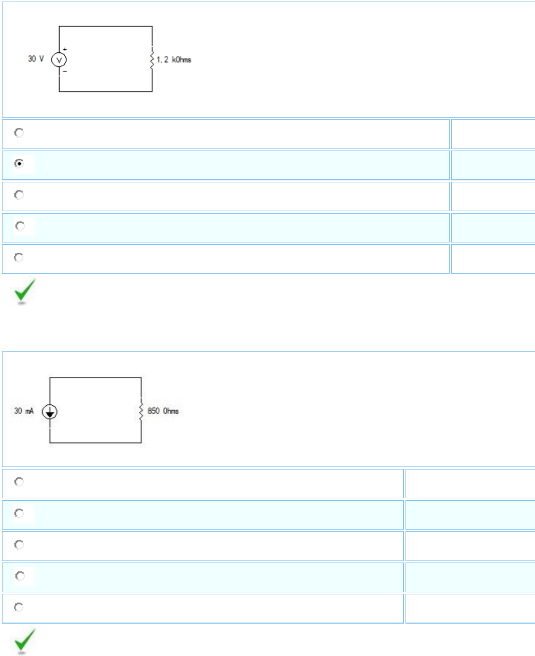 1. A potência dissipada pelo resistor do circuito a seguir é: A a) 0,50 W B 0,75 W C 1,25 W D 2,5 W E 4,50 W Você já respondeu e acertou esse exercício. A resposta correta é: B. A potência dissipada pelo resistor do circuito a seguir é: A a) 0,545 W B 0,675 W C 0,765 W D a) 0,885 W E a) 1,055 W Você já respondeu e acertou esse exercício. A resposta correta é: C. 1. A resistência equivalente entre os pontos a e b da associação a seguir é: A 47 Ω B 340 Ω C 410 Ω D 470 Ω E 500 Ω Você já respondeu e acertou esse exercício. A resposta correta é: D. 1. A resistência equivalente entre os pontos a e b da associação a seguir é: A a) 17 Ω B a) 21 Ω C a) 38 Ω D a) 90 Ω E a) 277 Ω Você já respondeu e acertou esse exercício. A resposta correta é: B. 1. A resistência equivalente entre os pontos a e b da associação a seguir é: A 32 Ω B 53 Ω C 144 Ω D 149 Ω E 237 Ω Você já respondeu e acertou esse exercício. A resposta correta é: B. 1. A resistência equivalente entre os pontos a e b da associação a seguir é: A 163 Ω B 206 Ω C 213 Ω D 324 Ω E 377 Ω Você já respondeu e acertou esse exercício. A resposta correta é: C. 1. A resistência equivalente entre os pontos a e b da associação a seguir é: A 6,5 Ω B 8,7 Ω C 22 Ω D 28 Ω E 44 Ω Você já respondeu e acertou esse exercício. A resposta correta é: B. 1. A tensão V1 indicada no circuito abaixo é: A a) 15 V B a) -15 V C a) 20 V D a) -20 V E a) -25 V Você já respondeu e acertou esse exercício. A resposta correta A. A tensão V1 da fonte, indicada no circuito abaixo é: A -60 V B -36 V C 24 V D 36 V E 60 V Você já respondeu e acertou esse exercício. A resposta correta é: D. A corrente I1 indicada na parte de um circuito a seguir vale: A -0,35 A B -0,85 A C 0 A D 0,35 A E 0,85 A Você já respondeu e acertou esse exercício. A resposta correta é: A. A corrente I1 indicada na parte de um circuito a seguir vale: A -2,5 A B -0,5 A C 0,5 A D 2,5 A E 5,5 A Você já respondeu e acertou esse exercício. A resposta correta é: C. No projeto elétrico de um prédio, comercial ou residencial, o item mais importante a ser dimensionado é a bitola dos fios e cabos que serão usados na instalação por dois motivos: - a queda de tensão nos fios e cabos deve ser a menor possível para que a tensõa de alimentação dos circuitos seja a mais próxima possível da tensão de entrada do prédio (tensão da rede fornecida pela concessionária de energia elétrica). - a corrente elétrica que circulará pelos fios e cabos não pode ultrapassar o valor máximo suportado pelo mesmo para não ocorrer super aquecimento dos condutores. Quanto maior a bitola do fio, menor é a sua resistência e menor é a queda de tensão sobre ele. E quanto maior a bitola do fio maior é a corrente elétrica suportada por ele, porém, em contrapartida, maior é o seu preço. Portanto, o projeto deve considerar todos estes parâmetros, visando o melhor desempenho com o menor custo possível. Agora, considere o projeto de um circuito de um determinado prédio onde o comprimento do par de fios, entre a entrada da rede de 127 V eficazes e o ponto de alimentação, de 550 Watts, é de 30 metros. Existem 5 opções de cabos conforme a tabela abaixo: O cabo mais apropriado para alimentar este circuito, considerando uma queda máxima de tensão de 2,5%, é: A AWG 13 B AWG 14 C AWG 15 D AWG 16 E AWG 17 Você já respondeu e acertou esse exercício. A resposta correta é: C. O valor da corrente I indicada no circuito a seguir é: A 0,400 A B 0,436 A C 0,655 A D 0,667 A E 1,091 A Você já respondeu e acertou esse exercício. A resposta correta é: B. O valor da corrente I indicada no circuito a seguir é: A 0,6 A B 1,0 A C 1,2 A D 1,6 A E 1,8 A Você já respondeu e acertou esse exercício. A resposta correta é: C. A tensão V indicada no circuito a seguir é: A 8,6 V B 10,9 V C 11,5 V D 12,0 V E 12,6 V Você já respondeu e acertou esse exercício. A resposta correta é: B. A tensão V indicada no circuito a seguir é: A 18 V B 24 V C 30 V D 36 V E 42 V Você já respondeu e acertou esse exercício. A resposta correta é: D. A tensão V e a corrente I indicadas no circuito a seguir são, respectivamente: A a) 24,0 V e 0,32 A B 36,0 V e 0,48 A C 42,5 V e 0,6 A D 51,4 V e 0,48 A E 58,2 V e 0,72 A Você já respondeu e acertou esse exercício. A resposta correta é: A. A tensão V e a corrente I indicadas no circuito a seguir são, respectivamente: A a) 50,0 V e 0,40 A B b) 37,5 V e 0,50 A C c) 75,0 V e 0,75 A D d) 50,0 V e 1,00 A E 100,0 V e 0,50 A Você já respondeu e acertou esse exercício. A resposta correta é: B. A tensão V e a corrente I indicadas no circuito a seguir são, respectivamente: A a) 6,0 V e 2,5 mA B 7,0 V e 2,9 mA C 8,0 V e 3,3 mA D 9,8 V e 4,1 mA E 10,5 V e 4,4 mA Você já respondeu e acertou esse exercício. A resposta correta é: A. A tensão V e a corrente I indicadas no circuito a seguir são, respectivamente: A a) 58 V e 1,8 A B -64 V e 2,0 A C 64 V e -2,0 A D 86 V e 2,3 A E 86 V e -2,3 A Você já respondeu e acertou esse exercício. A resposta correta é: E. A corrente I, fornecida pela fonte de tensão às resistências é igual à: A a) 0,234 A B 0,300 A C 0,352 A D 0,420 A E 0,485 A Você já respondeu e acertou esse exercício. A resposta correta é: D. A tensão V sobre a resistência de 100 Ω, indicada no circuito a seguir é igual à: A a) 13,5 V B -13,5 V C 34,0 V D -34,0 V E 42 V Você já respondeu e acertou esse exercício. A resposta correta é: B. A potência dissipada pela resistência de 150 Ω, indicada no circuito a seguir é igual à: A a) 0,80 W B 0,92 W C 1,32 W D 1,40 W E 1,56 W Você já respondeu e acertou esse exercício. A resposta correta é: B. O módulo da tensão sobre a fonte de corrente do circuito a seguir é igual à: A a) 34 V B b) 40 V C c) 65 V D d) 74 V E 80 V Você já respondeu e acertou esse exercício. A resposta correta é: D. As tensões V1, V2 e V3 in