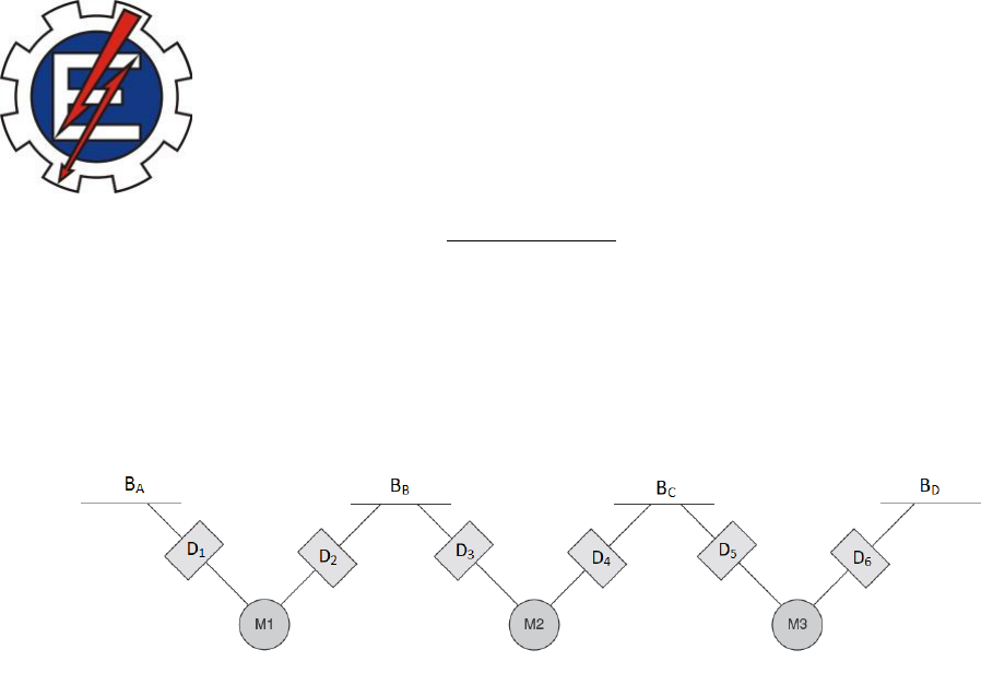 Universidade Federal de Itajubá – campus Itabira Disciplina: Circuitos Lógicos Prof. Dean Karolak Atividade RTE 5 1. Em um sistema de potência, deseja-se alimentar três motores de partida, M1, M2 e M3, a partir de quatro barramentos de alimentação, BA, BB, BC e BD. Cada motor pode ser ligado a dois barramentos através dos disjuntores D1 à D6, vide figura abaixo. Fig. Sistema de alimentação de motores Especificações: • Cada barramento pode alimentar no máximo um motor ao mesmo tempo; • A ordem de prioridade no funcionamento dos motores é M1 > M2 > M3; • Sensores nos barramentos identificam se eles estão energizados. Nível lógico alto tem energia, nível logico baixo sem energia. • Os disjuntores D permanecem abertos em nível logico baixo e fechados em nível logico alto; • Deve-se deixar alimentado a maior quantidade de motores possível ao mesmo tempo; • Em regime de operação normal, ou seja, quando todos os barramentos estão energizados, a ordem de conexão dos motores é: o M1 ao barramento BA; o M2 ao barramento BB; o M3 ao barramento BC. • Quando os barramentos não estiverem energizados, por medidas de segurança, os disjuntores que não estiverem sendo usados deverão estar necessariamente abertos. Projete um circuito digital para controlar os disjuntores deste sistema de potência. 2. Resolva o problema anterior sob as mesmas condições de operação, mas desta vez considere a ordem de prioridade no funcionamento dos motores sendo M3 > M2 > M1. 3. Deseja-se desenvolver um circuito digital para verificar os valores binários em um barramento de dados de 4 bits, D4D3D1D0, onde D4 é o bit mais significativo e D0 o menos significativo. Este circuito deve verificar a compatibilidade do sistema binário com o decimal. Caso os valores em binário estejam compreendidos entre 0 e 9, o circuito deverá fornecer em sua saída S nível lógico alto. Para valores maiores que 9, a saída S deverá fornecer nível logico baixo. 4. Exercício 4.3.1, página 174, do livro Elementos de Eletrônica Digital.