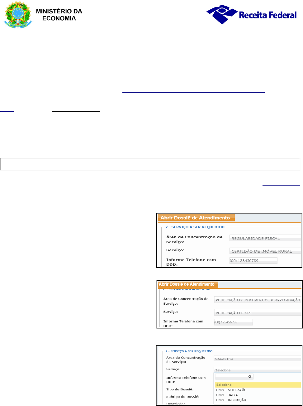 Como protocolar, anexar documentos e acompanhar a análise de um Dossiê Digital de Atendimento (DDA) pelo Portal e-CAC Prezado(a) Contribuinte, Informamos que, com a publicação da Instrução Normativa RFB nº 1.951, de 12/05/2020, o protocolo de Dossiê Digital de Atendimento (DDA) e a anexação de documentos agora podem ser efetivados no e- CAC por meio de código de acesso (antes isso só era possível mediante uso de certificação digital), para os seguintes serviços: Certidão de Regularidade Fiscal (Pessoas Física e Jurídica e Imóvel Rural), Certidão de Averbação de Obra, Retificação de Darf (Redarf), Retificação de GPS (RetGPS), Inscrição/Alteração/Baixa de CNPJ (DBE), entre outros serviços previstos no Ato Declaratório Executivo Cogea nº 01/2019. 1. Como protocolar um DDA? 1. 1 Para solicitar um dos serviços disponíveis via DDA, o contribuinte deverá acessar o Portal e-CAC (https://cav.receita.fazenda.gov.br) e clicar em: Legislação e Processo >> Processos digitais (e-Processo) >> Abrir Dossiê de Atendimento a) Para requerer a Certidão de Regularidade Fiscal, selecione a Área de Concentração de Serviço denominada Regularidade Fiscal e, em seguida, o serviço desejado: certidão de pessoa física ou jurídica, de imóvel rural ou certidão de averbação de obra de construção civil. b) Caso deseje solicitar a Retificação de Documentos de Arrecadação, selecione Área de Concentração de Serviço correspondente e, no campo Serviço, indique se se trata de retificação de Darf (Redarf) ou de GPS (RetGPS) (veja a figura ao lado para melhor compreensão). c) Se sua solicitação se refere à Inscrição, Alteração ou Baixa de CNPJ (DBE), escolha a área Cadastro e, no campo Serviço, identifique a opção desejada. Observe o print da tela à direita. Para solicitar os demais serviços disponíveis, proceda da mesma forma, selecionando a área de concentração desejada e, em seguida, o serviço correspondente. Divisão de Interação com o Cidadão|Superintendência da Receita Federal na 3ª Região Fiscal - Divic03- versão 19/05/20 c Pág. 1 http://normas.receita.fazenda.gov.br/sijut2consulta/link.action?visao=anotado&idAto=109293 https://cav.receita.fazenda.gov.br/ https://cav.receita.fazenda.gov.br/ https://cav.receita.fazenda.gov.br/ http://normas.receita.fazenda.gov.br/sijut2consulta/link.action?visao=anotado&idAto=99408 https://cav.receita.fazenda.gov.br/ https://cav.receita.fazenda.gov.br/ 1.2 Informe obrigatoriamente um número de telefone com DDD, para eventual contato. 1. 3 Clique, por fim, em Abrir Dossiê de Atendimento (DDA). Será gerado o número de protocolo do DDA, ao qual o contribuinte deverá solicitar a anexação da documentação necessária no prazo máximo de 3 (três) dias úteis, por meio do e-CAC (ver item 2 deste Manual), sob pena de arquivamento do dossiê. 2. Como anexar documentos ao DDA? O contribuinte poderá solicitar a juntada da documentação imediatamente após o protocolo (clicando em SIM na tela de geração do número do DDA), mas caso decida fazê-lo apenas posteriormente, deverá: 2.1 Clicar em: Legislação e Processo >> Processos Digitais (e-Processo) >> Meus Processos; 2.2 Localizar o dossiê gerado e clicar em + (à esquerda do número do dossiê); 2.3 Clicar em Solicitar Juntada de Documento, como ilustrado abaixo: 2.4 Clicar então em Adicionar Documento para Rascunho; 2.5 Selecionar em seguida a Classificação, Subclassificação e Tipo do Documento; 2.6 Dar um título ao documento; Atenção 1: caso sua solicitação se refira a uma Inscrição, Alteração ou Baixa de CNPJ, classifique o documento como Pedidos/ Requerimentos, subclassificação Requerimento, tipo de documento Documento Básico de Entrada - DBE e, no campo Título, informe obrigatoriamente o número de controle, contido no quadro 2 do DBE/Protocolo de Transmissão (ADE Cogea nº 8/2019), conforme figura abaixo. Atenção 2: tratando-se de solicitação de Certidão de Averbação de Obra de Construção Civil, classifique o documento como Pedidos/Requerimentos, subclassificação Pedido de Certidão, tipo de documento Pedido de Certidão-Outros e, no campo Título, informe o número do Cadastro Nacional de Obra (CNO), sem traços ou pontos (ADE Cogea nº 8/2019). 2.7 Clicar em ++ Selecionar e selecionar o arquivo que deseja anexar. O nome do arquivo não pode conter acentos nem caracteres especiais, exceto hífen (-) e sublinha ( _ ). Se for o caso, renomeie-o antes de proceder à anexação; 2.8 Clicar em Salvar (caso não esteja vendo essa opção, reduza o nível de zoom de seu navegador); 2.9 Proceder como descrito nos itens 2.4 a 2.8 para anexação de todos os documentos relativos à sua solicitação; 2.10 Clicar por fim, em Enviar Solicitação (caso não esteja aparecendo essa opção, aguarde um pouco, Divisão de Interação com o Cidadão|Superintendência da Receita Federal na 3ª Região Fiscal - Divic03- versão 19/05/20 c Pág. 2 Preencha esse campo com o número de controle: localize-o no quadro 2 do DBE/Protocolo de Transmissão http://normas.receita.fazenda.gov.br/sijut2consulta/link.action?visao=anotado&idAto=103552 http://normas.receita.fazenda.gov.br/sijut2consulta/link.action?visao=anotado&idAto=103552 https://cav.receita.fazenda.gov.br/ pois o sistema poderá levar um tempo para concluir a verificação dos arquivos). Caso esteja tudo certo, será exibida a mensagem: Solicitação enviada com sucesso. Agora basta aguardar a análise de sua solicitação pela Receita Federal. 3. Como acompanhar a análise do DDA? 3.1 Para verificar as Solicitações de Juntada de Documentos já enviadas, acesse o e-CAC e clique em Legislação e Processo > Processos Digitais (e-Processo) > Minhas Juntadas de Documentos. A situação da solicitação poderá estar numa das seguintes situações: “Em análise”, “Aceita”, “Aceita com ressalvas”, “Cancelada” ou “Não aceita”. Caso não tenha sido acei