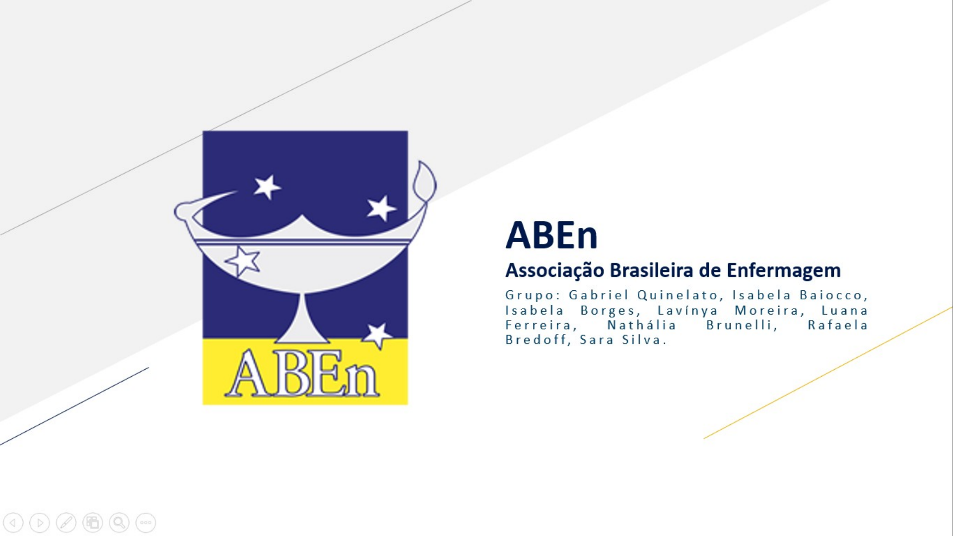 HISTÓRIA Em 1926, as primeiras Enfermeiras formadas pela Escola de Enfermeiras do Departamento Nacional de Saúde Pública, atual Escola de Enfermagem Anna Nery, no Rio de Janeiro, criaram a Associação Nacional de Enfermeiras Diplomadas. Em 1954, a Associação passou a denominar-se Associação Brasileira de Enfermagem (ABEn), mantendo-se com esse nome até a atualidade. SEDE em Brasília, no distrito federal TÉCNICOS VISTORIANDO A CONSTRUÇÃO. PREPARAÇÃO DO TERRENO PARA INÍCIO DAS OBRAS. CONSTRUÇÃO DA FACHADA. CONSTRUÇÃO DO EDIFÍCIO SEDE. INSÍGNIA A insígnia da ABEn foi criada em 1958. Em 1959 é apresentada em sessão solene de abertura do XII Congresso Brasileiro de Enfermagem, passando este distintivo a constar dos documentos oficiais da ABEn. MEDALHA PRESIDENCIAL Em homenagem às Presidentes, o Laboratório Johnson e Johnson do Brasil ofereceu à ABEN um medalhão dourado, com insígnia da Associação em relevo, preso a uma corrente dourada. A medalha presidencial passaria a ser usada em comemorações solenes e nas sessões de instalação e encerramento dos Congressos de Enfermagem. A ABEn é uma associação de caráter cultural, científico e político, com personalidade jurídica própria, de direito privado e que congrega pessoas Enfermeiras; Técnicas de Enfermagem; Auxiliares de Enfermagem; estudantes de cursos de Graduação em Enfermagem e de Educação Profissional de Nível Técnico em Enfermagem; Escolas, Cursos ou Faculdades de Enfermagem; Associações ou Sociedades de Especialistas que a ela se associam, individual e livremente, para fins não econômicos. 8 Tem como eixos a defesa e a consolidação da educação em Enfermagem, da pesquisa científica, do trabalho da Enfermagem como prática social, essencial à assistência social e à saúde, à organização e ao funcionamento dos serviços de saúde. 9 Centro de Educação Centro de Comunicação Social e Publicações Centro de Desenvolvimento da Prática Profissional e do Trabalho de Enfermagem Centro de Estudos e Pesquisas em Enfermagem Centro de Memória da Enfermagem Brasileira Centro Financeiro Departamento Científico de Enfermagem Gerontológica Departamento de Enfermagem psiquiátrica e saúde mental Departamento de Enfermagem na Atenção Básica Departamento Científico de História da Enfermagem REVISTAS