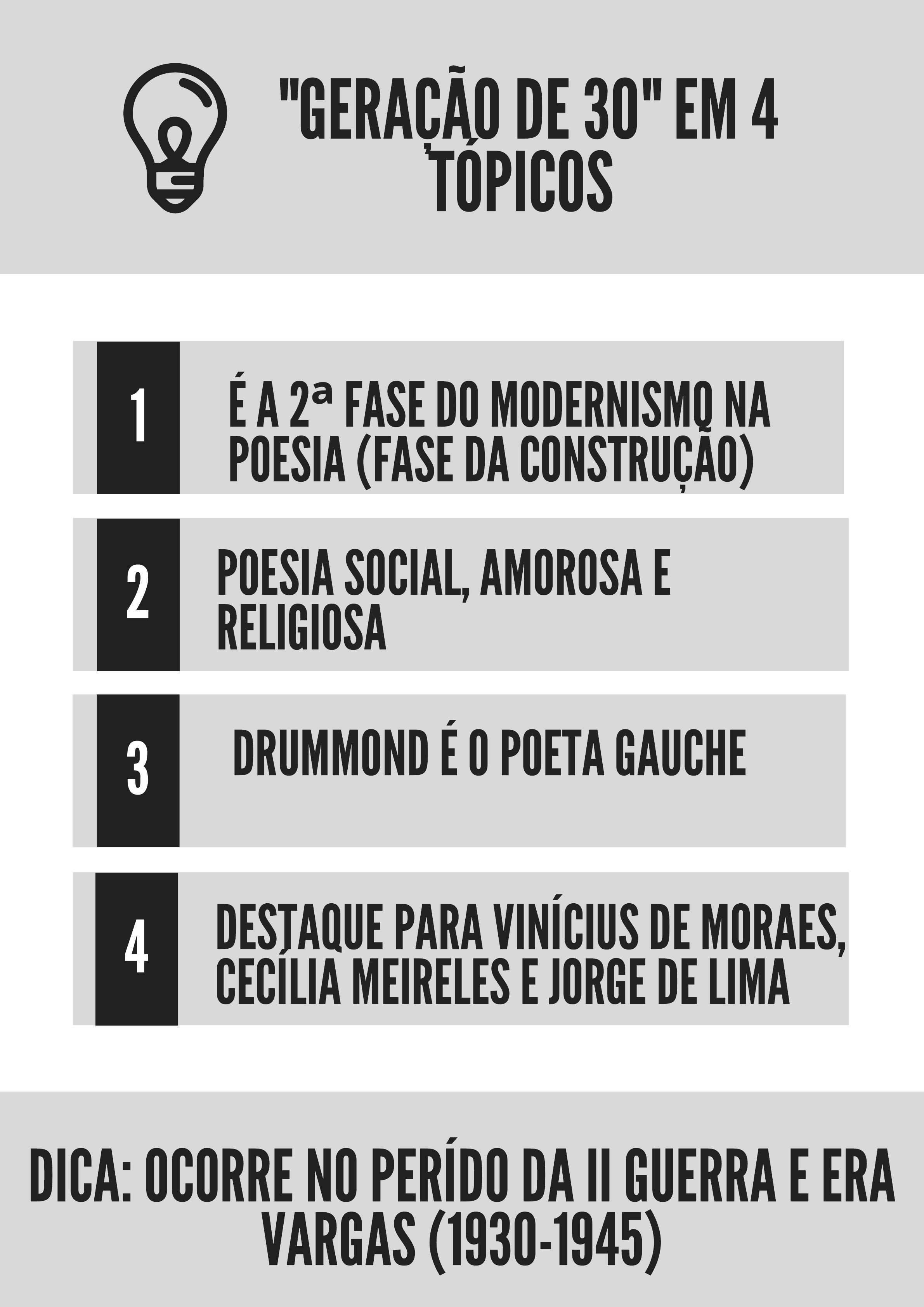 "GERAÇÃO DE 30" EM 4 TÓPICOS DRUMMOND É O POETA GAUCHE DESTAQUE PARA VINÍCIUS DE MORAES, CECÍLIA MEIRELES E JORGE DE LIMA 1 3 4 DICA: OCORRE NO PERÍDO DA II GUERRA E ERA VARGAS (1930-1945) POESIA SOCIAL, AMOROSA E RELIGIOSA2 É A 2ª FASE DO MODERNISMO NA POESIA (FASE DA CONSTRUÇÃO)