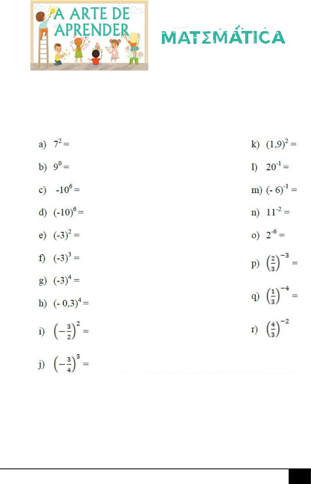 Lista de Exercícios de Potenciação e Notação Científica Professor Derli - Mestre em Ensino de Matemática 27 de maio de 2020 1 Professor Derli - Mestre em Ensino de Matemática 27 de maio de 2020 5 1) Efetue o cálculo das potências abaixo: 2) 3) Resolva as expressões abaixo utilizando as propriedades das potências: 4) Classifique como verdadeiro (V) ou falso (F): 5) Se . Qual é o valor de xyz? 6) Calcule as expressões: a) b) c) d) e) f) g) h) 7) . O x é maior, igual ou menor que o y? 8) Apresente o resultado na forma de decimal: 9) Escreva os números abaixo com potências de base 10: 10) Reescreva os números abaixo na forma decimal: 11) Apresente na forma de notação científica: 12) Resolva e apresente o resultado em notação científica: