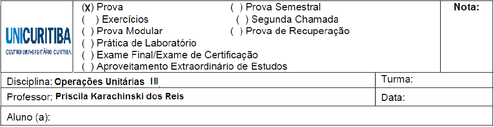 Estudo de caso A1 Operações Unitárias 3, valor: 20 pontos Entrega individual para o e-mail: priscila.karachinski@unisociesc.com.br até 23/09/2020 1) (1 pontos) Considere um equipamento tipo misturador-decantador de 1 estágio para a recuperação de etilenoglicol a partir da água, utilizando como solvente furfural. Considere também o diagrama ternário do sistema água/furfural/etilenoglicol (ANEXO 1) a) Calcule as composições de equilíbrio na saída do equipamento (R e E), o qual opera nas seguintes condições: corrente de solvente (105 kg/h), 84% furfural, 5% de etilenoglicol e o restante sendo água; corrente de alimentação (200 kg/h), 43% de etilenoglicol e 57% água. b) Determine as vazões do Extrato e do Refinado. Consulte os exercícios da lista 1 e slides da aula 2 2) (1 pontos) Em um determinado processo industrial deseja-se extrair álcool isopropílico (IPA) de uma mistura contendo 45% de álcool isopropílico e 55% de éter diisopropílico. A mistura entra no extrator com uma vazão de 1000 kg/h e o solvente utilizado, água pura, com vazão de 1500 kg/h. Deseja-se obter um refinado com 5% de IPA. Determine (Método Hunter Nash): a) O número de estágios de equilíbrio para realizar esta operação. b) As vazões de saída e a composição de extrato e refinado; (ANEXO 2) ANEXO 1 ANEXO 2 ANEXO 3
