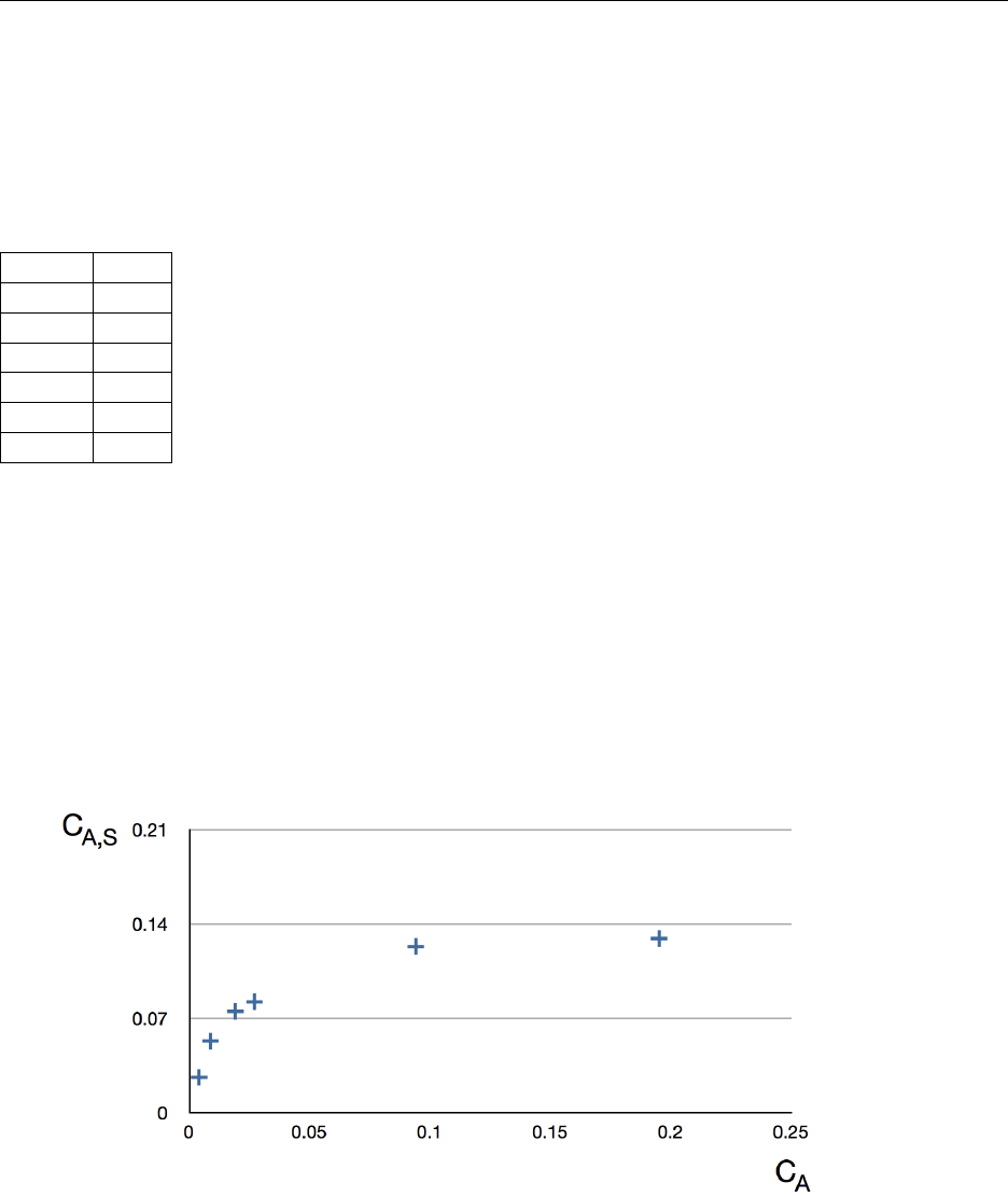 Separation Processes, ChE 4M3, 2012 Assignment 5 Kevin Dunn, kevin.dunn@mcmaster.ca Due date: 03 December 2012 Objectives: Confirming your understanding of liquid-liquid extraction and adsorption. Question 1 [20] 2.5m3 of wastewater solution with 0.25 kg phenol.m−3 is mixed in a batch reactor with 3.0 kg granular activated carbon until equilibrium is reached. Use the following values determined in the lab, calculate the final equilibrium values of phenol extracted and percent recovery. CA CA,S 0.004 0.026 0.0087 0.053 0.019 0.075 0.027 0.082 0.094 0.123 0.195 0.129 1. Plot the isotherm. 2. Determine the isotherm type. 3. Calculate the isotherm parameters. 4. Calculate the steady-state conditions in the batch reactor for CA in g.cm−3 and for CA,S in grams solute per gram of activated carbon. 5. Calculate the percentage amount of phenol that is recovered by the adsorbent. Solution 1. The isotherm is plotted as: 2. It is a Langmuir isotherm, apparent from the plot’s shape. 3. Parameters for the isotherm are estimated so that CA,S = K5CA K6 + CA = 0.140CA 0.0162 + CA . See this spreadsheet for the detailed calculations. You must use an Eadie-Hofstee plot where you plot y = CA,S vs x = CA,S CA . Then the slope is −K6 and the intercept is K5. The Lineweaver-Burk plot accumulates too much error and should not be used. Also, it is not valid to use 2 of the data points to back-calculate 2 unknowns: if they were measured in error, then those parameters will be poorly estimated. 4. There are 625 g of phenol added to the batch system. This separates into two components: the amount adsorbed and the amount remaining in solution: 0.625 = (2.5m3)(CA) + (3 kg)(CA,S) After adjusting the above equation for units, we see it is a straight line that can be plotted over the isotherm. It passes through the point (CA, CA,S) = (0, 0.208) and (CA, CA,S) = (0.25, 0) on the x- and y-axes respectively. It is left up to you to connect these points on the plot. You will find where it crosses the isotherm, which is approximately at CA = 0.1 g.cm−3. This is the final equilibrium point. The concentration on the adsorbent at this point is approximately CA,S = 0.120 grams solute per gram of activated carbon (from the isotherm equation). Alternatively you may solve the linear equation above and the non-linear Langmuir isotherm equation for the two unknowns. Or do it graphically as described above. 5. The phenol recovered onto the adsorbent is 0.120 g/g × 3000g = 360g of the original 625g added. This is a recovery of about 58%. Question 2 [20] The aim is to recover ethylene glycol from water using furfural as solvent (the ternary diagram for furfural, ethylene glycol and water at the unit’s operating temperature is provided). 2 https://docs.google.com/spreadsheet/ccc?key=0AtqiArsxgE8YdENZc3NJSC1vNW9LcUFnUXVLa0E2SkE https://docs.google.com/spreadsheet/ccc?key=0AtqiArsxgE8YdENZc3NJSC1vNW9LcUFnUXVLa0E2SkE http://en.wikipedia.org/wiki/Eadie%E2%80%93Hofstee_plot http://en.wikipedia.org/wiki/Lineweaver%E2%80%93Burk_plot 1. Calculate the equilibrium compositions leaving a single mixer-settler unit operated at: • the recycled solvent stream: 105 kg.hr−1 with a composition of 84% furfural, and unrecovered ethylene glycol at 5%, with the rest being water. • the feed stream contains 42% ethylene glycol and 58% water at a rate of 200 kg.hr−1. 2. Calculate the flow rates of the extract and raffinate streams. 3. What is the distribution (partition) coefficient, DA, for A = ethylene glycol (see course notes for definition)? 4. What is the distribution (partition) coefficient, DC, for C = water, using this same definition? 5. What is the separation factor for i = ethylene glycol from j = water in the 1=extract and 2=raffinate streams? Also show the relationship between the separation factor and the previous two distribution coefficients. 6. What will happen to the separation factor when operating at a lower feed flow rate; show a construction on your diagram to demonstrate it. Solution 1. From the ternary diagram constructions we obtain (approximately): E R yE,A = 0.09 xR,A = 0.37 yE,S = 0.87 xR,S = 0.10 yE,C = 0.04 xR,C = 0.53 E = 73 kg.hr−1 R = 232 kg.hr−1 2. See above, also calculated from the lever rule on the diagram. 3. Distribution (partition) coefficient for A = ethylene glycol = DA = yE,A xR,A = 0.09 0.37 = 0.24 4. Distribution (partition) coefficient for C = water = DC = yE,C xR,C = 0.04 0.53 = 0.075 5. The separation factor is Si,j = xi,1/xj,1 xi,2/xj,2 = SA,C = xE,A/xE,C xR,A/xR,C = xE,A xR,A ·xR,C xE,C = DA DC = 0.24 0.075 = 3.2, which is very low, as expected from the construction on the ternary diagram. 6. At a lower feed flow our operating point moves to M∗. From the lever rule you can easily show this implies SM∗ length has decreased from SM and length FM∗ has increased relative to FM . A tie line through this new operating point leads to equilibrium concentrations: E∗ R∗ yE*,A = 0.06 xR*,A = 0.25 yE*,S = 0.89 xR*,S = 0.09 yE*,C = 0.05 xR*,C = 0.66 from which we find the new separation factor is Si,j = SA,C = xE*,A/xE*,C xR*,A/xR*,C = (0.06)/(0.05) (0.25)/(0.66) = 3.16, which really didn’t change our separation factor much. This makes sense from the attached ternary diagram. We see that both the extract and raffinate concentrations dropped. This system has tie lines that don’t work in our favour. All we can do is add many sequential stages to the system in order to achieve a higher degree of separation. 3 4 Question 3 [40] Consider a system for which you have been given the ternary diagram. A = solute, S = solvent, C = carrier. The feed, F , enters at 112 kg/hr with composition of 25 wt% solute and 75 wt% carrier, shown as point F . 1. Calculate the flow and composition of the extract and raffinate from (covered in class): (a) 1st co-current stage, using a pure solvent flow of 50 kg/hr. (b) 2nd co-current stage, which is few with an a fresh solvent flow of 50 kg/hr. 2. For the overall 