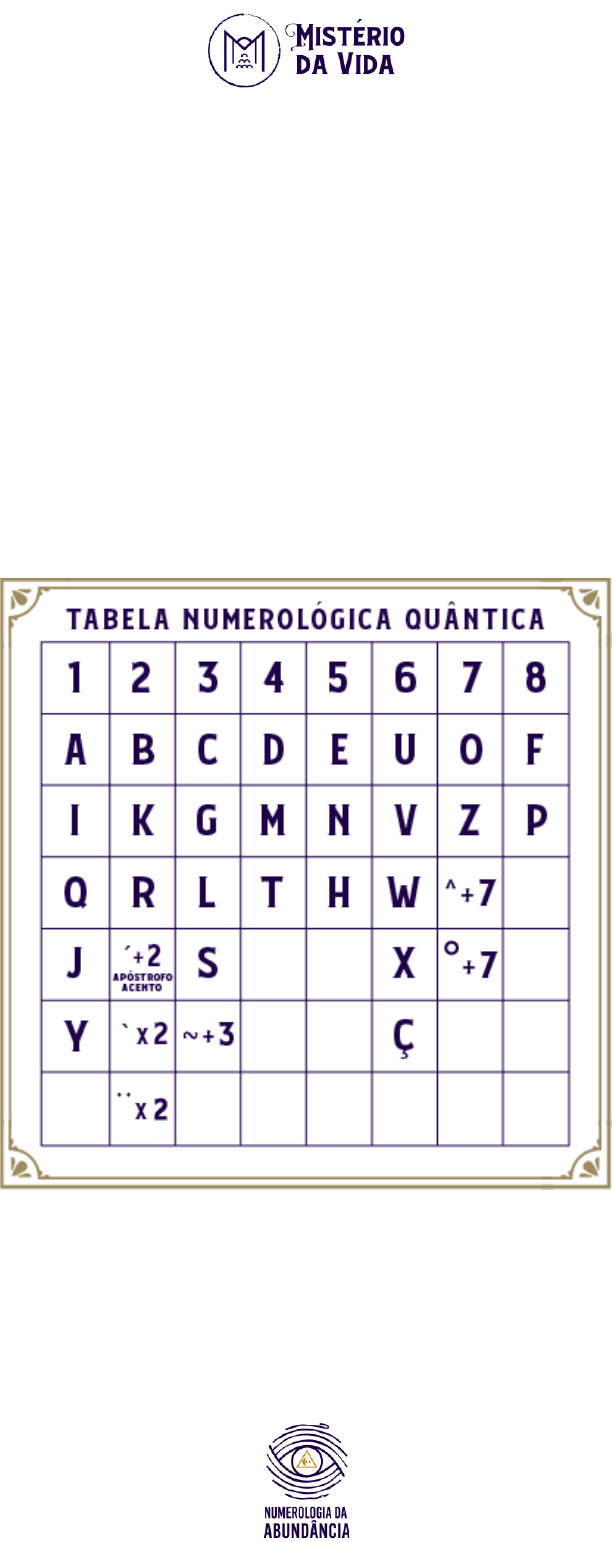 1 COMO PREENCHER O QUADRO NUMEROLÓGICO PESSOAL 1. NOME Preencha o nome completo idêntico ao do registro de nascimento, sem se esquecer de acentos e erros ortográficos, se tiver. De acordo com a tabela de números das letras, coloque na linha as Vogais o valor de cada vogal, e na linha Consoantes o valor de cada consoante. Em seguida, coloque todos esses valores na linha Total, não separando o que é vogal de consoante. 2. NÚMERO DE ESTÍMULO Some o valor de todas as vogais. 11 e 22 não se reduzem. Colocar o resultado campo Estímulo. 2 3. NÚMERO DE APRESENTAÇÃO Some o valor de todas as consoantes. 11 e 22 se reduzem a 2 e 4. Colocar o resultado campo Apresentação. 4. NÚMERO SOCIAL Some o valor de toda linha Total. 11 e 22 não se reduzem. Colocar o resultado campo Social. 5. CASA 1 (apoio de cálculos) Avalie a linha Total de seu nome e coloque ao lado de cada número da tabela Casa 1 a quantidade que este aparece em sua linha Total. 6. CASA 2 (Lições Cármicas) Procure por um número de 1 a 9 que não apareça na linha Total do seu nome. O número ausente deve ser colocado na Casa 2. Obs: não existe uma letra que correspode ao número 9, porém uma letra pode chegar ao número 9 através de acentuação. Portanto, você deve procurar também este número na sua linha Total. 7. CASA 3 (Desejos carnais passados) São os números que aparecem três vezes ou mais na Casa 1 (a partir de quatro vezes, o consulente sente mais). 8. CASA 4 (resposta subconsciente) Deve-se subtrair do número nove a quantidade de números/lições cármicas indicadas na Casa 2. 3 9. DATA NATAL Preencher com a data de nascimento, inclusive número zero (exemplo: dia 03 de nascimento). 10. DATA NATAL Preencher com a data de nascimento, inclusive número zero (exemplo: dia 03 de nascimento). O número de cada dia de nascimento representa um tipo diferente de personalidade. 11. NÚMERO DE DESTINO Soma reduzida de todos os algarismos da data de nascimento: d+ d + m + m + a + a + a + a. Os números 11 e 22 não devem ser reduzidos. Se esse resultado for 2 ou 4, é necessário refazer o cálculo para: Além disso, se o resultado desse cálculo der 2 ou 4 após redução, deve-se realizar a seguinte conta: (d+d) + (m+m) + (a+a+a+a), somando o resultado da redução de Dia com Mês e Ano. Logo, soma-se os conjuntos, e não os algarismos avulsos, como no primeiro caso. Neste caso, o resultado final também não deve ter 11 e 22 reduzidos. 12. DÍVIDAS CÁRMICAS Os nascidos nos dias 13, 14, 16, ou 19 (não importa o mês) tem dívidas cármicas correspondentes ao dia do nascimento. Além disso, se algum dos números de Destino, Estímulo e Social forem 4, 5, 7, e 1 a pessoa terá dívida cármica 13, 14, 16 e 19 respectivamente. 13. MISSÃO DE VIDA Soma do Número de Destino com Número Social, reduzida. 11 e 22 não se reduzem. 4 14. CASA 5 (Ciclos de Vida) 1° ciclo: soma reduzida do mês de aniversário. 11, de novembro, não se reduz. Período dura “37-Número de Destino”. Exemplo: 37-4=33 anos de duração. 2° ciclo: soma reduzida do dia de nascimento. 11 não se reduz, contudo 22 sim. Período dura 27 anos a partir do fim do 1° ciclo. 3° ciclo: soma reduzida do ano de nascimento. 11 e 22 não se reduzem. Período prevalece a partir do final do 2° ciclo. 15. CASA 6 (Ciclos de Desafio) 1° desafio: deve-se pegar o dia e mês de nascimento (reduzidos), e subtrair o menor número do maior. 2° desafio: deve-se pegar o dia e ano de nascimento (reduzidos), e subtrair o menor número do maior. 3° desafio: deve-pegar os resultados dos 1° e 2° desafios, e subtrair o menor do maior número. Avisos: se os números de destinos forem iguais aos números de ciclo de vida ou ao número do momento decisivo, desafioa mais difíceis. Já se um dos números do desafio for igual a um dos números de um dos momentos decisivos no mesmo período há indicações de problemas de saúde dentro do ciclo. 16. CASA 7 (Momentos de Decisão) 1° momento: soma reduzida do dia e mês de nascimento. Sua duração equivale ao 1° ciclo da Casa 5 (Ciclo de Vida). 2° momento: soma reduzida do dia e ano de nascimento. Sua duração equivale a 9 anos a partir do fim do 1° momento. 3° momento: soma do resultado do 1° momento com o 2° momento. Sua duração equivale a 9 anos a partir do fim do 2° momento. 4° momento: soma reduzida do mês e ano de nascimento. Sua duração equivale vai do final do 3° momento até fim da vida. 17. CASA 8 (Dias Favoráveis) 5 Encontre os dias favoráveis do mês (seus dias da sorte) de acordo com a tabela abaixo. Para descobrir os demais dias da sorte (número que pode ir a no máximo 31, afinal, um mês tem 31 dias), o passo-a-passo é: 1) Os dois primeiros dias serão retirados da tabela a seguir. 2) O terceiro dia é calculado dobrando ( x2) o segundo número. 3) Deve-se somar o terceiro número com o primeiro número retirado da tabela. 4) Deve-se somar o quarto número com o segundo número retirado da tabela. 5) Deve-se somar o quinto número com o primeiro número retirado da tabela. 6) Deve-se somar o sexto número com o segundo número retirado da tabela. 7) Repetir essa intercalação (último resultado + 1º ou 2º número da tabela) até o número 31. Ou parar se a soma der mais que 31. 6 7 18. DATAS Data de feitura: preencher com data em que o quadro está sendo feito. Ano presente: o ano que a pessoa atravessa sua vida. O último ano no qual fez aniversário, podendo ser o atual ou o ano anterior (se seu aniversário ainda não chegou neste. 19. ANO PESSOAL Somar o dia de nascimento, o mês de nascimento com o ano presente. Por exemplo: nascido no dia 18/04/1992, que fez aniversário pela última vez em 2017. Qual o seu Ano atual? 1+8+0+4+2+0+1+7 = 23 = 5. 20. COR Resultado de acordo com o Número Social do indivíduo. 21. CASA 9 (Relações Valorativas) Observe a sua Casa 1. Há Relações Valorativas quando um dos números de sua Casa 1 aparece, pelo menos, o dobro de vezes em