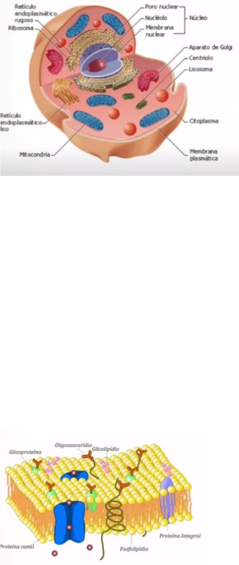 Citologia Cito=célula logia =estudo Citologia=estudo das células Célula Animal é a unidade funcional básica do corpo humano Células seriam mini fabricas no nosso corpo e cada uma tem um funcionamento especifico no corpo humano Existem dois tipos de células, as procariontes e eucariontes Procariontes são células que não possuem núcleos, elas não um núcleo delimitado por uma membrana, fazendo com que seu material genético fica espalhado na célula. As bactérias são exemplo de organismo procariontes Eucariontes: são células mais complexas elas possuem uma organela chamada núcleo celular, possuindo uma membrana e esse material genético (DNA e RNA), eles estão organizados dentro desse núcleo. A referência do nome CARIONTE, vem de carioteca, porque a membrana do núcleo a membrana nuclear é chamada também de carioteca O meio interno da célula Eucariontes é chamado de citoplasma, composta por uma parte liquida chamada de citosol ou hialoplasma e por organelas celulares., tudo o que está dentro da membrana, região entre a membrana e o núcleo, local onde encontramos as organelas celulares, (seria os setores da fábrica, responsável pela limpeza, produção de energia e desenvolvimento de produtos.) Nem toda célula são circulares, cada uma possui um formato e estão em diferentes locais A MEMBRANA CELULAR conhecida também como membrana plasmática, essa membrana é o uma película que envolve a célula, é uma dupla camada complexa formada em sua maior parte de molécula de fosfolipídios, também podemos encontrar na membrana plasmática diversas proteínas, possuindo diversas funções. Entre essas funções é a entrada e saída de substancias da célula, ou reconhecimento de substâncias ou outras células possam se aproximar. A Permeabilidade seletiva, tem a capacidade de selecionar aquilo que entra e sai. (como se fosse o portão de uma fábrica, responsável pelo o que entra e sai.) O CITOESQUELETO: uma malha de filamentos proteicos, que ajuda a manter o formato das células e ajuda também no transporte de organelas dentro das células NÚCLEO: é arredondado ou oval, que possui uma dupla membrana a cario teca ou envelope nuclear, a sua função é separar o meio interno do núcleo, do meio externo (citoplasma). Essa membrana nuclear possui poros, que controla o movimento de substancias entre o núcleo e o citoplasma. Essa membrana nuclear forma um alongamento que é continuo com uma outra organela celular chamada de reticulo endoplasmático rugoso. O DNA e o RNA, ficam dentro do Núcleo, em uma estrutura mais condensada chamada de Nucléolo, o nucléolo tem sua maior composição de RNA ribossomos Reticulo endoplasmático liso e reticulo endoplasmático rugoso RETICULO ENDOPLASMÁTICO RUGOSO é uma rede de membrana que possui associado a ele Ribossomos, essa membrana é de formato achatadas O Reticulo endoplasmático rugoso está associado aos ribossomos, ele ter uma função relacionada a síntese de proteínas que é a função dos ribossomos, ele possui enzimas capaz de processar as proteínas que são produzidas pelos Ribossomos RETICULO ENDOPLASMÁTICO LISO, que é continuo com o reticulo rugoso, sem presença de Ribossomo de formato mais cilíndrico. Elle está relacionado com a produção de alguns lipídios, temos por exemplo hormônios chamados de esteroides que são hormônios que possui gordura lipídios na sua composição., importante também na inativação de substancias toxicas como o álcool. O fígado (responsável por metabolizar substancias toxica como o álcool.) Possui grande extensão de reticulo liso. RIBOSSOMOS: são organelas não membranosa, que tem como função a produção de proteínas. O RNA e proteínas, ambos livres e aderidos ao RE granular. Os ribossomos estão envolvidos nas sínteses proteicas realizando a tradução do código genético dos aminoácidos sob a direção do RNAm PEROXISSOMOS: pequenas vesículas contendo enzimas que degradam o peroxido de hidrogênio e os ácidos graxos COMPLEXO DE GOLGI: pilhas achatadas de membranas que modifica e empacotam proteínas (produzidas pelos ribossomos fora da célula ) e lipídios para utilização intracelular e extracelular. MEMBRANA PLASMATICA: a membrana da célula composta de uma bicamada lipídica que atua na proteção, secreção, absorção, sensibilidade, adesão e sustentação. A membrana plasmática também pode fundir-se a vesículas secretoras para liberar seu conteúdo em um processo denominado exocitose, ou englobar substancias extracelulares em um processo denominado pinocitose. A membrana também pode possuir receptores especializados ao longo da sua superfície CITOPLASMA: matriz aquosa da célula externa ao núcleo, contendo íons inorgânicos, moléculas orgânicas, metabolitos intermediários, hidrocarbonetos, proteínas, lipídios e RNA MITOCÔNDRIA: produz ATP através da fosforilação oxidativa da energia. As mitocôndrias possuem uma membrana externa é lisa e uma membrana interna rugosa. A mitocôndria é a usina de energia de nossas células, dentro da mitocôndria que acontece a respiração celular, aonde a mitocôndria utiliza o oxigênio para produzir ATP, o ATP é produzido a partir dos nutrientes que ingerimos e o oxigênio e acaba produzindo como resíduo o gás carbônico Curiosidade: mitocôndria é uma organela que produz seu próprio DNA e é herdado de nossa mãe.. LISOSSOMOS: são veículos formados no complexo de golgi e que possuem em seu interior vesículas contendo enzimas digestivas RETICULO ENDOPLASMATICO: rede membranácea no citoplasma, associado aos ribossomos para a síntese proteica (RE granular, 7 A) ou sem ribossomos envolvido com a síntese de lipídios e esteroides (RE agranular, 7B) CENTRÍOLOS: inclusões pareadas essenciais para o movimento dos cromossomos na divisão celular NUCLÉOLOS: condensação de RNA e proteínas dentro do núcleo NÚCLEO CELULAR: estrutura envolt por membranas (interna e externa) que co