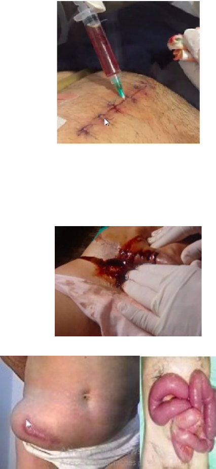 COMPLICAÇÕES PÓS OPERATÓRIAS Prof. Danilo Faria - Complicações PO são frustantes e de díficil tratamento - Apesar das habilidades técnicas do cirurgião, as complicações são uma possibilidade real - Risco de complicações diminui com: Cuidadosa avaliação pré operatória Realização cuidadosa dos tempos e técnica cirúrgica Vigilância pós operatória - Pronta resposta a complicação faz diferença marcante entre uma complicação breve e inconveniente e uma complicação devastadora e incapacitante COMPLICAÇÕES DA FERIDA OPERATÓRIA Seroma: - Coleção de gordura liquefeita, soro e linfa sob a incisão, no TCSC - Complicação benigna, particularmente comum em grandes dissecções de TCSC e obesos - Líquido claro, amarelado, viscoso - Abaulamento na ferida operatória, com desconforto e ocasionalmente com drenagem pela FO - Aspiração sob técnica asséptica associada a curativo compressivo está indicada - Seroma reacumula após 2 aspirações, em geral deve ser esvaziado com abertura na FO, parcial ou completa - Se houver tela na FO, esta deve ser retirada na presença de infecção secundária Hematoma: - Coleção anormal de sangue, em geral no TCSC, ou em espaço na cavidade após exérese de um órgão - Mais preocupantes que os seromas pelo maior risco de infecção secundária - Formação relacionada com hemostasia, fatores de coagulação, coagulopatia - Manifestações variáveis, abaulamento, tumefação em expansão ou dor na incisão - Pode comprimir estruturas (pescoço e extremidades), causar anemia e consumo de fatores de coagulação com coagulopatia secundária - Abaulamento macio, azul-arroxeado, por ventura com drenagem pela FO - Previne-se com correção de distúrbios de coagulação e suspensão de medicamentos que alterem a cascata de coagulação e agregação plaquetária: Pesar risco benefício de sangramento X eventos tromboembólicos - Hemostasia adequada e drenagem de espaços grandes com potencial acúmulo de líquidos - Hematomas pequenos em geral são reabsorvidos - Hematomas maiores ou em expansão necessitam ser evacuados cirurgicamente Eventração e Evisceração (Deiscência da FO): - Deiscência é separação das camadas musculoaponeuróticas Deiscência de FO: Pele Eventração: Aponeurose, com pele íntegra Evisceração: Pele e aponeurose com saída de conteúdo abdominal - Entre as complicações mais temidas por necessidade de reoperação, infecções e hérnia incisional - Mais frequente entre o sétimo ao décimo dia de PO, mas pode ocorrer em qualquer período desde POI - Erros técnicos: suturas muito próximas ou distantes da margem, ou sob tensão - Complicações da FO: infecção de FO, hematomas - Outros fatores: Pressão Intrabdominal (PIA) aumentada, uso de corticóides - Não há diferença entre suturas contínuas ou separadas: avaliar o fechamento contínuo em pacientes de risco, pois a abertura de um ponto afeta toda a cicatriz - Em 25% a drenagem de líquido claro em grande volume precede a deiscência - Pode haver evisceração súbita, sem sinais anteriores - Enventrações pequenas, no décimo ao décimo segundo dia de PO, podem ser tratadas de maneira conservadora com curativos e cinta abdominal - Eviscerações devem ser tratadas com cirurgia Cobrir alças com compressa úmidas com SF até a cirurgia Explorar cavidade abdominal em busca de abscessos, hematomas ou deiscência de anastomose - Aponeurose forte e intacta, ressutura de parede - Aponeurose infectada ou necrótica, desbridar e avaliar ressutura - Tensão na sutura, sem infecção, avaliar uso de telas - Tensão na sutura, infecção ou impossibilidade de fechamento, fazer peritoniostomia Evitar aumento da PIA Fechamento primário após 7 a 10 dias Cicatrização por segunda intenção com provável hérnia incisional - Alternativa á peritoniostomia são os curativos a vácuo Pressão negativa na FO Bomba á vácuo, reservatório com conectores de tubos e espuma com poros abertos, gaze e curativo oclusivo Cobertura imeadiata da parede, minimiza a PIA, contrai a ferida e remove líquidos, induz a proliferação celular Acelera a cicatrização e permite fechamento da aponeurose em 85% das vezes Infecção do Sítio Cirúrgico: - Problema significativo para os cirurgiões - Representam fator de risco para deiscências da FO e hérnia incisional - São responsáveis por 40% das infecções hospitalares - Superficiais, Profundas ou Intracavitárias Superficiais: Pele e TCSC Profundas: Aponeurose e músculo Intracavitária: órgãos e espaços internos - Contaminação do local cirúrgico com microrganismos da flora do paciente ou quebra da técnica asséptica e antisséptica da equipe e ambiente - 50% são bactérias Gram +, sendo o S aureus o mais comum - 1/3 apresentam bacilos Gram-, E coli e Pseudomonas - Em cirurgias de TGI predominam Gram - - Estreptococos e Clostridium são raros - Em geral ocorrem no quinto ao sexto dia de PO, e 80 a 90% ocorrem nos primeiros 30 dias - Superficiais e profundas apresentam eritema, dor, edema, com flutuação e por vezes drenagem de secreção - Pode haver leucocitose e febre - Profilaxia pré operatória é recomendada para cirurgias potencialmente contaminadas e contaminadas e em procedimentos com uso de prótese - Cirurgias infectadas o ATB é terapêutico e não profilático - Cirurgias limpas o uso é controverso - Uso de prótese: Cefalosporina de primeira geração (Cefazolina) - Trato GI, via biliar e cólon: Cefalosporina de segunda geração (Cefoxitina) - Deve ser administrado na indução anestésia, 30 minutos antes da incisão, para que haja concentração em nível tecidual na exposição da ferida - Não deve ser mantido por longo tempo no PO Dose única Replicação de acordo com tempo da cirurgia Suspenso no máximo no primeiro dia PO O tratamento dependa da profundidade da infecção Superficiais e profundas a drenagem e abertura da FO costumas ser eficientes Se houver comprometimento