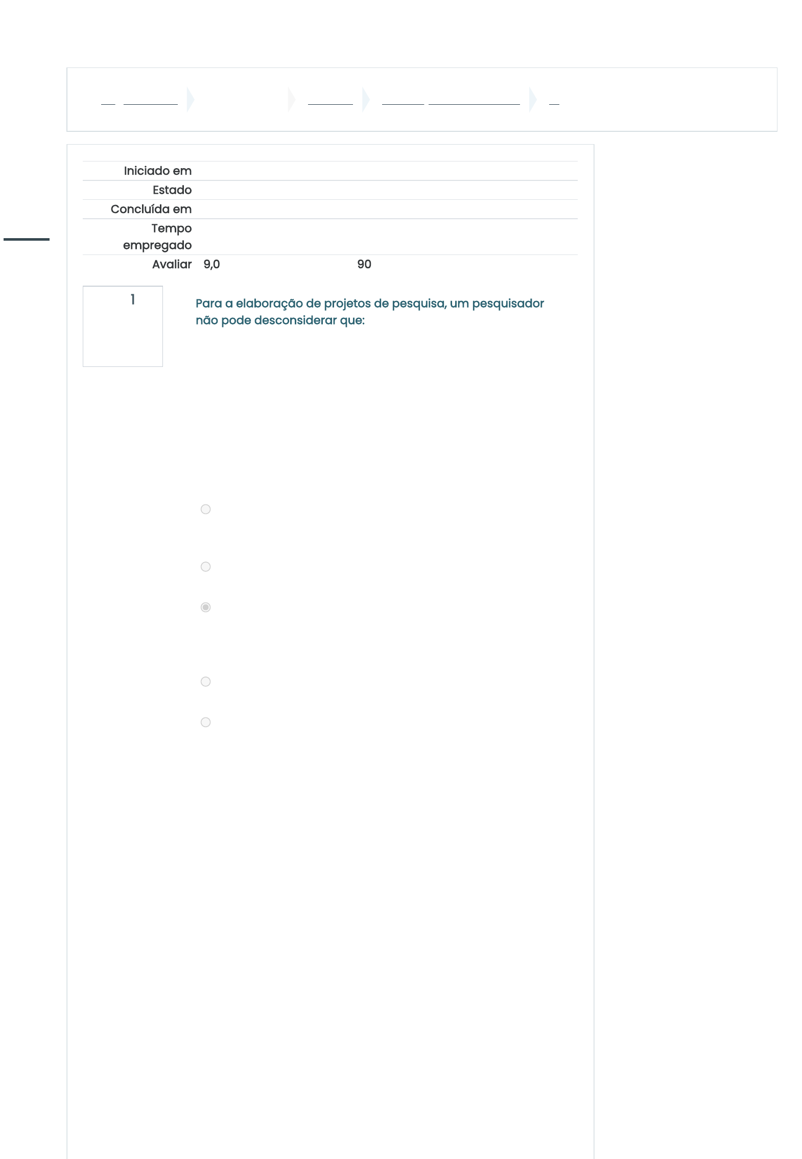 Página inicial Meus cursos N0013N1 AVALIAÇÃO A DISTÂNCIA T1 Questão 1 Correto Atingiu 1,0 de 1,0 Iniciado em terça, 15 Set 2020, 18:50 Estado Finalizada Concluída em terça, 15 Set 2020, 19:56 Tempo empregado 1 hora 6 minutos Avaliar 9,0 de um máximo de 10,0(90%) Para a elaboração de projetos de pesquisa, um pesquisador não pode desconsiderar que: Escolha uma: a. a metodologia da pesquisa apresentará apenas as providências administrativas para a realização da pesquisa. b. somente será válida a definição de um tema inédito e original. c. as fontes nas quais serão buscados os dados necessários ao desenvolvimento da pesquisa dependerão do tipo de informação exigido pelo problema de pesquisa. d. o problema de pesquisa deve ser apresentado na forma de objetivos: geral e específicos. e. o referencial teórico não precisa ser previsto no projeto, pois dependerá das condições de realização da pesquisa. Sua resposta está correta. A resposta correta é: as fontes nas quais serão buscados os dados necessários ao desenvolvimento da pesquisa dependerão do tipo de informação exigido pelo problema de pesquisa.. https://ead.universo.edu.br/ https://ead.universo.edu.br/course/view.php?id=148 https://ead.universo.edu.br/course/view.php?id=148#section-7 https://ead.universo.edu.br/mod/quiz/view.php?id=144162 javascript:void(0); https://ead.universo.edu.br/user/index.php?id=148 https://ead.universo.edu.br/badges/view.php?type=2&id=148 https://ead.universo.edu.br/admin/tool/lp/coursecompetencies.php?courseid=148 https://ead.universo.edu.br/grade/report/index.php?id=148 https://ead.universo.edu.br/ https://ead.universo.edu.br/my/ https://ead.universo.edu.br/calendar/view.php?view=month&course=148 javascript:void(0); https://ead.universo.edu.br/user/files.php Questão 2 Correto Atingiu 1,0 de 1,0 Questão 3 Correto Atingiu 1,0 de 1,0 Leia o diálogo para responder a questão a seguir – Primeiro você acessa o browser, aí clica no link que se parece com um guarda-chuva... / quando a página aparece, vai para o menu e rola para baixo até brilhar o nome da cidade... / então clica no lugar onde diz “previsão”, seleciona “hoje” e aí tem “chuva”! – E se eu olhasse pela janela? – Por que ter todo esse trabalho se o computador está bem aqui? O HUMOR do texto reside no seguinte fato: Escolha uma: a. A influência do uso do computador nos hábitos familiares b. O computador foi inventado para facilitar a atividade intelectual do homem c. As pessoas são analfabetas digitais. d. Inovações tecnológicas nem sempre facilitam a vida. e. As crianças não sabem usar o computador A resposta correta é: Inovações tecnológicas nem sempre facilitam a vida.. Entendido(a) como prática acadêmica que interliga a universidade, nas suas atividades de ensino e de pesquisa, com as demandas da maioria da população, possibilita essa formação do profissional cidadão e se credencia cada vez mais junto à sociedade como espaço privilegiado de produção do conhecimento significativo para a superação das desigualdades sociais existentes. Essa definição diz respeito à(ao): Escolha uma: a. extensão universitária. b. ensino. c. práxis social. d. pesquisa acadêmica. e. metodologia científica. Sua resposta está correta. A resposta correta é: extensão universitária.. javascript:void(0); https://ead.universo.edu.br/user/index.php?id=148 https://ead.universo.edu.br/badges/view.php?type=2&id=148 https://ead.universo.edu.br/admin/tool/lp/coursecompetencies.php?courseid=148 https://ead.universo.edu.br/grade/report/index.php?id=148 https://ead.universo.edu.br/ https://ead.universo.edu.br/my/ https://ead.universo.edu.br/calendar/view.php?view=month&course=148 javascript:void(0); https://ead.universo.edu.br/user/files.php Questão 4 Incorreto Atingiu 0,0 de 1,0 Questão 5 Correto Atingiu 1,0 de 1,0 Questão 6 Correto Atingiu 1,0 de 1,0 O motorista para o carro diante do sinal vermelho para que as pessoas atravessem pela faixa. Nessa comunicação, o código utilizado foi: Escolha uma: a. a faixa por onde passam as pessoas. b. a ideia de não seguir adiante. c. a luz vermelha. d. o carro. e. a placa com a linguagem verbal. A resposta correta é: a luz vermelha.. Leia o texto que se segue: Se existe uma instituição moderna que de jovem não tem nada é o restaurante. Não é tão velho como pode parecer – tal como o conhecemos, quase nada tem a ver com as estalagens da Antiguidade ou as tabernas medievais. Mas também não nasceu ontem: o perfil do restaurante moderno vem da segunda metade do século 18, portanto há quase 250 anos. (Josimar Melo. Caldo Inaugura a História dos Restaurantes. Folha de São Paulo, 24/9/2002) O sentido da primeira frase do texto está com a sua coerência mantida em dizer que: Escolha uma: a. O restaurante é uma instituição moderna, mas não recente. b. O restaurante é uma instituição atual e jovem. c. Nem todo restaurante é jovem, só o moderno. d. Como instituição, o restaurante não é nem moderno nem jovem. e. Não existe instituição moderna que seja jovem como o restaurante. A resposta correta é: O restaurante é uma instituição moderna, mas não recente.. Veja uma das definições que o dicionário Aurélio traz para a palavra demagogia: “é o conjunto de processos políticos hábeis tendentes a captar e utilizar com objetivos menos lícitos a exaltação e as paixões populares.” Neste enunciado do dicionário, a função da linguagem que se realiza é: Escolha uma: a. referencial b. metalinguística c. conativa d. emotiva e. fática A resposta correta é: metalinguística. javascript:void(0); https://ead.universo.edu.br/user/index.php?id=148 https://ead.universo.edu.br/badges/view.php?type=2&id=148 https://ead.universo.edu.br/admin/tool/lp/coursecompetencies.php?courseid=148 https://ead.universo.edu.br/grade/report/index.php?id=148 https://ead.universo.edu.br/ https://ead.universo.edu.br/my/ https://ead.univers