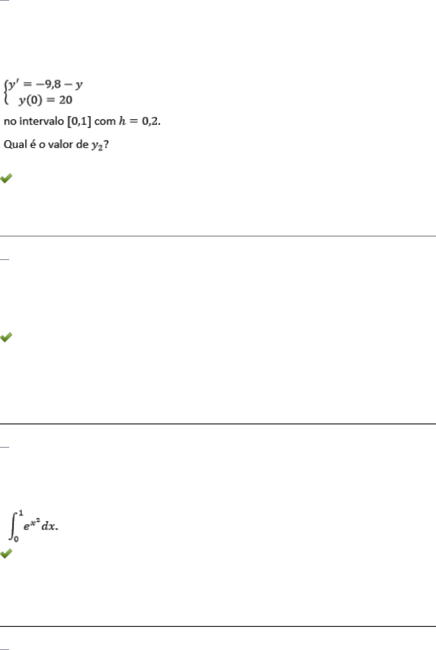 1. Usando a segunda lei do movimento de Newton, podemos determinar a velocidade de uma partícula de massa m (m é constante) que foi projetada verticalmente através da equação diferencial y' = - g - ky, onde y = y(t) é a velocidade da partícula que depende do tempo t, g é a gravidade (constante) e k é uma constante que depende da resistência do ar, vamos assumir que k = 1. Usando o Método de Euler Modificado, podemos encontrar a solução numérica do PVI: a) 20. b) 10,237. c) 2,406. d) - 9,8. 2. Estamos acostumados a trabalhar no Cálculo Numérico com variáveis que podem assumir valores reais. Porém, em algumas aplicações na engenharia, principalmente na teoria das ondas eletromagnéticas, é necessária a aplicação de valores imaginários (complexos), daí a necessidade da implementação dos Sistemas Lineares Complexos. Neste sentido, sobre os Sistemas Lineares Complexos, assinale a alternativa CORRETA: a) Podem ser reduzidos a sistemas lineares reais, com o dobro de equações e incógnitas. b) Se o número complexo z for uma solução, seu conjugado também será. c) Apenas possuem como soluções números reais. d) Exigem métodos próprios de resolução. 3. A integração numérica é um método alternativo de integração que consiste em substituir uma função complicada f(x) por outra mais simples e fácil de se integrar. São muitos os métodos que podem ser usados para fazer a integração numérica. Usando a Regra do Trapézio generalizada, calcule a integral a seguir com m = 5. Lembre-se de usar o arredondamento de duas casas decimais: a) 1,48. b) 2,72. c) 1,86. d) 1,00. 4. As equações do segundo grau, ao serem resolvidas, podem apresentar duas raízes reais e distintas, duas raízes reais e iguais ou, ainda, não apresentar raízes reais. Determine o valor de m para que a equação x(x-4) + (m+1) = 0 apresente duas raízes reais e iguais. https://portaldoalunoead.uniasselvi.com.br/ava/notas/request_gabarito_n2.php?action1=RUNFMDEyMg==&action2=TUFUMjg=&action3=NjU2MzE5&action4=MjAyMC8y&prova=MjMxNDIwMTE=#questao_1%20aria-label= https://portaldoalunoead.uniasselvi.com.br/ava/notas/request_gabarito_n2.php?action1=RUNFMDEyMg==&action2=TUFUMjg=&action3=NjU2MzE5&action4=MjAyMC8y&prova=MjMxNDIwMTE=#questao_2%20aria-label= https://portaldoalunoead.uniasselvi.com.br/ava/notas/request_gabarito_n2.php?action1=RUNFMDEyMg==&action2=TUFUMjg=&action3=NjU2MzE5&action4=MjAyMC8y&prova=MjMxNDIwMTE=#questao_3%20aria-label= https://portaldoalunoead.uniasselvi.com.br/ava/notas/request_gabarito_n2.php?action1=RUNFMDEyMg==&action2=TUFUMjg=&action3=NjU2MzE5&action4=MjAyMC8y&prova=MjMxNDIwMTE=#questao_4%20aria-label= a) O valor de m é 5. b) O valor de m é 6. c) O valor de m é 4. d) O valor de m é 3. 5. Quando se torna inviável resolver uma equação diferencial ordinária, lançamos mão dos métodos numéricos para encontrar uma aproximação f a esta solução y. O método de Euler é um destes métodos numéricos. Neste contexto, considere a EDO dada por y' = y - x definida no intervalo [0, 1] tal que y(0) = 2. Tomando h = 0,2, a equação de iteração é: a) Somente a opção III está correta. b) Somente a opção IV está correta. c) Somente a opção I está correta. d) Somente a opção II está correta. Anexos: CN - Metodo de Euler2 6. Os métodos de Jacobi e Gauss-Seidel são métodos que encontram uma solução aproximada da solução de um sistema linear. Quando não se tem mais um sistema linear, e sim um sistema não linear, devemos fazer uso de outros métodos para encontrar uma solução aproximada para o sistema, sendo dois deles o método da interação linear e o método de Newton. O método da interação linear, em geral, é mais fácil de ser implementado, porém requer mais condições do sistema que o método de Newton. com base no exposto, assinale a alternativa CORRETA que apresenta a solução (com um arredondamento de 3 casas decimais) do sistema não linear depois de duas iterações (k = 2) e o ponto inicial (0,5; 0,1) usando o método da iteração linear: a) x = 0,505 e y = 0,125. b) x = 0,492 e y = 0,123. c) x = 0,495 e y = 0,125. d) x = 0,5 e y = 0,1. https://portaldoalunoead.uniasselvi.com.br/ava/notas/request_gabarito_n2.php?action1=RUNFMDEyMg==&action2=TUFUMjg=&action3=NjU2MzE5&action4=MjAyMC8y&prova=MjMxNDIwMTE=#questao_5%20aria-label= https://portaldoalunoead.uniasselvi.com.br/extranet/layout/request/imag_prova_ead_anexo_n2.php?action1=MjMxNDIwMTE=&action2=NTYzMTE4 https://portaldoalunoead.uniasselvi.com.br/ava/notas/request_gabarito_n2.php?action1=RUNFMDEyMg==&action2=TUFUMjg=&action3=NjU2MzE5&action4=MjAyMC8y&prova=MjMxNDIwMTE=#questao_6%20aria-label= 7. As expressões algébricas que se formam a partir da união de duas ou mais variáveis e constantes, relacionadas através de operações de multiplicação, subtração ou adição, recebem o nome de polinômios. Dado o polinômio P (x) = 0,6x² + 0,9x - 3, determine o seu valor para x igual a 0,5. a) O valor do polinômio é -2,4. b) O valor do polinômio é 3,6. c) O valor do polinômio é 1,65. d) O valor do polinômio é -1,5. 8. Em matemática, nos processos de otimização, os multiplicadores de Lagrange permitem encontrar máximos e mínimos de uma função de uma ou mais variáveis que podem ter uma ou mais restrições. De acordo com os dados no quadro a seguir, assinale a alternativa CORRETA que apresenta o polinômio interpolador obtido via método de Lagrange para a função: a) 0,6125x² + 0,9845x + 1 b) 0,9845x² + x + 0,6125 c) x² + 0,9845x + 0,6125 d) 0,9845x² + 0,6125x + 1 Anexos: CN - Interpolacao de Lagrange2 9. Para que uma equação do segundo grau apresente como raízes apenas números complexos, o discriminante deve ser negativo. Dada a equação x² - 6x + 3t = 0, determine o valor de t para que a equação tenha como raízes apenas números complexos: a) t < -3. b) t > 3. c) t > -3. d) t < 3. 10. Uma função f(x) é contínua num intervalo fechado [-1, 4
