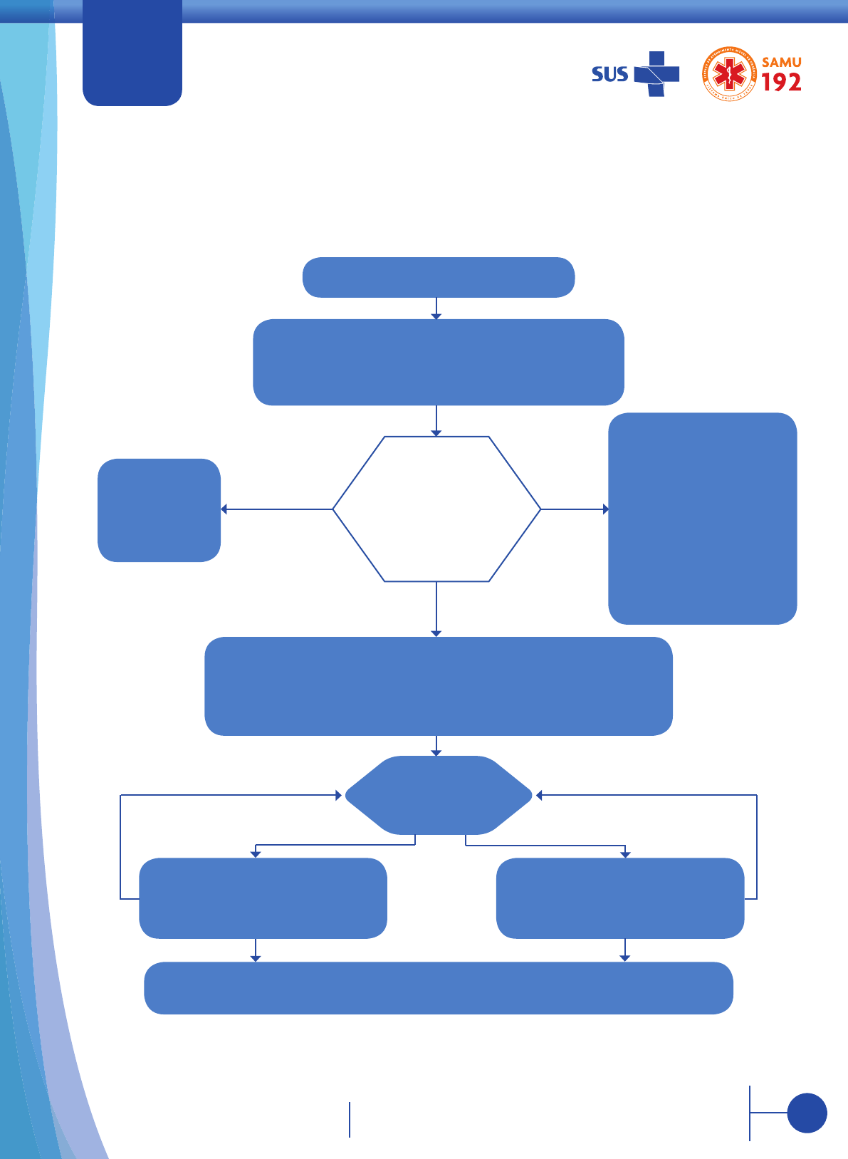 Protocolo Samu 192 Emergências Clínicas SUPORTE BÁSICO DE VIDA Este protocolo foi pautado nas mais recentes evidências científi cas disponíveis. Adaptações são permitidas de acordo com as particularidades dos serviços. Elaboração: Agosto/2014 Revisão: Novembro/2015 1/1 BC9 – Algoritmo geral da RCP no adulto (Guidelines AHA 2015) BC9 Algoritmo geral RCP adulto – SBV BC9 – Algoritmo geral da RCP no adulto (Guidelines AHA 2015) Verifi car a segurança do local Aplicar um choque. Reiniciar imediatamente RCP por 2 minutos (até aviso do DEA para verifi cação do ritmo). Reavaliar ritmo pelo DEA. Reiniciar RCP imediatamente por 2 minutos (até aviso do DEA para verifi cação do ritmo) Monitorar até a chegada do SAV ou proceder conforme orientação do médico regulador. Parada respiratória (BC4) - Administrar insufl ações com dispositivo BVM: uma insufl ação a cada 5 a 6 segundos (10 a 12 insufl ações/min). - Contatar a Regulação Médica, solicitando apoio do SAV (caso ainda não o tenha feito) após 2 minutos. - Manter as insufl ações e verifi car pulso a cada 2 minutos. - Na ausência de pulso, iniciar RCP (ver o quadro “RCP”). Paciente não responde (irresponsivo) Um dos profi ssionais da equipe permanece com o paciente. Outro profi ssional da equipe comunica imediatamente a Regulação Médica, solicitando apoio do SAV, e providencia o DEA e os equipamentos de emergência. RCP (BC5): iniciar com compressões torácicas Iniciar ciclos de 30 compressões de boa qualidade e duas insufl ações efi cientes com aporte de oxigênio. Assim que o DEA estiver disponível, com os eletrodos instalados e ligados, interromper as compressões e analisar o ritmo. Continuar as manobras até que o SAV assuma ou proceder conforme orientação do médico regulador. Se houver retorno da circulação espontânea (paciente se movimentar), seguir o protocolo de cuidados pós-ressuscitação (BC7). Fonte: Adaptado de AHA Guidelines 2015. Part 5. Adult Basic Life Support and Cardiopulmonary Resuscitation Quality. Circulation. 2015;132:S414-S435. Verifi car se não há respiração ou se apresenta somente gasping e verifi car pulso (simultaneamente). É possível sentir defi nitivamente o pulso em 10 segundos? Respiração normal, com pulso Sem respiração ou gasping, com pulso Sem respiração ou apenas gasping, sem pulso Sim, ritmo chocável Não, ritmo não chocável O DEA analisa o ritmo. Ritmo chocável? SAMU_basico_BC.indd 3 30/06/2016 16:00:33