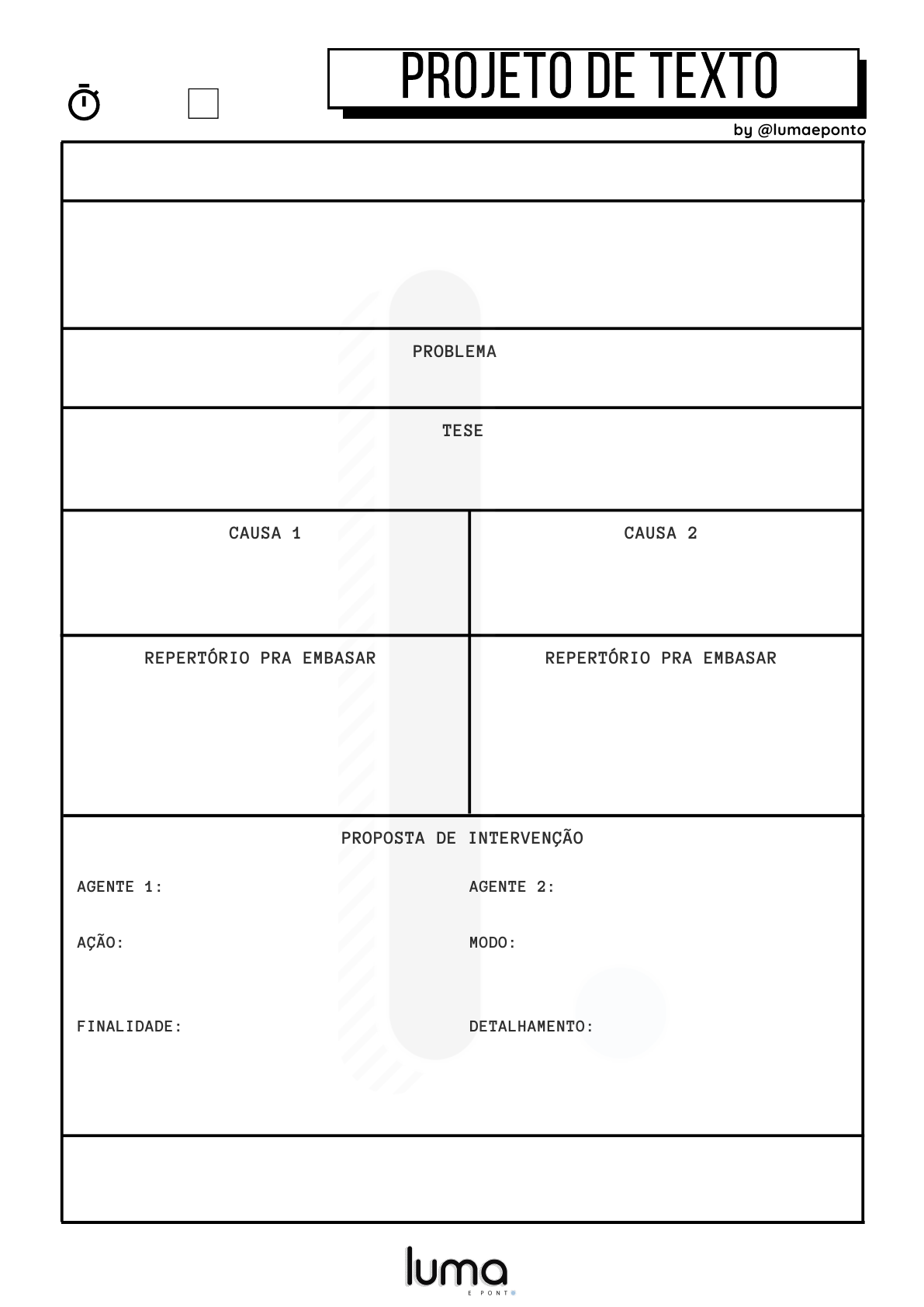ESTRATÉGIA DE ABERTURA PROBLEMA CAUSA 1 REPERTÓRIO PRA EMBASAR PROPOSTA DE INTERVENÇÃO AGENTE 1: AÇÃO: FINALIDADE: FECHAMENTO CAUSA 2 REPERTÓRIO PRA EMBASAR TESE AGENTE 2: MODO: DETALHAMENTO: TEMA: nome: ______________ : _____ simulado PROJETO DE TEXTO by @lumaeponto