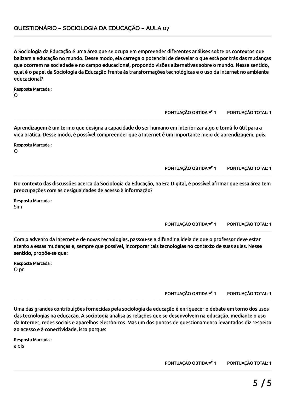 05/08/2020 Course Status – Centro Universitário Faveni https://ava.unifaveni.com.br/course-status/ 1/2 5 / 5 QUESTIONÁRIO – SOCIOLOGIA DA EDUCAÇÃO – AULA 07 PONTUAÇÃO TOTAL: 1PONTUAÇÃO OBTIDA 1 A Sociologia da Educação é uma área que se ocupa em empreender diferentes análises sobre os contextos que balizam a educação no mundo. Desse modo, ela carrega o potencial de desvelar o que está por trás das mudanças que ocorrem na sociedade e no campo educacional, propondo visões alternativas sobre o mundo. Nesse sentido, qual é o papel da Sociologia da Educação frente às transformações tecnológicas e o uso da Internet no ambiente educacional? Resposta Marcada : Oferecer uma visão mais re�exiva e crítica acerca da presença das novas tecnologias e da Internet no âmbito educacional. PONTUAÇÃO TOTAL: 1PONTUAÇÃO OBTIDA 1 Aprendizagem é um termo que designa a capacidade do ser humano em interiorizar algo e torná-lo útil para a vida prática. Desse modo, é possível compreender que a Internet é um importante meio de aprendizagem, pois: Resposta Marcada : O aluno pode pesquisar informações e conhecimentos, além daqueles apreendidos em sala de aula, contribuindo, assim, para a sua formação intelectual. PONTUAÇÃO TOTAL: 1PONTUAÇÃO OBTIDA 1 No contexto das discussões acerca da Sociologia da Educação, na Era Digital, é possível a�rmar que essa área tem preocupações com as desigualdades de acesso à informação? Resposta Marcada : Sim, pois a questão da desigualdade no acesso não permite que os indivíduos tenham acesso a diferentes aspectos da cultura de outros povos. PONTUAÇÃO TOTAL: 1PONTUAÇÃO OBTIDA 1 Com o advento da Internet e de novas tecnologias, passou-se a difundir a ideia de que o professor deve estar atento a essas mudanças e, sempre que possível, incorporar tais tecnologias no contexto de suas aulas. Nesse sentido, propõe-se que: Resposta Marcada : O professor elabore, no contexto de suas aulas, situações que estimulem os alunos a realizarem pesquisas, vídeos, blogs, textos para a Internet, de modo que isso �que acessível a todos e passível de ser compartilhado na rede. PONTUAÇÃO TOTAL: 1PONTUAÇÃO OBTIDA 1 Uma das grandes contribuições fornecidas pela sociologia da educação é enriquecer o debate em torno dos usos das tecnologias na educação. A sociologia analisa as relações que se desenvolvem na educação, mediante o uso da Internet, redes sociais e aparelhos eletrônicos. Mas um dos pontos de questionamento levantados diz respeito ao acesso e à conectividade, isto porque: Resposta Marcada : a distribuição do acesso e a conectividade não são iguais para todos, pois eles podem ser limitados e os sujeitos podem não ter aptidão para fazer uso das redes em benefício próprio. Total 05/08/2020 Course Status – Centro Universitário Faveni https://ava.unifaveni.com.br/course-status/ 2/2
