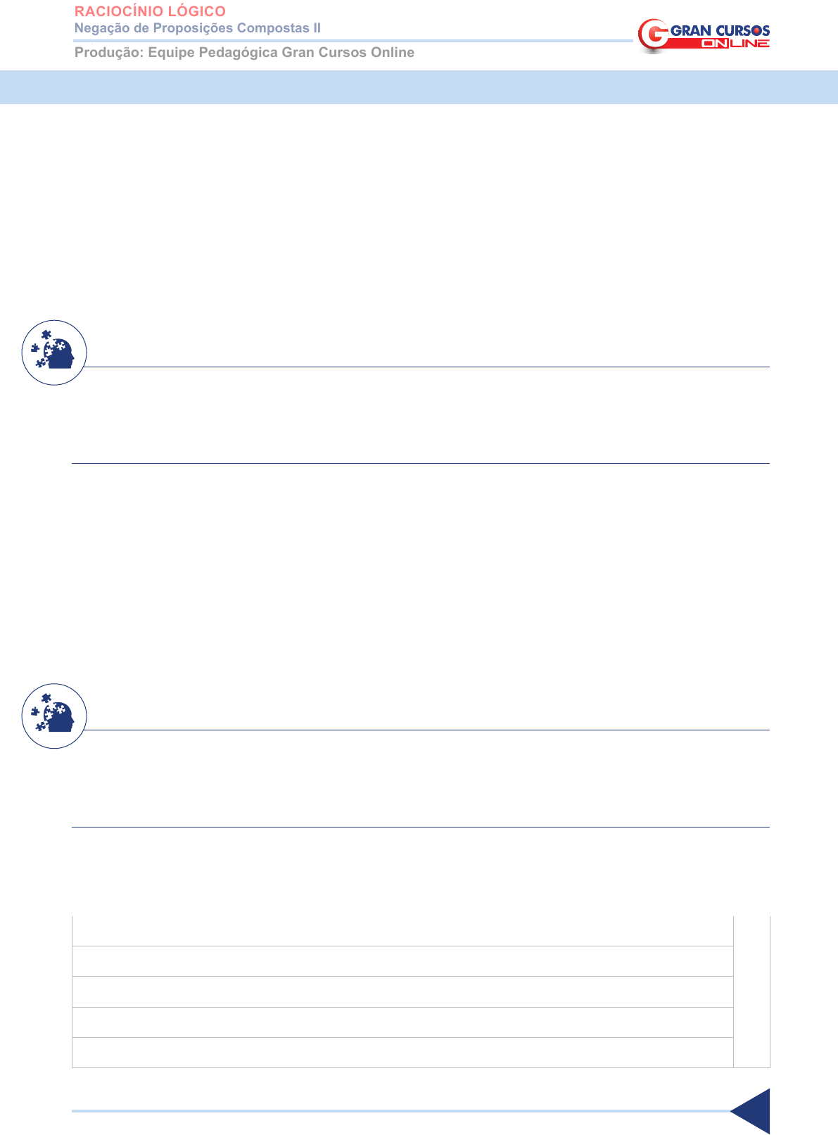 1 Negação de Proposições Compostas II RACIOCÍNIO LÓGICO www.grancursosonline.com.br AN O TAÇ Õ ES Produção: Equipe Pedagógica Gran Cursos Online NEGAÇÃO DE PROPOSIÇÕES COMPOSTAS II 1. (ANPAD) A negação da proposição “A seleção brasileira classificou-se para a copa do mundo, mas não jogou bem” é: a. A seleção brasileira não se classificou para a copa do mundo e não jogou bem. b. A seleção brasileira classificou-se para a copa do mundo ou não jogou bem. c. A seleção brasileira não se classificou para a copa do mundo, mas jogou bem. d. A seleção brasileira não se classificou para a copa do mundo ou jogou bem. e. A seleção brasileira classificou-se para a copa do mundo e não jogou bem. Resolução • ‘mas’ dá ideia de ‘e’. • A negação da frase é “A seleção brasileira não se classificou para a copa do mundo ou jogou bem”. 2. (MINISTÉRIO DA AGRICULTURA) A negação da afirmativa “Me caso ou compro sorvete” é: a. Me caso e não compro sorvete. b. Não me caso ou não compro sorvete. c. Não me caso e não compro sorvete. d. Não me caso ou compro sorvete. e. Se me casar, então não compro sorvete. Resolução • Negação de ‘me caso’ é ‘não me caso’. • ‘ou’ vira ‘e’. • Negação de ‘compro sorvete’ é ‘não compro sorvete’. 3. (ESAF) A negação da afirmação condicional “se Ana viajar, Paulo vai viajar” é: 2 Negação de Proposições Compostas II RACIOCÍNIO LÓGICO www.grancursosonline.com.br AN O TA Ç Õ ES Produção: Equipe Pedagógica Gran Cursos Online a. Ana não está viajando e Paulo vai viajar. b. se Ana não viajar, Paulo vai viajar. c. Ana está viajando e Paulo não vai viajar. d. Ana não está viajando e Paulo não vai viajar. e. se Ana estiver viajando, Paulo não vai viajar. Resolução Negação da condicional: mantém o primeiro e nega o segundo (mantém o antecedente e nega o consequente). Assim, a negação da frase é: Ana está viajando e Paulo não vai viajar. 4. A negação de “O gato mia e o rato chia” é: a. O gato não mia e o rato não chia. b. O gato mia ou o rato chia. c. O gato não mia ou o rato não chia. d. O gato e o rato não miam nem chiam. e. O gato chia e o rato mia. Resolução • ‘e’ vira ‘ou’. • Negação de ‘gato mia’ é ‘gato não mia’. E a negação de ‘rato chia’ é ‘rato não chia’. 5. A negação de “Hoje é segunda feira e amanhã não choverá” é: a. Hoje não e segunda feira e amanhã choverá. b. Hoje não é segunda feira ou amanhã choverá. c. Hoje não é segunda feira, então amanhã choverá. d. Hoje não é segunda feira nem amanhã choverá. e. Hoje é segunda feira ou amanhã não choverá. 3 Negação de Proposições Compostas II RACIOCÍNIO LÓGICO www.grancursosonline.com.br AN O TAÇ Õ ES Produção: Equipe Pedagógica Gran Cursos Online Resolução • ‘e’ vira ‘ou’. • Negação de ‘Hoje é segunda feira’ é ‘Hoje não é segunda feira’. E a nega- ção de ‘amanhã não choverá’ é ‘amanhã choverá’. 6. (ESAF/AFC) Ao resolver um problema de matemática, Ana chegou à con- clusão de que: x = a e x = p, ou x = e. Contudo, sentindo-se insegura para concluir em definitivo a resposta do problema, Ana telefona para Beatriz, que lhe dá a seguinte informação: x ≠ e. Assim, Ana corretamente conclui que: a. x ≠ a ou x ≠ e b. x = a e x = p c. x = a ou x = p d. x = a e x ≠ p e. x ≠ a e x ≠ p Resolução • Sentença apresentada na questão: (x = a ∧ x = p) v (x = e). • ‘x ≠ e’ é uma verdade. Assim, ‘x = e’ é falso. Logo, (x = a ∧ x = p) v (x = e) será verdade por causa do ‘ou’, assim como (x = a ∧ x = p) também é verdade. 7. (ESAF/APO) Dois colegas estão tentando resolver um problema de mate- mática. Pedro afirma para Paulo que X = B e Y = D. Como Paulo sabe que Pedro sempre mente, então, do ponto de vista lógico, Paulo pode afirmar corretamente que: a. X ≠ B e Y ≠ D b. X = B ou Y ≠ D c. X ≠ B ou Y ≠ D d. se X ≠ B, então Y ≠ D e. se X ≠ B, então Y = D 4 Negação de Proposições Compostas II RACIOCÍNIO LÓGICO www.grancursosonline.com.br AN O TA Ç Õ ES Produção: Equipe Pedagógica Gran Cursos Online Resolução • Sentença apresentada na questão: X = B ∧ Y = D. • Por se tratar de uma pessoa mentirosa, a sentença deve ser negada pois será uma verdade. Logo, X ≠ B v Y ≠ D. 8. (ESAF/AFC) As seguintes afirmações, todas elas verdadeiras, foram feitas sobre a ordem dos valores assumidos pelas variáveis X, Y, Z, W e Q: i) X < Y e X > Z; ii) X < W e W < Y se e somente se Y > Z; iii) Q ≠ W se e somente se Y = X. Logo: a. Y > W e Y = X b. Q < Y e Q > Z c. X = Q d. W < Y e W = Z e. Y = Q e Y > W Resolução • Sentenças apresentadas na questão: I – X < Y ∧ X > Z II – X < W ∧ W < Y ↔ Y > Z III – Q ≠ W ↔ Y = X • Para X < Y ∧ X > Z ser verdade, é necessário que seus dois termos sejam verdadeiros. Assim, se X < Y for verdade, Y = X é falso. Portanto, para uma sentença de ‘se e somente’ ser verdade (caso da proposição III), os dois termos devem ser ou verdadeiros ou falsos. I – 4X < Y ∧ X > Z Verdade II – (X < W ∧ W < Y) ↔ Y > Z Verdade III – Q ≠ W ↔ Y = X Verdade • Levando em consideração os valores numéricos: V V V F F V 5 Negação de Proposições Compostas II RACIOCÍNIO LÓGICO www.grancursosonline.com.br AN O TAÇ Õ ES Produção: Equipe Pedagógica Gran Cursos Online 9. (CESPE/POLÍCIA CIVIL-CE/2012) O exercício da atividade policial exige pre- paro técnico adequado ao enfrentamento de situações de conflito e, ainda, conhecimento das leis vigentes, incluindo interpretação e forma de aplicação dessas leis nos casos concretos. Sabendo disso, considere como verdadei- ras as proposições seguintes. P1: Se se deixa dominar pela emoção ao tomar decisões, então o policial toma decisões ruins. P2: Se não tem informações p