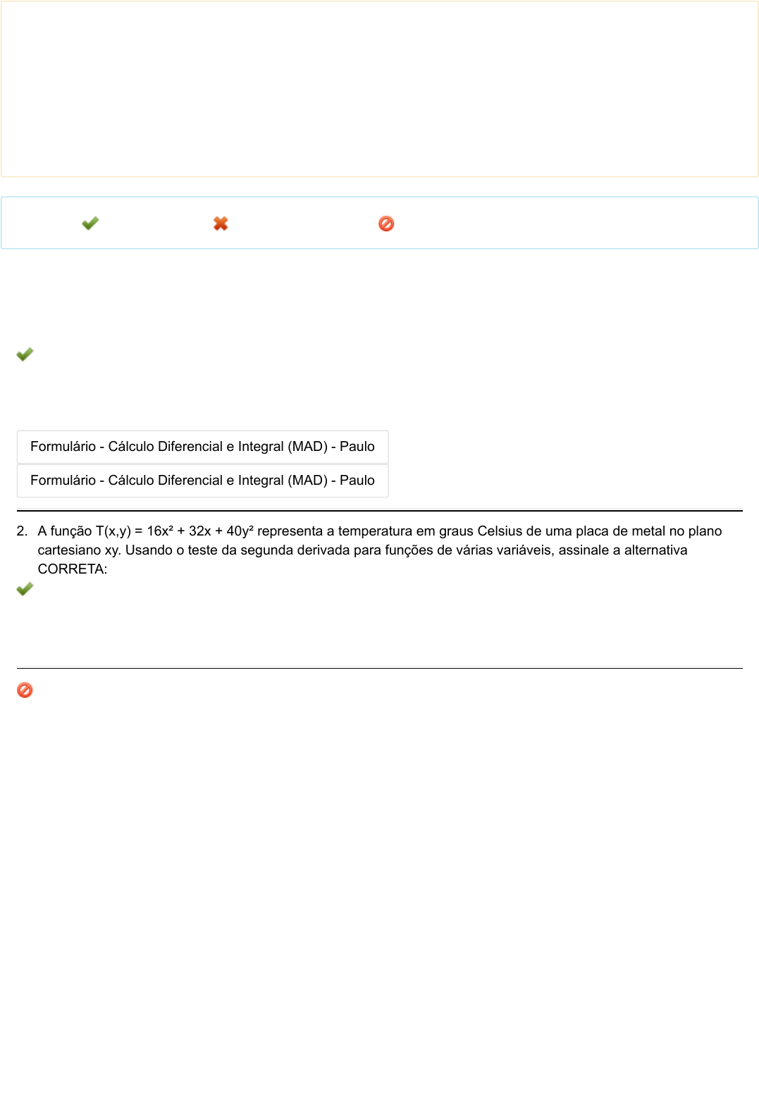 Acadêmico: Ismael Melo da Gama (1849081) Disciplina: Cálculo Diferencial e Integral II (MAD103) Avaliação: Avaliação II - Individual Semipresencial ( Cod.:638080) ( peso.:1,50) Prova: 15778070 Nota da Prova: 9,00 Legenda: Resposta Certa Sua Resposta Errada Questão Cancelada 1. No cálculo, a integral de uma função foi criada originalmente para determinar a área sob uma curva no plano cartesiano e também surge naturalmente em dezenas de problemas de Física. Calcule a área limitada por y = 2x, o eixo x e as retas x = 1 e x = 4 através da integração. a) Área = 16. b) Área = 15. c) Área = 10. d) Área = 12. Anexos: Formulário - Cálculo Diferencial e Integral (MAD) - Paulo Formulário - Cálculo Diferencial e Integral (MAD) - Paulo 2. A função T(x,y) = 16x² + 32x + 40y² representa a temperatura em graus Celsius de uma placa de metal no plano cartesiano xy. Usando o teste da segunda derivada para funções de várias variáveis, assinale a alternativa CORRETA: a) A função temperatura T tem um ponto de mínimo. b) A função temperatura T tem um ponto sela. c) A função temperatura T tem um ponto de mínimo e um ponto de máximo. d) A função temperatura T tem um ponto de máximo. No cálculo integral, podemos delimitar e calcular áreas que anteriormente seriam inacessíveis para a Geometria Clássica. Muitas vezes, podemos modelar funções em que suas intersecções definam uma área desejada. Baseado nisto, a partir da área do 2º quadrante limitada pelas parábolas y = x² e x = y² - 18, analise os gráficos a seguir e assinale a alternativa CORRETA: https://portaldoalunoead.uniasselvi.com.br/extranet/layout/request/imag_prova_ead_anexo_n2.php?action1=MTU3NzgwNzA=&action2=Mzk3MTI4 https://portaldoalunoead.uniasselvi.com.br/extranet/layout/request/imag_prova_ead_anexo_n2.php?action1=MTU3NzgwNzA=&action2=Mzk3MTI4 a) Apenas a figura 2 representa corretamente a área solicitada. b) Ambas figuras representam a mesma indicação de área. c) Não há intersecção entre as curvas indicadas, logo não há figura correta. d) Apenas a figura 1 representa corretamente a área solicitada. * Observação: A questão número 3 foi Cancelada. 4. No cálculo, a integral de uma função foi criada originalmente para determinar a área sob uma curva no plano cartesiano e também surge naturalmente em dezenas de problemas de Física. Resolva a questão a seguir e assinale a alternativa CORRETA: a) Somente a opção II está correta. b) Somente a opção I está correta. c) Somente a opção III está correta. d) Somente a opção IV está correta. Anexos: Formulário - Cálculo Diferencial e Integral (MAD) - Paulo Formulário - Cálculo Diferencial e Integral (MAD) - Paulo Formulário - Cálculo Diferencial e Integral (MAD) - Paulo https://portaldoalunoead.uniasselvi.com.br/extranet/layout/request/imag_prova_ead_anexo_n2.php?action1=MTU3NzgwNzA=&action2=Mzk3MTI4 https://portaldoalunoead.uniasselvi.com.br/extranet/layout/request/imag_prova_ead_anexo_n2.php?action1=MTU3NzgwNzA=&action2=Mzk3MTI4 https://portaldoalunoead.uniasselvi.com.br/extranet/layout/request/imag_prova_ead_anexo_n2.php?action1=MTU3NzgwNzA=&action2=Mzk3MTI4 5. A construção da Usina Hidrelétrica de Itaipu no rio Paraná, na fronteira entre o Brasil e o Paraguai, iniciou-se na década de 1970, mais precisamente em Janeiro de 1975. Nesta época, não existiam ferramentas computacionais para representar os desenhos referentes à planta de construção da usina e nem para realizar cálculos com tamanha exatidão e rapidez. Na época, a importância dos matemáticos era grande e foi necessária a atuação de um deles para a determinação do comprimento correto da barragem da usina. Sabe-se geometricamente, através do desenho da planta da usina, constatou que a função matemática que mais se aproximava da curva representativa da barragem da Usina era f(x) = ln (cos x) em que f(x) é dado em km. Com base nessas informações, qual das alternativas representa o valor provável do comprimento da barragem da usina, sabendo-se que o valor de x da função f(x) varia de pi/6 a pi/4? a) 0,8813 km. b) 0,5493 km. c) 0,6640 km. d) 0,3320 km. 6. No cálculo, a integral de uma função foi criada originalmente para determinar a área sob uma curva no plano cartesiano e também surge naturalmente em dezenas de problemas de Física. Calculando a área entre as curvas y = 4 - x² e y = x + 2, obteremos: a) Área igual a 11/2 u.a. b) Área igual a 9/2 u.a. c) Área igual a 14/3 u.a. d) Área igual a 8 u.a. Anexos: Formulário - Equações Diferenciais (Saulo) 7. O cálculo de área de figuras irregulares também pode ser analisado pelo conceito de integral. Deste modo, leia a questão a seguir e assinale a alternativa CORRETA: a) A opção III está correta. b) A opção IV está correta. c) A opção I está correta. d) A opção II está correta. Anexos: Formulário - Equações Diferenciais (Saulo) Formulário - Equações Diferenciais (Saulo) https://portaldoalunoead.uniasselvi.com.br/extranet/layout/request/imag_prova_ead_anexo_n2.php?action1=MTU3NzgwNzA=&action2=Mzk3MTI3 https://portaldoalunoead.uniasselvi.com.br/extranet/layout/request/imag_prova_ead_anexo_n2.php?action1=MTU3NzgwNzA=&action2=Mzk3MTI3 https://portaldoalunoead.uniasselvi.com.br/extranet/layout/request/imag_prova_ead_anexo_n2.php?action1=MTU3NzgwNzA=&action2=Mzk3MTI3 8. . a) A reserva de gás durará mais de 2000 anos. b) O gás nestas situações não terá fim. c) Com 100 anos de utilização, a reserva de gás se extinguirá. d) Daqui a 80 anos, ainda restarão mais de 750 bilhões de metros cúbicos de gás. Uma das aplicações do conceito de integração é o cálculo da área entre curvas. Este procedimento permite que sejam calculadas áreas que antes, com a utilização da geometria clássica eram inacessíveis. Sendo assim, determine a área entre as curvas y = x² e y = 4x: I- A área entre as curvas é 16/3. II- A área entre as curvas é 8/3.