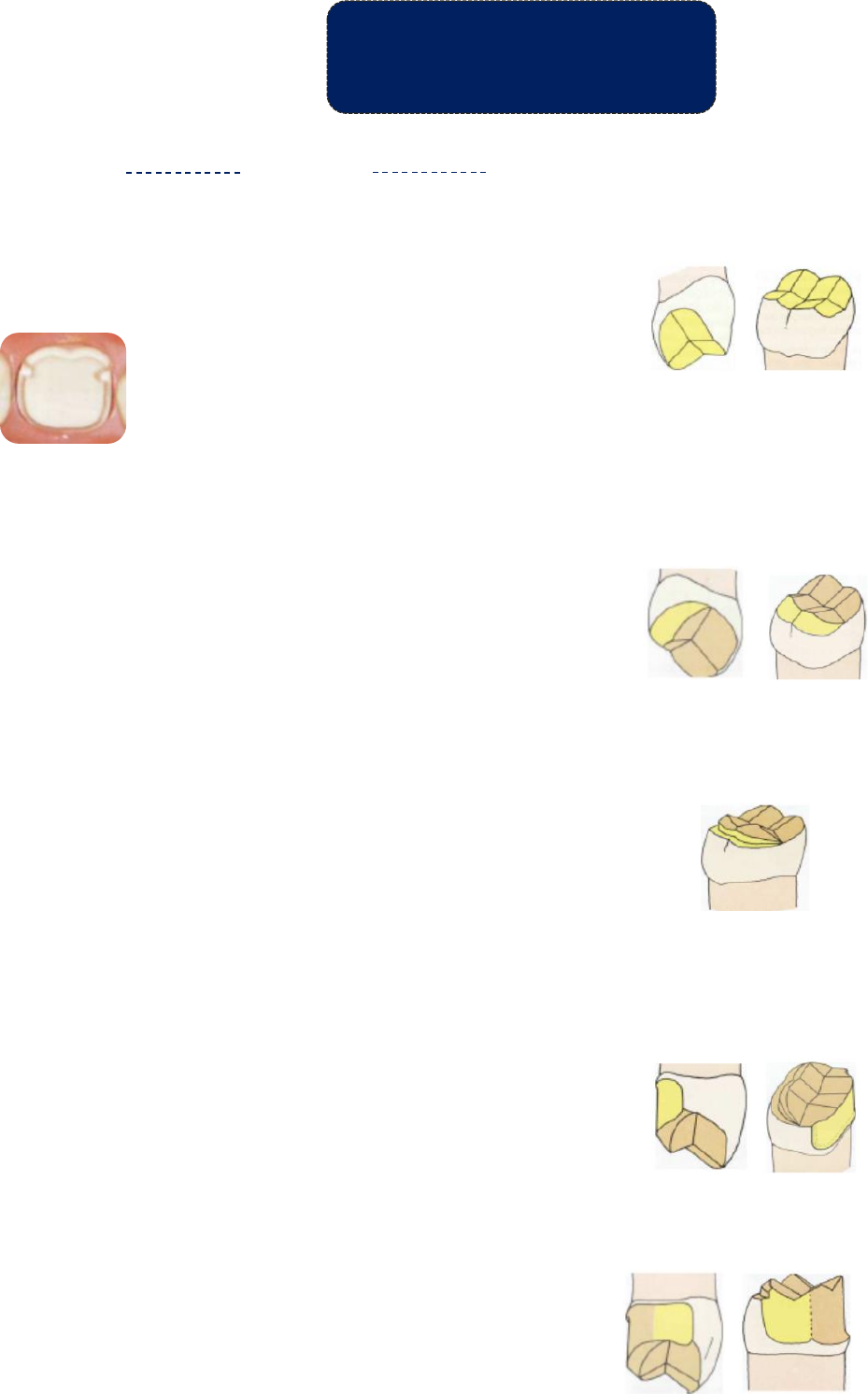 Bruna de Alencar Peres – Odontologia Unesp São José dos Campos (T64) Coroa 4/5 CARACTERÍSTICAS • Preparo mais conservador: preserva es- trutura dental. • Esse tipo de preparo permite precisão de justeza. • Margens supra-sulculares. • Reprodução do contorno original. • Bom escoamento dos cimentos. • Cimentação duradoura. • Ligas utilizadas: áuricas, prata-estanho e paládio-prata; • Menor retenção e resistência, quando comparada à coroa total; porém, apre- senta maior resistência e retenção que os outros tipos de restauração com cober- tura parcial. INDICAÇÕES • Face vestibular íntegra; • Pequenas lesões de cárie; • Altura média ou longa; • Pacientes com boa higiene oral. USOS • Coroa unitária; • Retentor de ponte fixa com pequeno espaço protético; • Dentes corretamente posicionados: modificação do eixo de inserção; • Pôntico de um elemento. CONTRAINDICAÇÕES • Estética: vai depender da habilidade do profissional. • Dentes curtos ou com pouca estrutura para criar uma retenção adequada. TÉCNICA OPERATÓRIA Redução oclusal (PD 2215, 2136 e 1064) Fazer sulcos de orientação; • 0,5-1,0 mm da cúspide de suporte: - Superiores: cúspide vestibular. - Inferiores: cúspide lingual. • 1,0-1,5 mm da cúspide funcional: - Superiores: cúspide lingual. - Inferiores: cúspide vestibular. Bisel da cúspide funcional (PD 2215, 2136 e 1064) Realizar sulcos de orientação de cerca de 1,5mm: • Superiores: cúspide lingual. • Inferiores: cúspide vestibular. Degrau oclusal (PD 2215, 2136 e 1064) Exclusivo de dentes inferiores. Apresenta função de conferir maior resistência. Redução axial lingual Tomar cuidado para não inclinar muito a parede lingual. Apresenta linha de terminação em chanfro. Redução axial proximal Tomar cuidado para não invadir a face vestibular. Coroas parciais tipo 4/5 e 7/8 Prótese Parcial Fixa Bruna de Alencar Peres – Odontologia Unesp São José dos Campos (T64) Sulcos proximais (PD 3195) Deve formar um degrau definido. Biselado proximal Conferir integridade marginal à restauração. Biselado vestibular Preparado do sulco para fora (evitar super exten- são). Deve ser estendido apenas o suficiente. Biselado oclusal Característico de preparo em dentes superiores. CARACTERÍSTICAS FINAIS DO PREPARO Coroa 7/8 Realizado em molares e pré-molares, principal- mente superiores. CARACTERÍSTICAS • Variação especial da coroa 4/5. • Apresenta melhor retenção e resistência que o preparo para coroa 4/5. INDICAÇÕES • Dentes com cúspide mésio-vestibular intacta. • Dentes com restaurações, cáries, descal- cificações ou fratura da cúspide disto- vestibular. CONTRAINDICAÇÕES • Quando há lesões na cúspide mésio- vestibular. VANTAGENS • Preservação de estrutura dental; • Estética; • Melhor controle de higienização; • Maior retenção e resistência (quando comparada às coroas 4/5). DESVANTAGENS • Complexidade de execução. TÉCNICA OPERATÓRIA Redução oclusal (PD 2215, 2136 e 1064) Redução de 1,5mm das cúspides funcionais e 1,0mm das cúspides-guia. Bruna de Alencar Peres – Odontologia Unesp São José dos Campos (T64) Bisel da cúspide funcional Bisel de 1,5mm no terço oclusal, se estendendo até as faces proximais. Reduções axiais vestibular e lingual Essas reduções devem ser paralelas ao eixo de inserção, e por vestibular até o sulco vestibular. Redução axial proximal Deve ser estendida ao máximo para as proximais na lingual. Sulcos proximais Devem se estender 0,5 mm aquém do término, direcionado para o centro do dente e paralelos entre si. Canaleta oclusal Une os sulcos proximais entre si. Deve ter 0,5 mm de largura. CARACTERÍSTICAS FINAIS Referências Shillinburg: Fundamentos dos Preparos Dentá- rios para Restaurações Metálicas e de Porcelana, Edição do Estudante, Capítulos 5, 6 e 9. Legenda: acabamento axial. Legenda: biselado do sulco proximal. Legenda: bisel de acabamento oclusal.