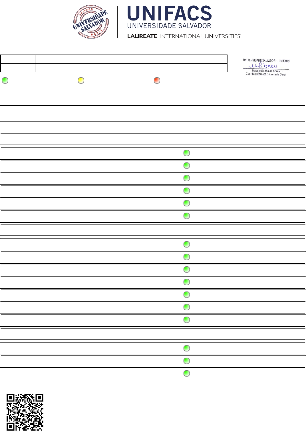 Aluno Curso Código Disciplina C.H. CR Situação Pré-Requisito Sistemas de Informação Disciplinas Disciplinas em Disciplinas a cursar (312122024)JEFFERSON HENRIQUE SOARES DOS SANTOS BISPO MATRIZ CURRICULAR Disciplinas Dependentes* *Entende-se por disciplina dependente, aquela que só poderá ser confirmada na sua matrícula mediante aprovação na disciplina indicada nesta linha. Currículo: Sistemas de Informação(Base) 20082FS Período: 1 ESI001 60 4 Algoritmos e Lógica de Programação ESI002 60 4 Teoria Geral dos Sistemas ESI003 60 4 Fundamentos de Matemática para Computação ESI004 60 4 Introdução à Computação ESI005 45 3 Atividades Complementares SFG14 45 3 Comunicação Período: 2 ESI006 60 4 Programação de Computadores ESI012, ESI013 ESI007 60 4 Fundamentos de Matemática Discreta ESI008 60 4 Arquitetura de Computadores ESI009 60 4 Cálculo Diferencial ESI011 ESI010 45 3 Atividades Complementares SFB001 60 4 Sistemas de Computação SFG02 45 3 Introdução ao Trabalho Científico Período: 3 ESI011 ESI00960 4 Cálculo Integral ESI019 ESI012 ESI00660 4 Estrutura de Dados ESI016 ESI013 ESI00660 4 Linguagens e Técnicas de Programação I ESI017 Terça-feira 22 Setembro 2020 Página 1 de 4 null - null Para certificar que esse documento é válido basta ler o qrcode ou acessar o link https://unifacs.proatecnologia.com.br informando o código acima do documento. Documento Autenticado Aluno Curso Código Disciplina C.H. CR Situação Pré-Requisito Sistemas de Informação Disciplinas Disciplinas em Disciplinas a cursar (312122024)JEFFERSON HENRIQUE SOARES DOS SANTOS BISPO MATRIZ CURRICULAR Disciplinas Dependentes* *Entende-se por disciplina dependente, aquela que só poderá ser confirmada na sua matrícula mediante aprovação na disciplina indicada nesta linha. ESI014 60 4 Sistemas de Informação ESI015 45 3 Atividades Complementares SFB003 60 4 Probabilidade e Estatística SFG05 45 3 Conjuntura Econômica Período: 4 ECC040 90 2 Estágio I ESI016 ESI01260 4 Organização de Arquivos e Métodos de Ordenação ESI017 ESI01360 4 Linguagens e Técnicas de Programação II ESI021, ESI032 ESI018 60 4 Sistemas Operacionais ESI033 ESI019 ESI01160 4 Matemática Aplicada ESI020 45 3 Atividades Complementares SFG08 45 3 Meio Ambiente e Sustentabilidade SFG11 45 3 Psicologia e Comportamento Período: 5 ESI021 ESI01760 4 Linguagens e Técnicas de Programação III ESI022 60 4 Projeto e Implementação de Banco de Dados ESI026, ESI027 ESI023 60 4 Análise de Sistemas de Informação ESI028 ESI024 60 4 Redes de Computadores ESI029 ESI025 45 3 Atividades Complementares SFG04 45 3 Arte e Cultura Terça-feira 22 Setembro 2020 Página 2 de 4 null - null Para certificar que esse documento é válido basta ler o qrcode ou acessar o link https://unifacs.proatecnologia.com.br informando o código acima do documento. Documento Autenticado Aluno Curso Código Disciplina C.H. CR Situação Pré-Requisito Sistemas de Informação Disciplinas Disciplinas em Disciplinas a cursar (312122024)JEFFERSON HENRIQUE SOARES DOS SANTOS BISPO MATRIZ CURRICULAR Disciplinas Dependentes* *Entende-se por disciplina dependente, aquela que só poderá ser confirmada na sua matrícula mediante aprovação na disciplina indicada nesta linha. SFG06 45 3 Filosofia Período: 6 ECC039 90 2 Estágio II ESI026 ESI02260 4 Desenvolvimento de Aplicações para Web ESI027 ESI02260 4 Gerência e Tecnologia de Banco de Dados ESI028 ESI02360 4 Modelagem de Sistemas de Informação ESI029 ESI02460 4 Aplicações de Redes de Computadores ESI030 45 3 Atividades Complementares ESI033 ESI01860 4 Sistemas Distribuídos 45 3Optativa SFG12 45 3 Saúde e Qualidade de Vida Período: 7 ESI031 60 4 Gerência de Projetos, Auditoria e Segurança de SI ESI032 ESI01760 4 Linguagens Formais e Compiladores ESI034 60 4 Trabalho de Conclusão de Curso - TCC SFB005 60 4 Engenharia de Software SFG09 45 3 Empreendedorismo Período: 8 ESI036 60 4 Sistemas de Informação Aplicados ESI037 60 4 Interface Homem-Computador Terça-feira 22 Setembro 2020 Página 3 de 4 null - null Para certificar que esse documento é válido basta ler o qrcode ou acessar o link https://unifacs.proatecnologia.com.br informando o código acima do documento. Documento Autenticado Aluno Curso Código Disciplina C.H. CR Situação Pré-Requisito Sistemas de Informação Disciplinas Disciplinas em Disciplinas a cursar (312122024)JEFFERSON HENRIQUE SOARES DOS SANTOS BISPO MATRIZ CURRICULAR Disciplinas Dependentes* *Entende-se por disciplina dependente, aquela que só poderá ser confirmada na sua matrícula mediante aprovação na disciplina indicada nesta linha. ESI038 CH: 2535h | CR: 169120 2 Estágio III SFG10 45 3 Sociedade, Direito e Cidadania Terça-feira 22 Setembro 2020 Página 4 de 4 null - null Para certificar que esse documento é válido basta ler o qrcode ou acessar o link https://unifacs.proatecnologia.com.br informando o código acima do documento. Documento Autenticado